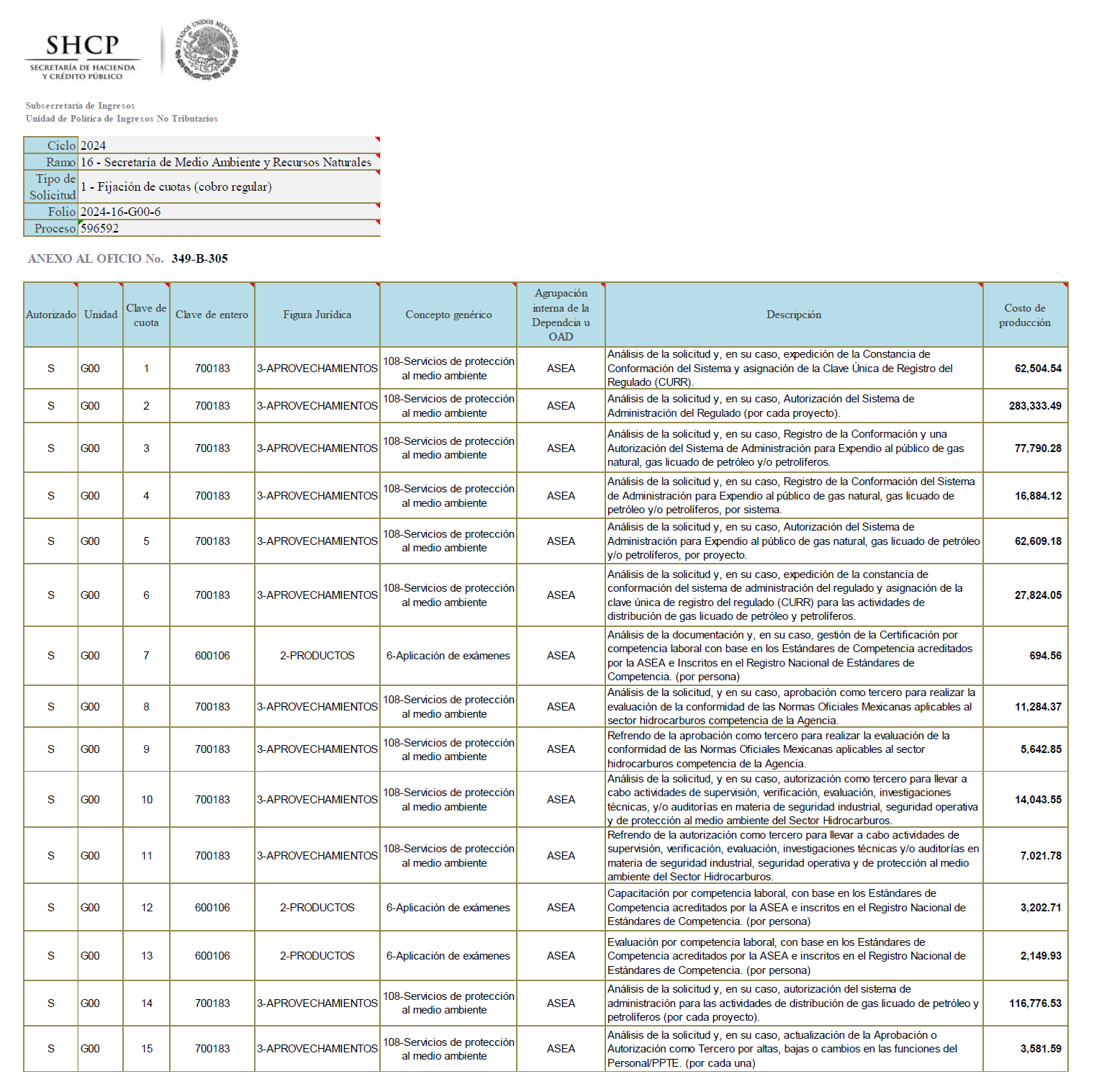 Sobre el particular, le informo que esta Secretaría con fundamento en los artículos 31, fracción XI de la Ley Orgánica de la Administración Pública Federal, 17, fracción XXI del Reglamento Interior de la Secretaría de Hacienda y Crédito Público en vigor, 3º del Código Fiscal de la Federación, 10 y 11 de la Ley de Ingresos de la Federación para el Ejercicio Fiscal de 2024, y considerando que los importes propuestos fueron determinados con base en el costo total del bien o servicio, de acuerdo con la información que se adjunta a la presente solicitud, autoriza a la Agencia Nacional de Seguridad industrial y de Protección al Medio Ambiente del Sector Hidrocarburos cobrar bajo la naturaleza jurídica de productos y aprovechamientos, 3 productos y 12 aprovechamientos que se describen en la tabla adjunta del folio citado.