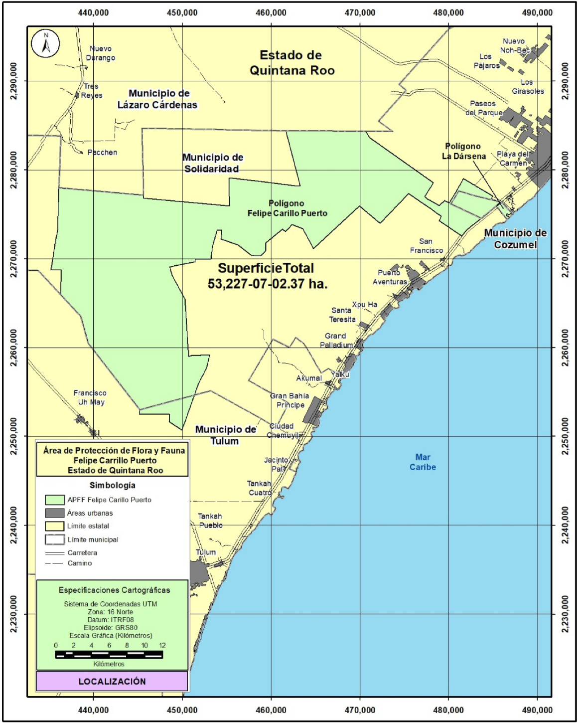 ARTÍCULO PRIMERO. Se declara área natural protegida, con la categoría de área de protección de flora y fauna al sitio Felipe Carrillo Puerto, que de acuerdo con el "Marco Geoestadístico, diciembre de 2023" del Instituto Nacional de Estadística y Geografía, se ubica en los municipios de Solidaridad, Tulum y Cozumel, en el estado de Quintana Roo, con una superficie total de 53,227-07-02.37 hectáreas (cincuenta y tres mil doscientas veintisiete hectáreas, siete áreas, dos punto treinta y siete centiáreas).