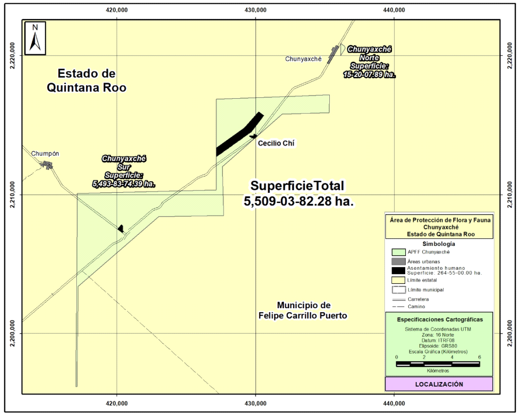 ARTÍCULO PRIMERO. Se declara área natural protegida, con la categoría de área de protección de flora y fauna al sitio Chunyaxché, que de acuerdo con el "Marco Geoestadístico, diciembre de 2023" del Instituto Nacional de Estadística y Geografía, se ubica en el municipio de Felipe Carrillo Puerto, en el estado de Quintana Roo, con una superficie total de 5,509-03-82.28 hectáreas (cinco mil quinientas nueve hectáreas, tres áreas, ochenta y dos punto veintiocho centiáreas).
