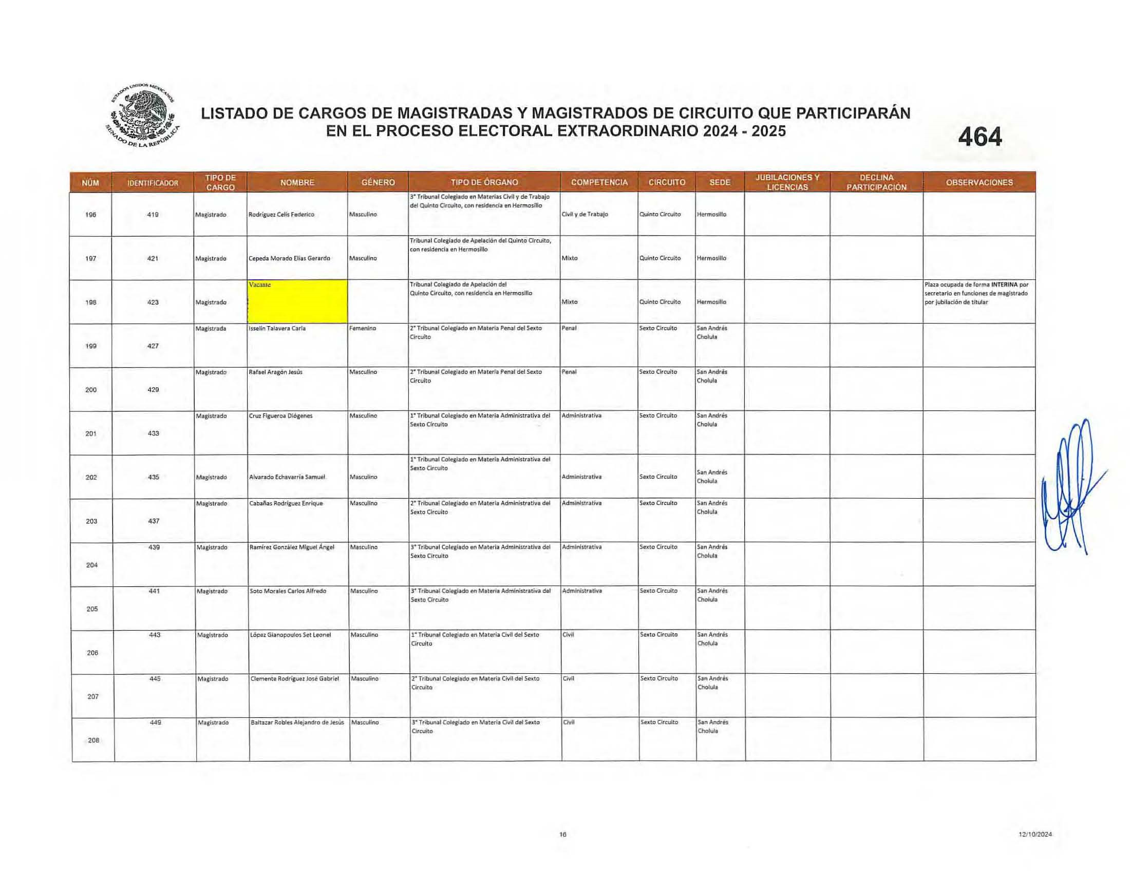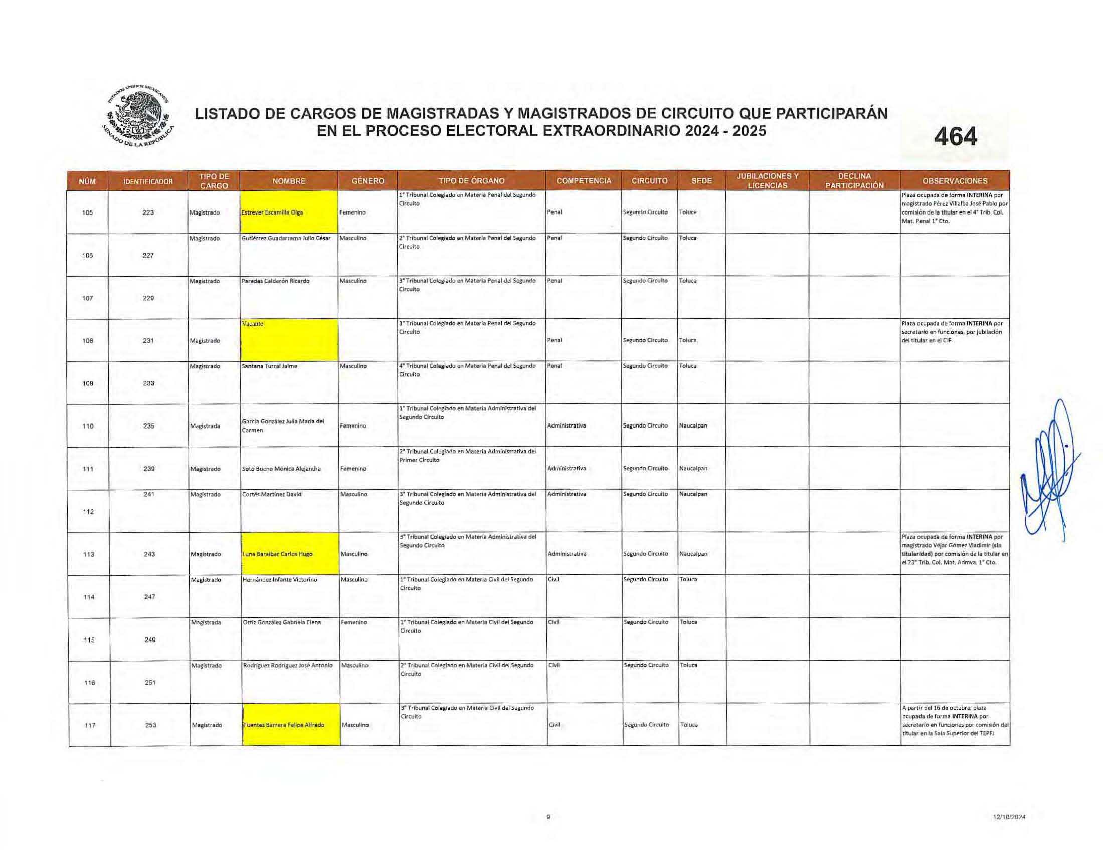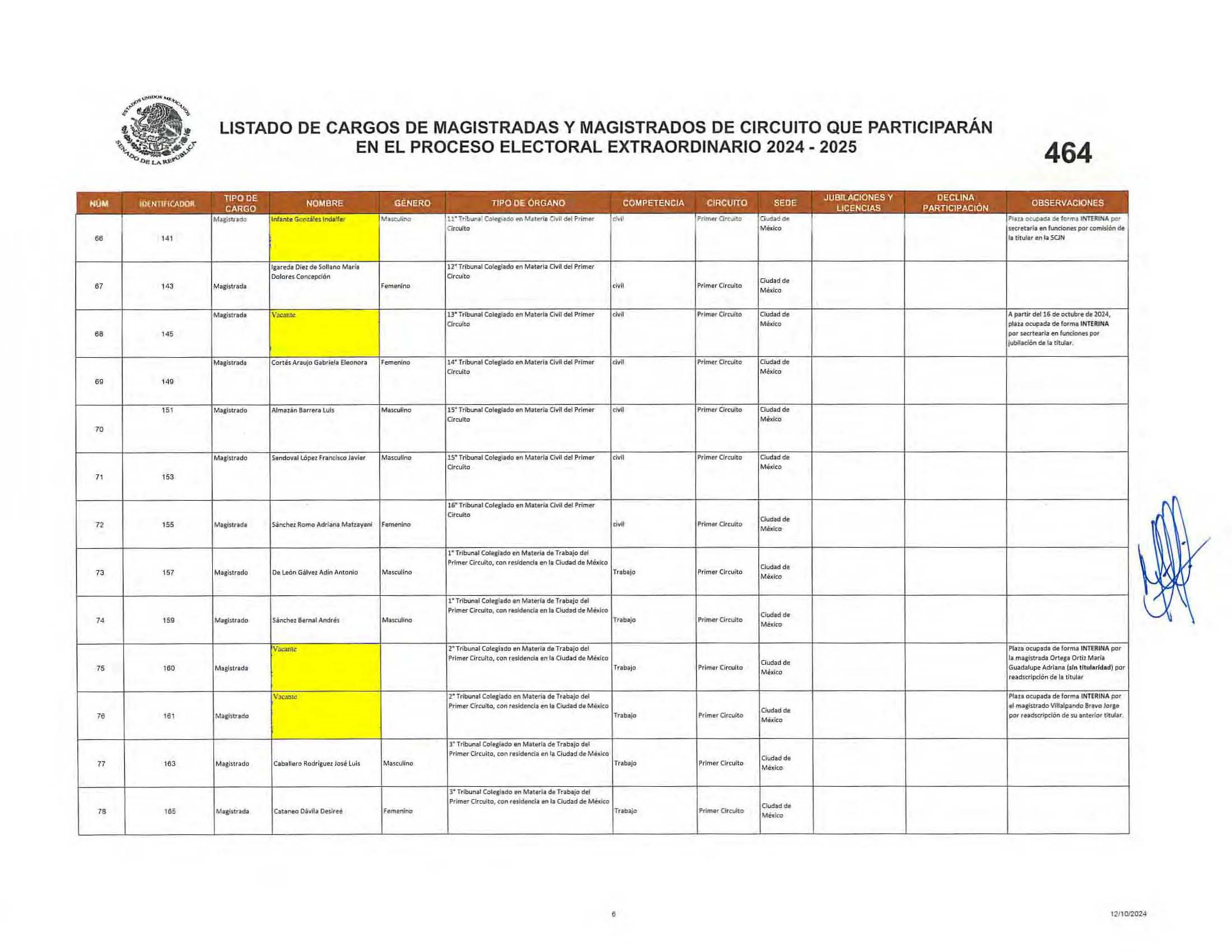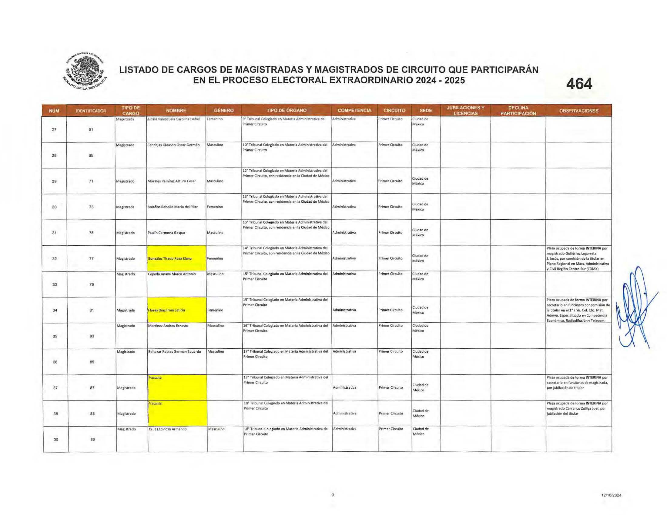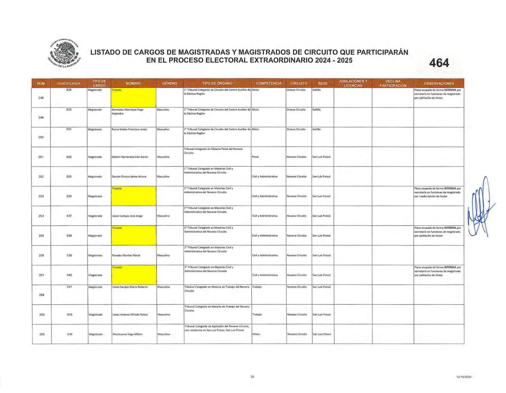 Noveno. El Presidente de la Mesa Directiva del Senado de la República, con fecha 19 de septiembre del año en curso, solicitó al Consejo de la Judicatura Federal (CJF) el listado con la totalidad de cargos de personas juzgadoras y este, en obsequio y también en acatamiento a lo previsto por el artículo segundo transitorio, párrafo cuarto, inciso a), del Decreto, remitió al Senado de la República, que lo recibió el 10 de octubre corriente, el listado con la totalidad de cargos de personas juzgadoras, indicando su circuito judicial, especialización por materia, género, vacancias por renuncia, jubilaciones y retiros programados, y la demás información que se requirió.