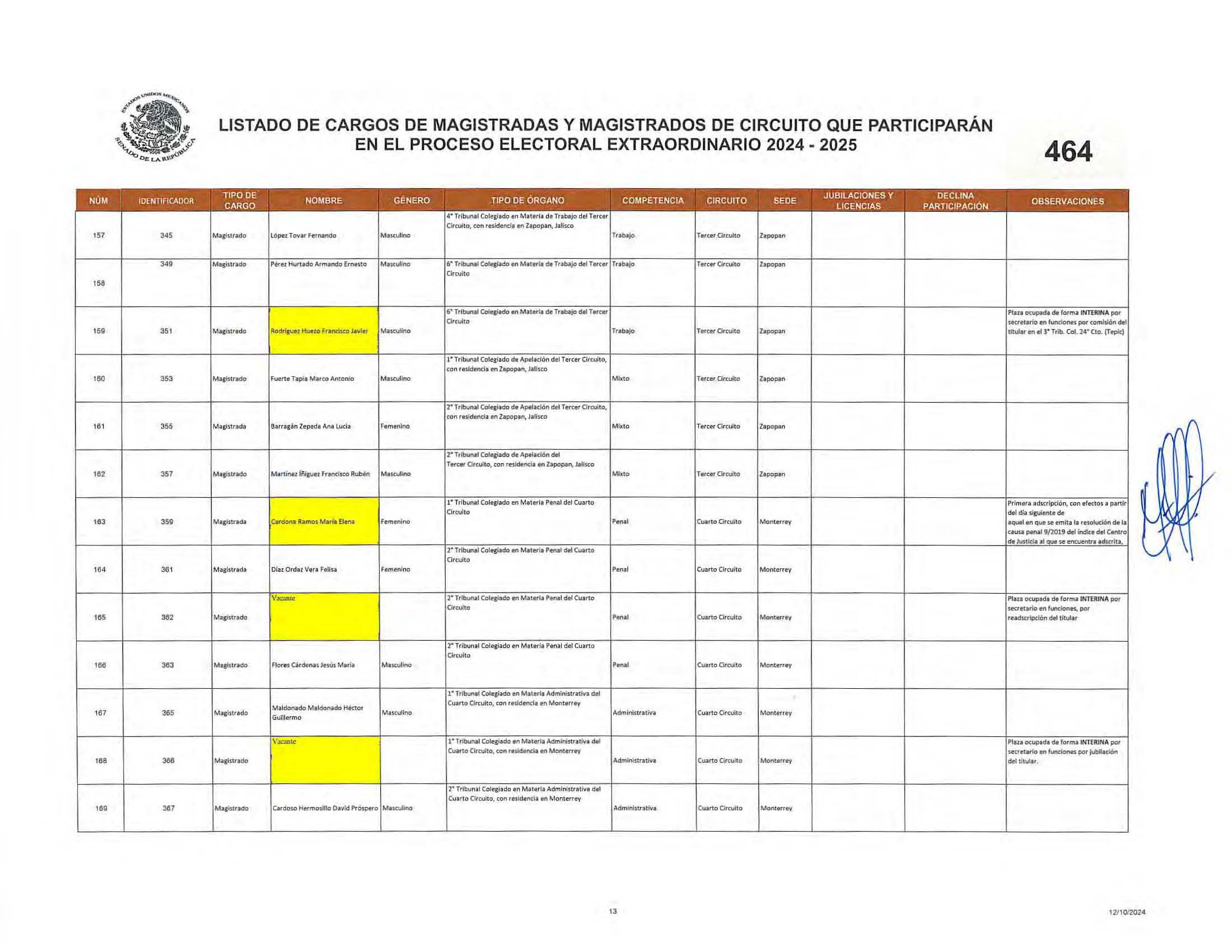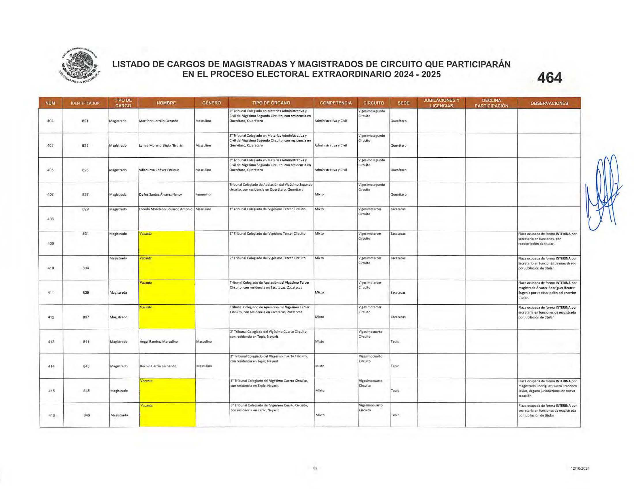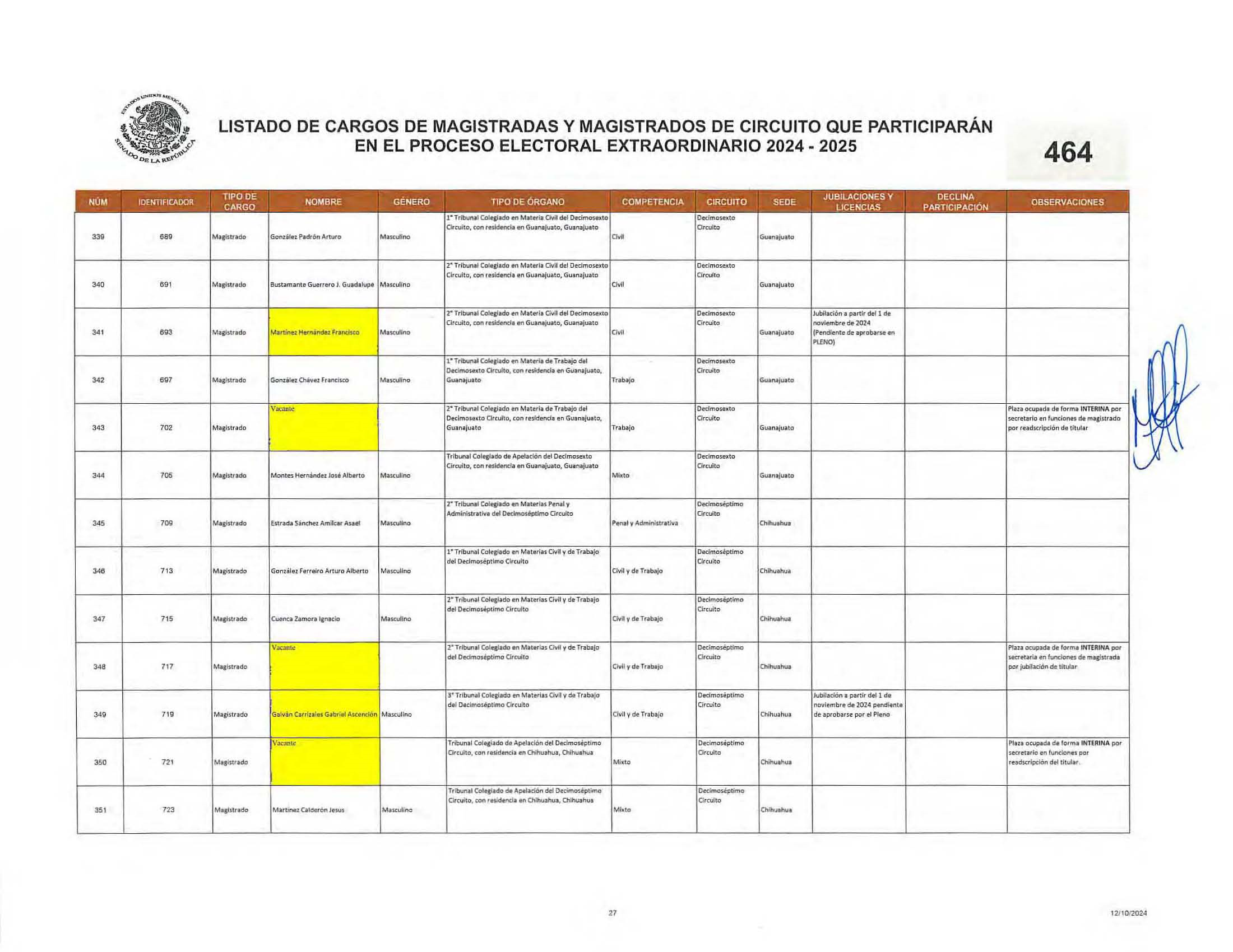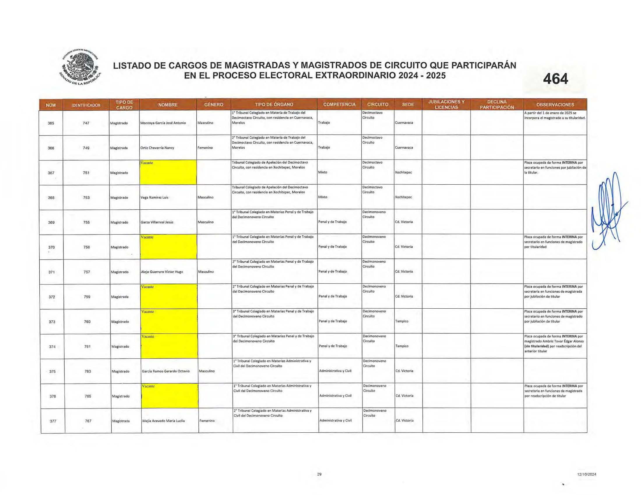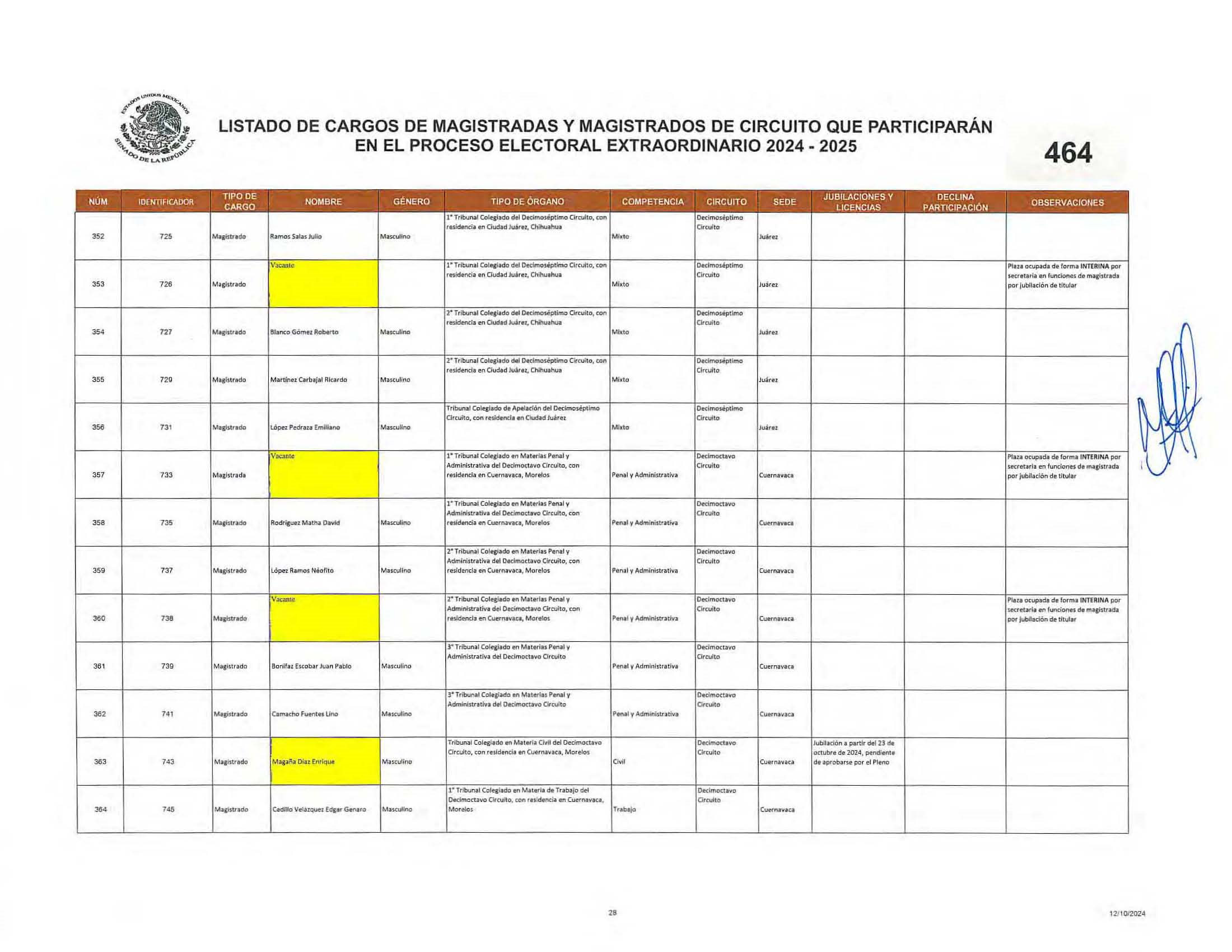 Noveno. El Presidente de la Mesa Directiva del Senado de la República, con fecha 19 de septiembre del año en curso, solicitó al Consejo de la Judicatura Federal (CJF) el listado con la totalidad de cargos de personas juzgadoras y este, en obsequio y también en acatamiento a lo previsto por el artículo segundo transitorio, párrafo cuarto, inciso a), del Decreto, remitió al Senado de la República, que lo recibió el 10 de octubre corriente, el listado con la totalidad de cargos de personas juzgadoras, indicando su circuito judicial, especialización por materia, género, vacancias por renuncia, jubilaciones y retiros programados, y la demás información que se requirió.