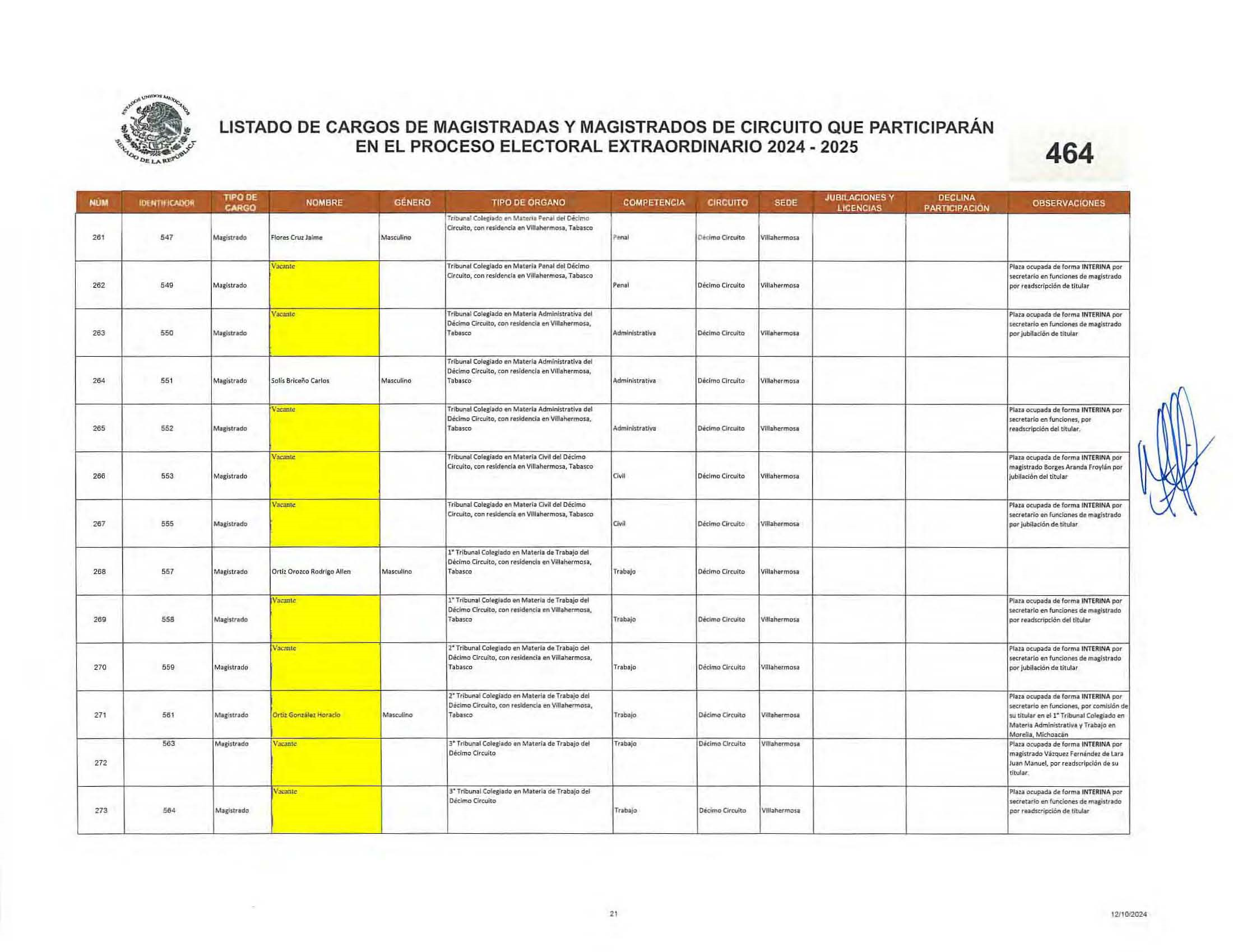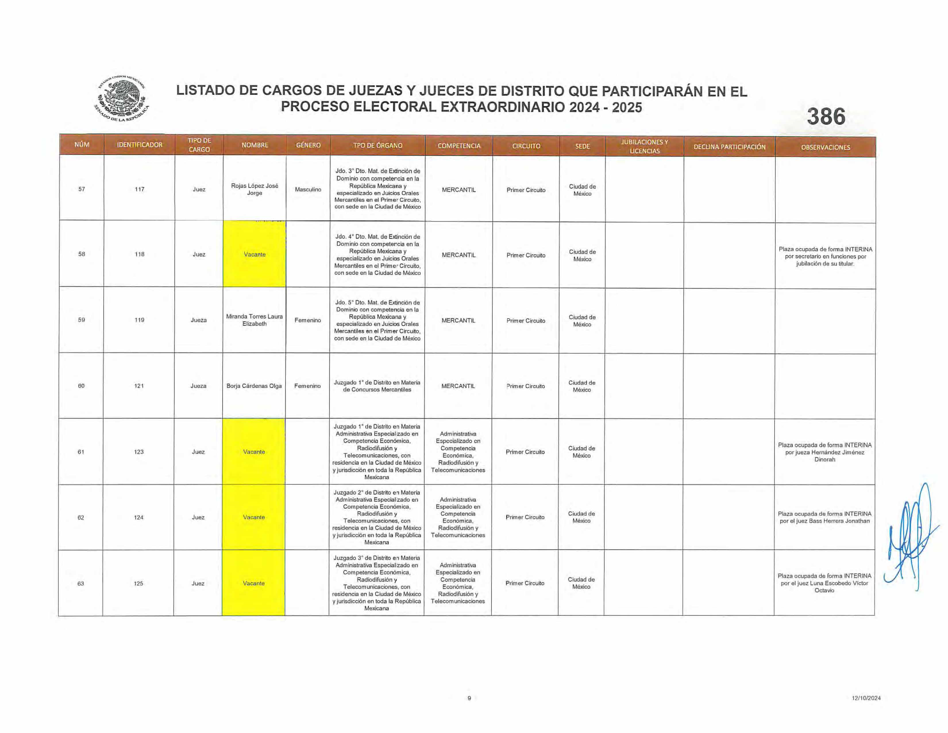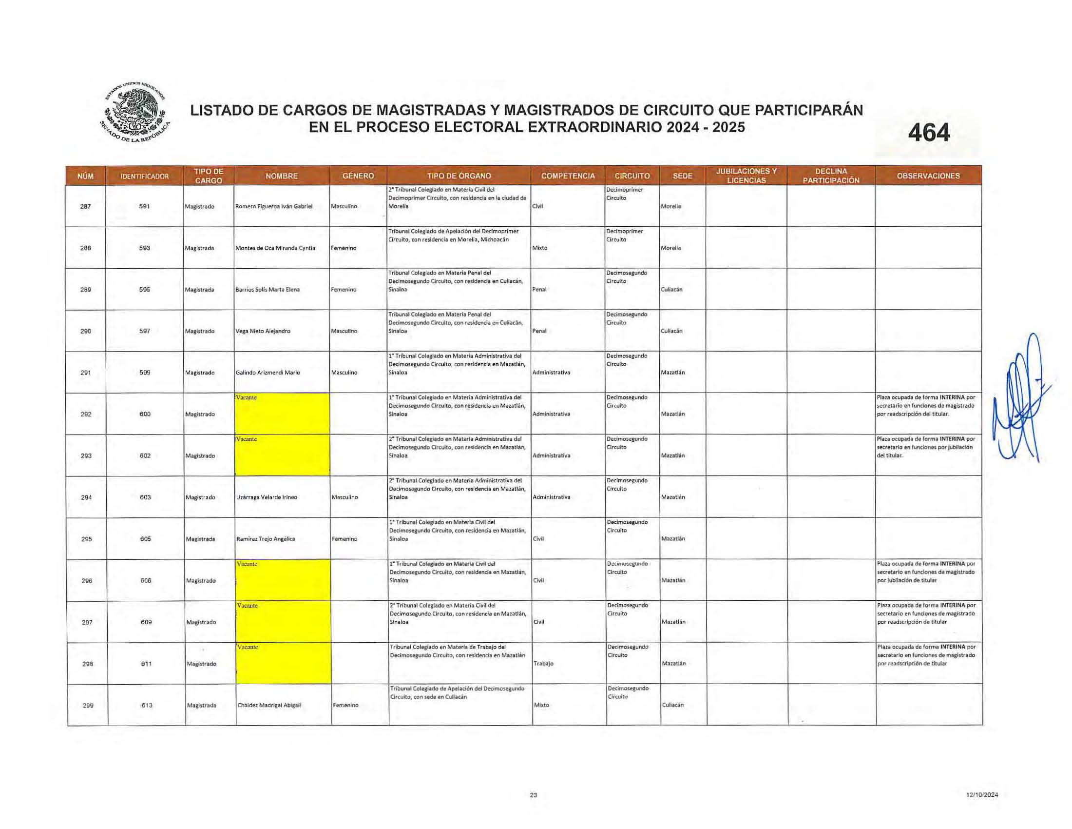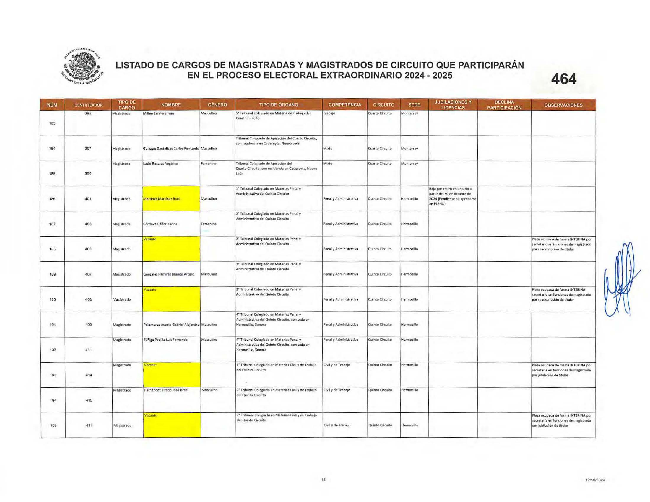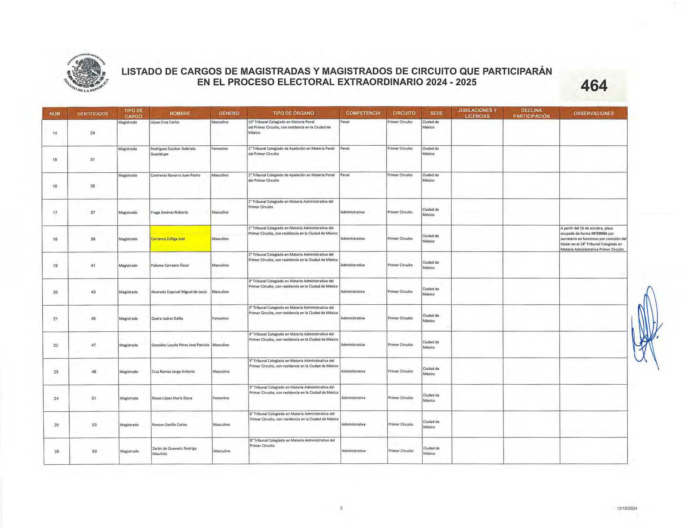 Noveno. El Presidente de la Mesa Directiva del Senado de la República, con fecha 19 de septiembre del año en curso, solicitó al Consejo de la Judicatura Federal (CJF) el listado con la totalidad de cargos de personas juzgadoras y este, en obsequio y también en acatamiento a lo previsto por el artículo segundo transitorio, párrafo cuarto, inciso a), del Decreto, remitió al Senado de la República, que lo recibió el 10 de octubre corriente, el listado con la totalidad de cargos de personas juzgadoras, indicando su circuito judicial, especialización por materia, género, vacancias por renuncia, jubilaciones y retiros programados, y la demás información que se requirió.