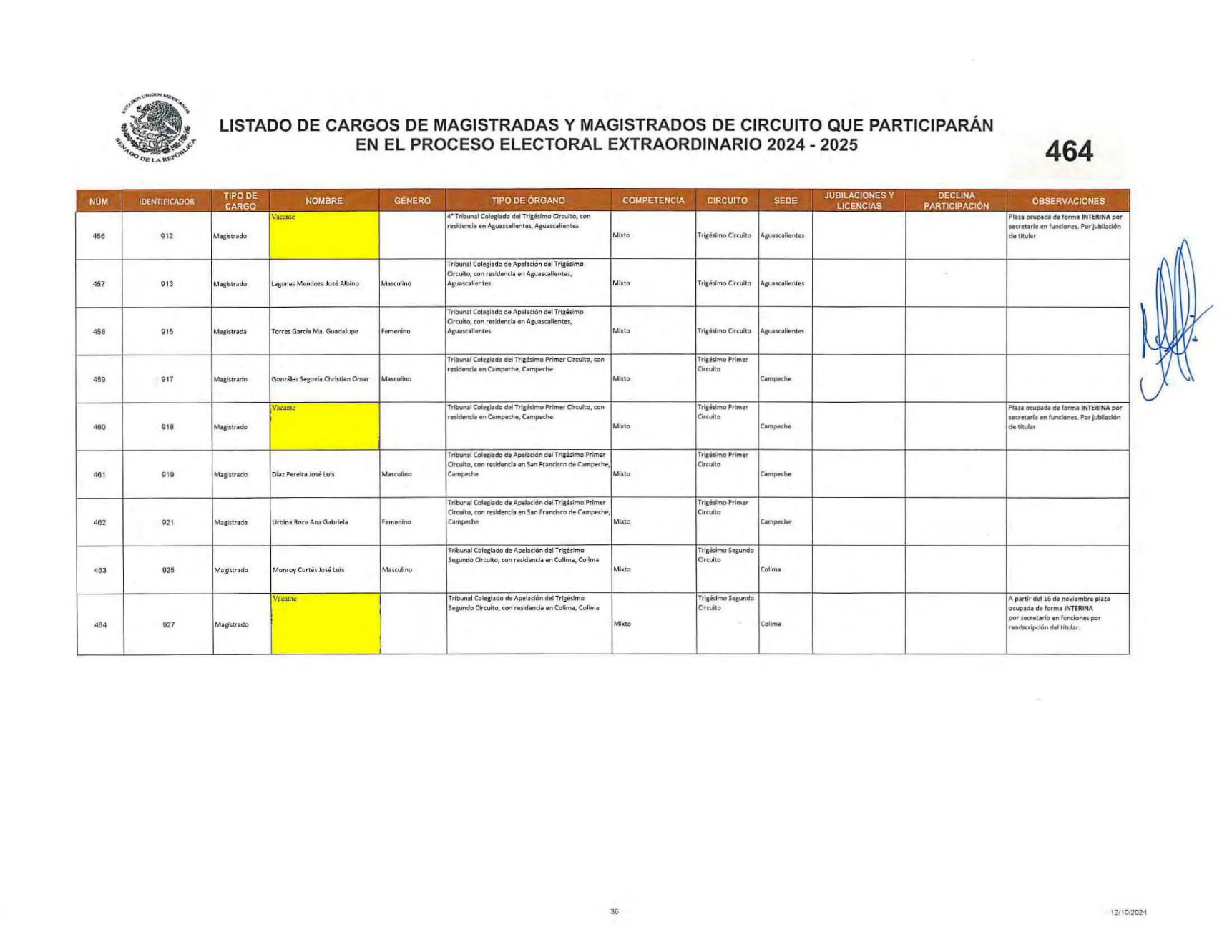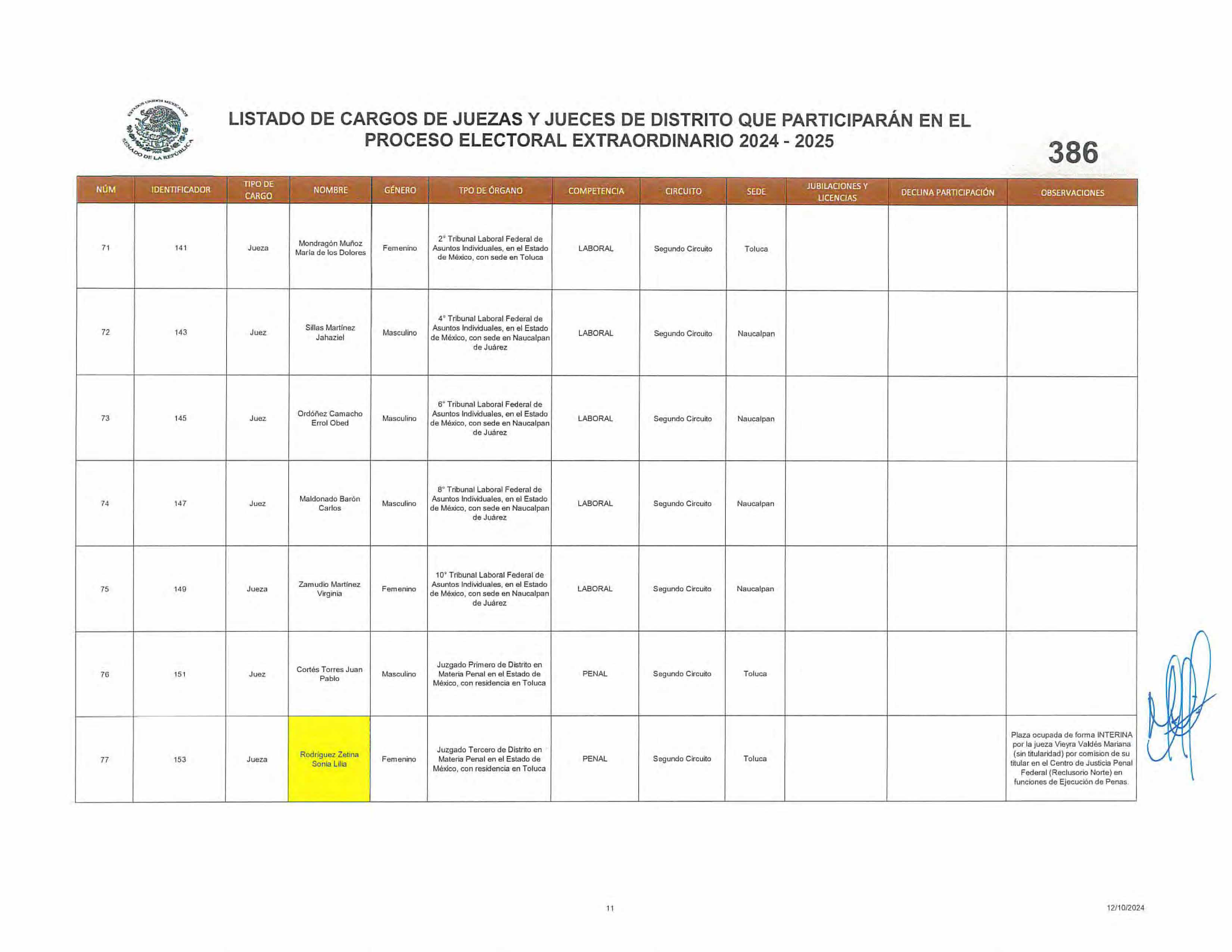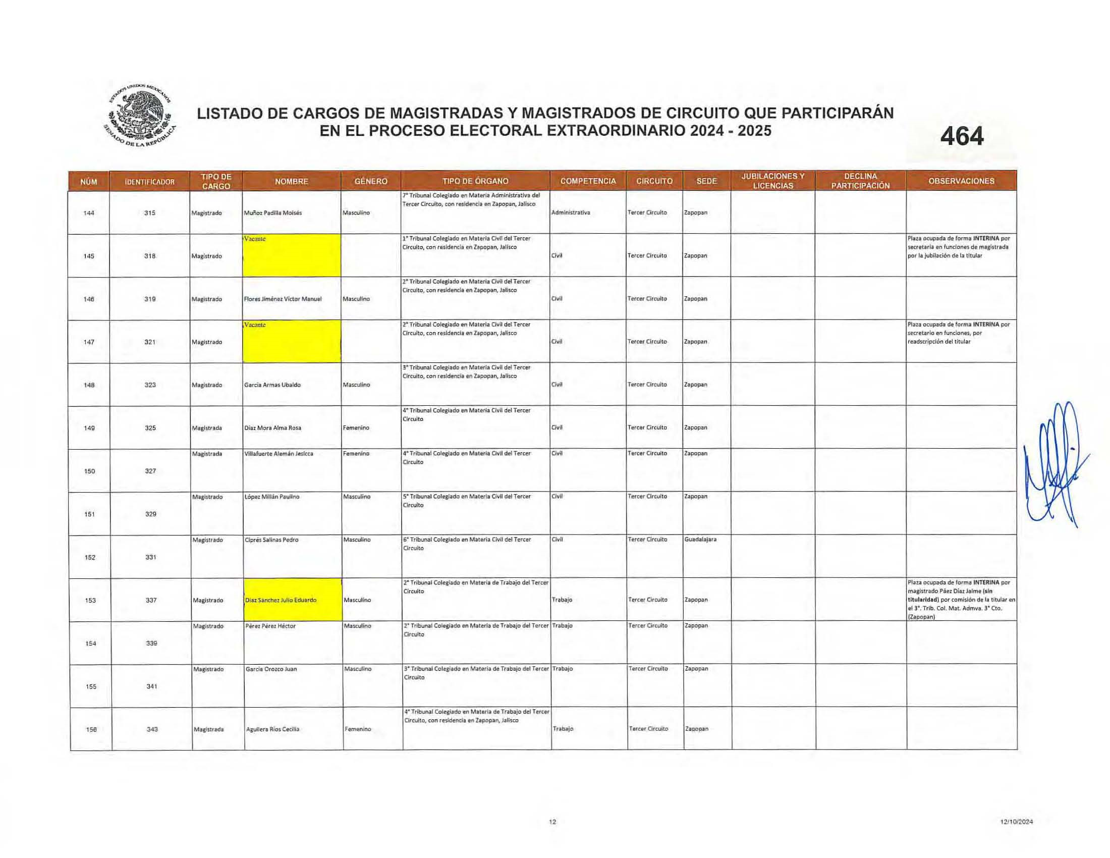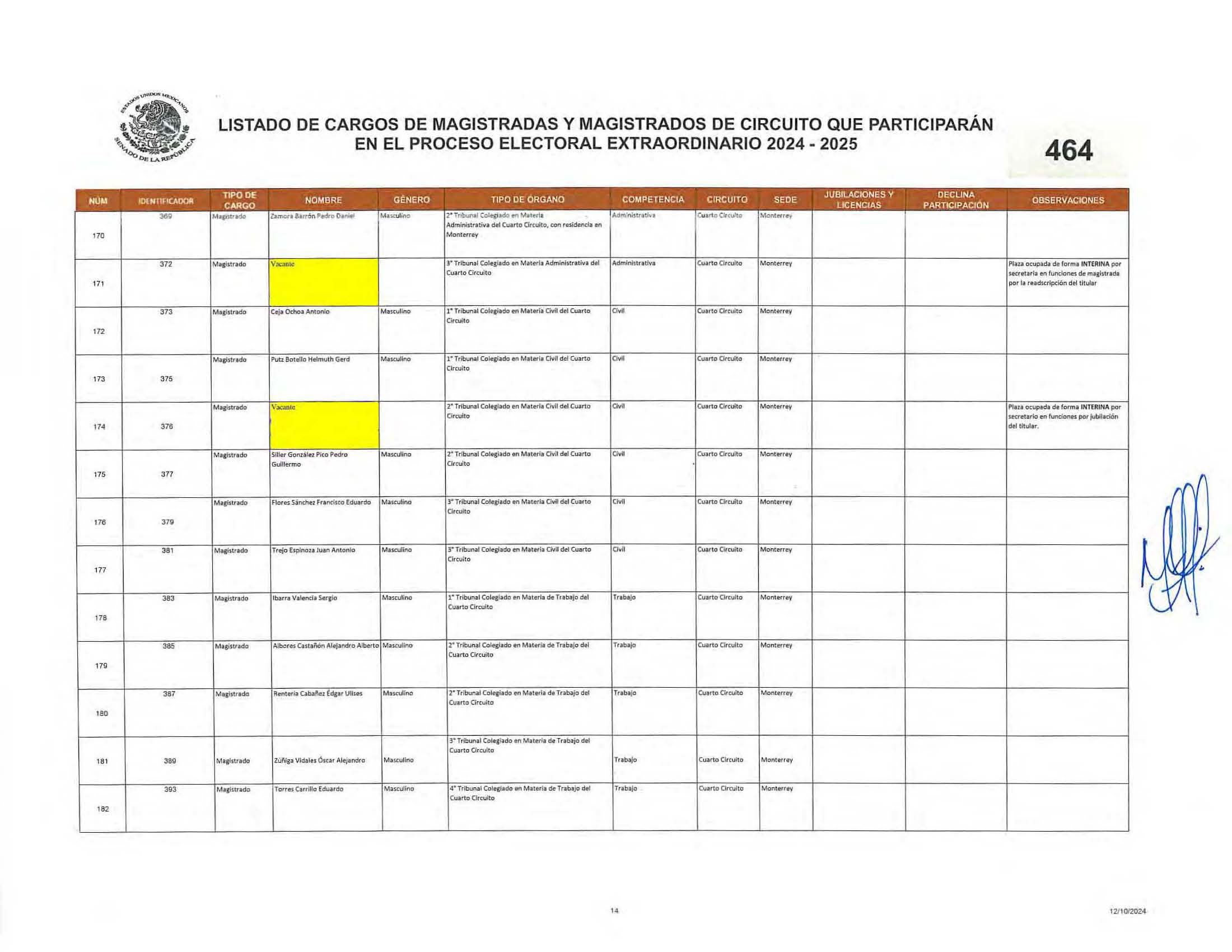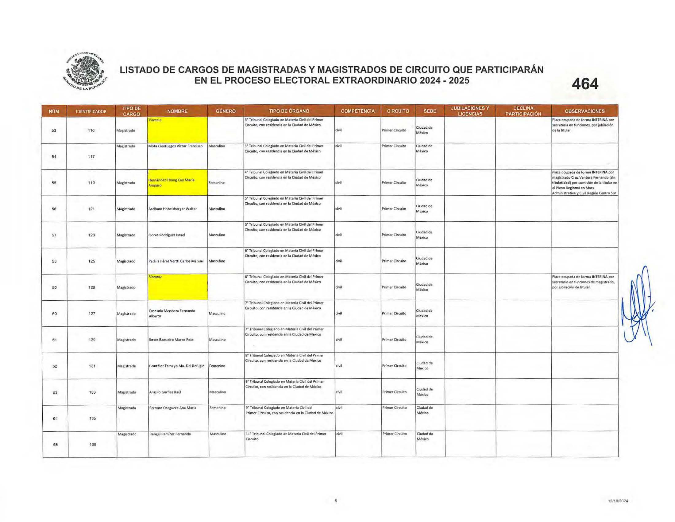 Noveno. El Presidente de la Mesa Directiva del Senado de la República, con fecha 19 de septiembre del año en curso, solicitó al Consejo de la Judicatura Federal (CJF) el listado con la totalidad de cargos de personas juzgadoras y este, en obsequio y también en acatamiento a lo previsto por el artículo segundo transitorio, párrafo cuarto, inciso a), del Decreto, remitió al Senado de la República, que lo recibió el 10 de octubre corriente, el listado con la totalidad de cargos de personas juzgadoras, indicando su circuito judicial, especialización por materia, género, vacancias por renuncia, jubilaciones y retiros programados, y la demás información que se requirió.