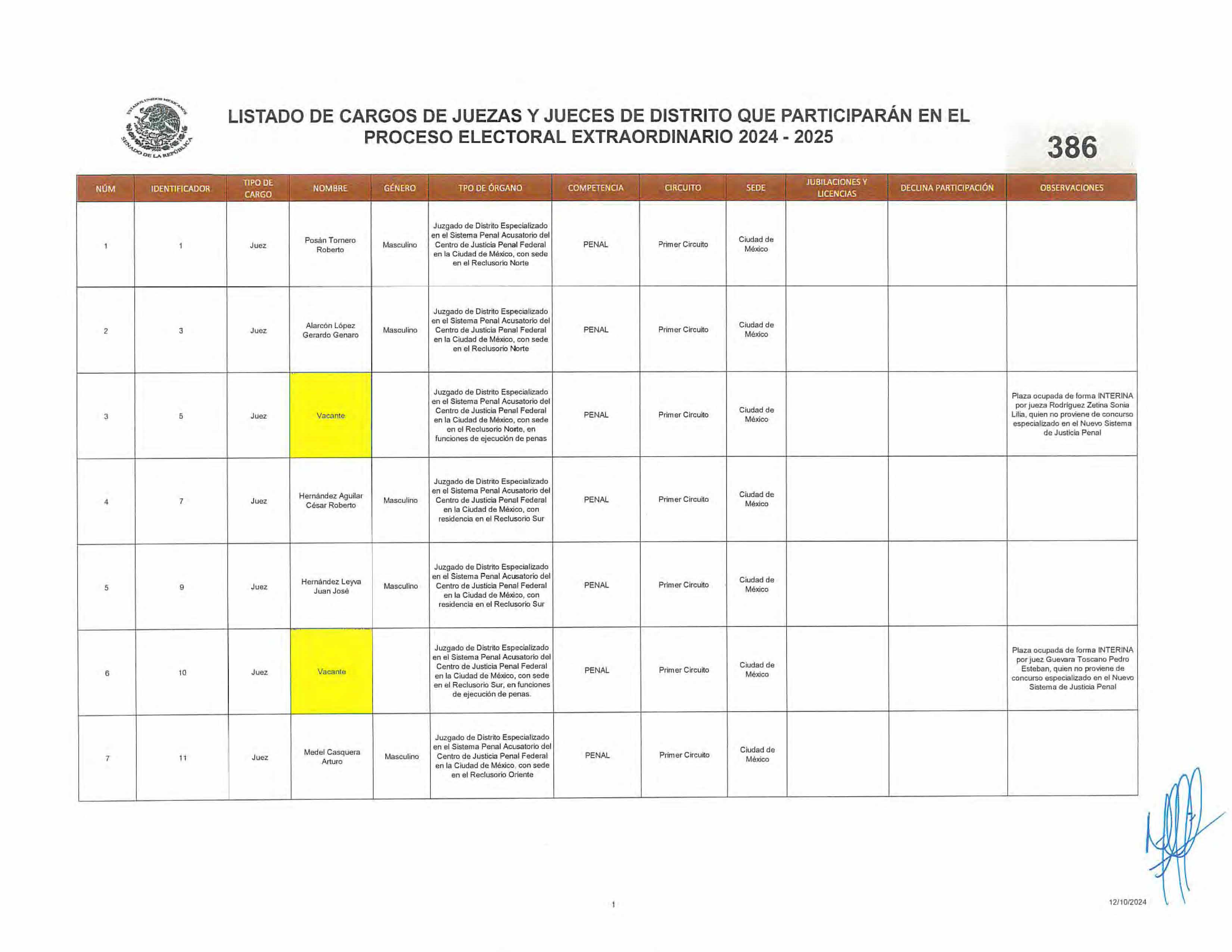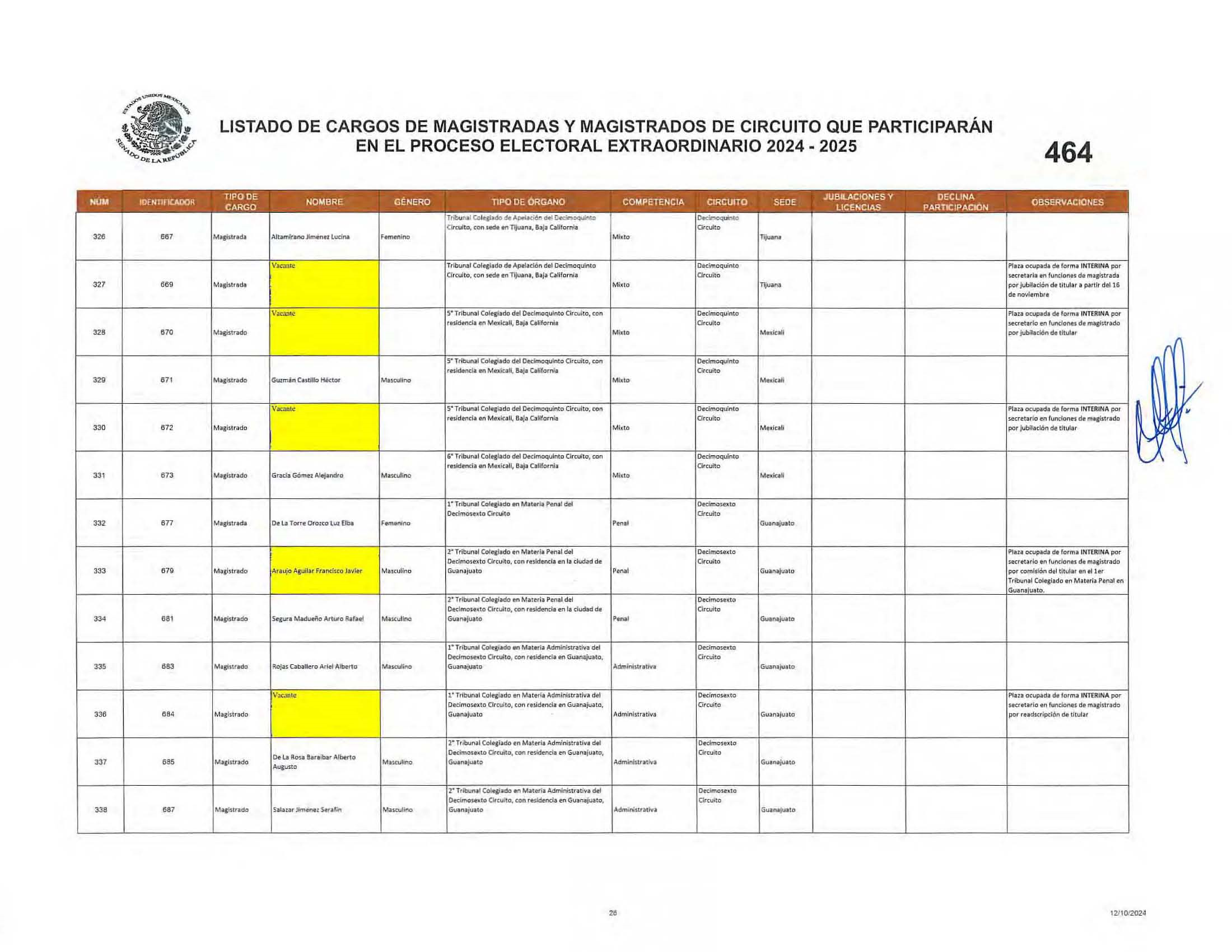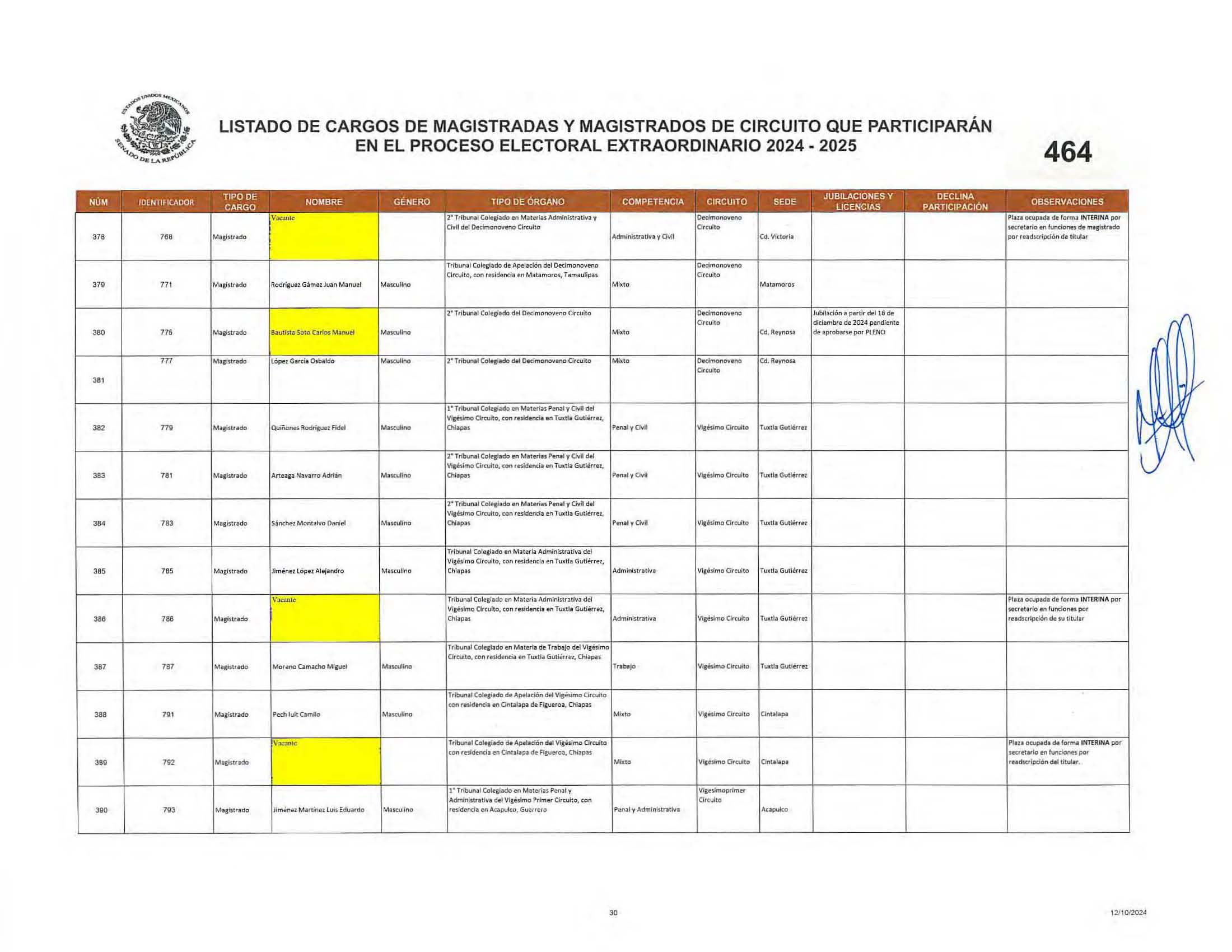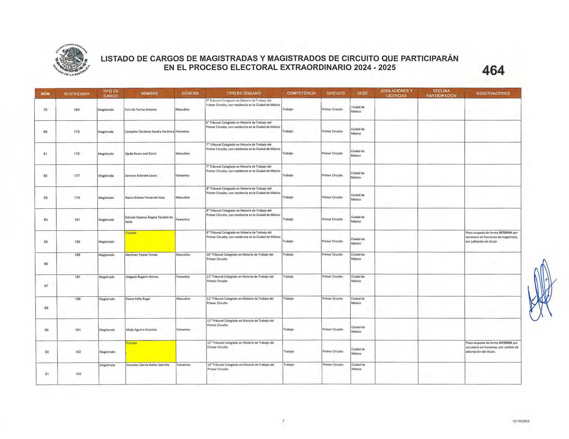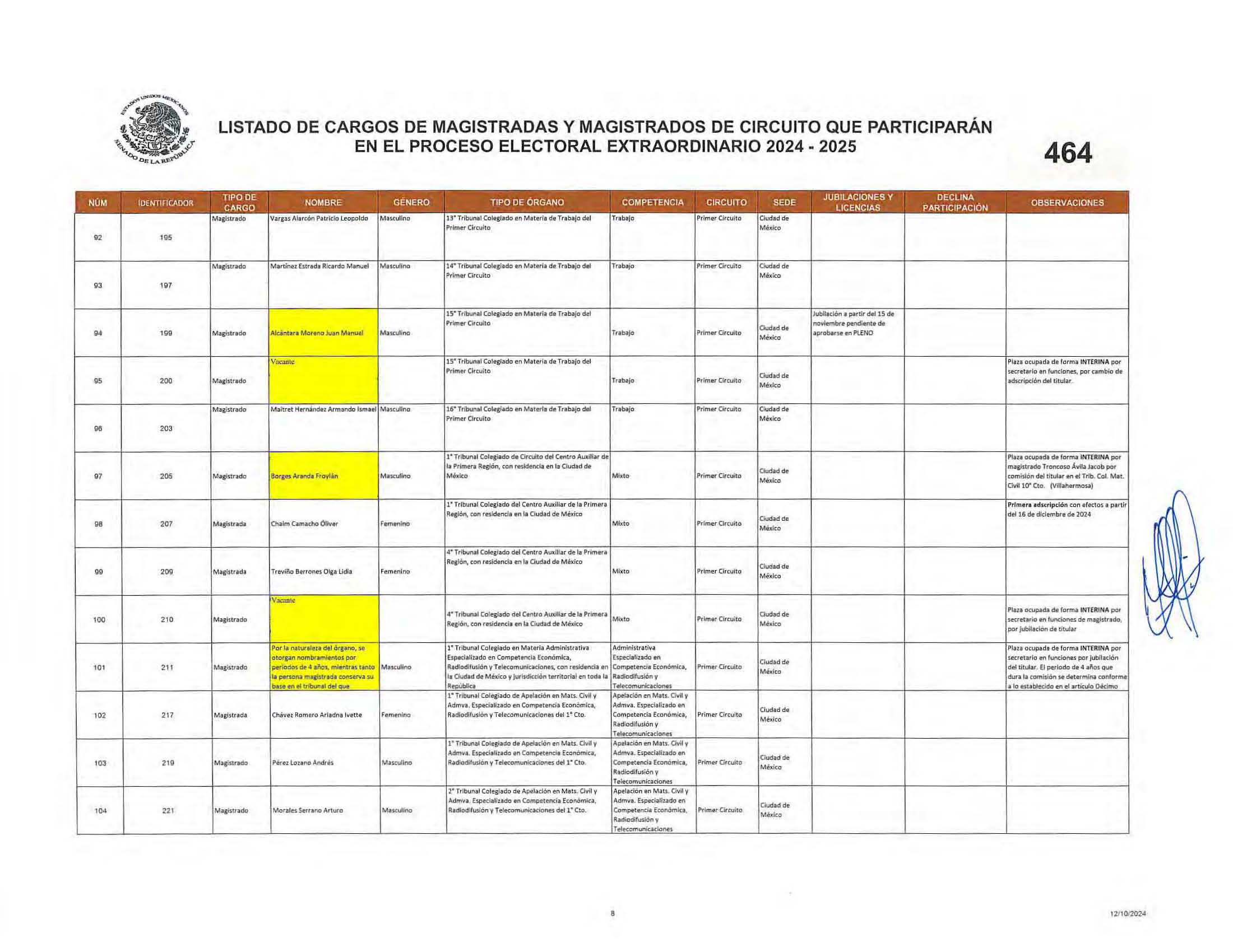 Noveno. El Presidente de la Mesa Directiva del Senado de la República, con fecha 19 de septiembre del año en curso, solicitó al Consejo de la Judicatura Federal (CJF) el listado con la totalidad de cargos de personas juzgadoras y este, en obsequio y también en acatamiento a lo previsto por el artículo segundo transitorio, párrafo cuarto, inciso a), del Decreto, remitió al Senado de la República, que lo recibió el 10 de octubre corriente, el listado con la totalidad de cargos de personas juzgadoras, indicando su circuito judicial, especialización por materia, género, vacancias por renuncia, jubilaciones y retiros programados, y la demás información que se requirió.