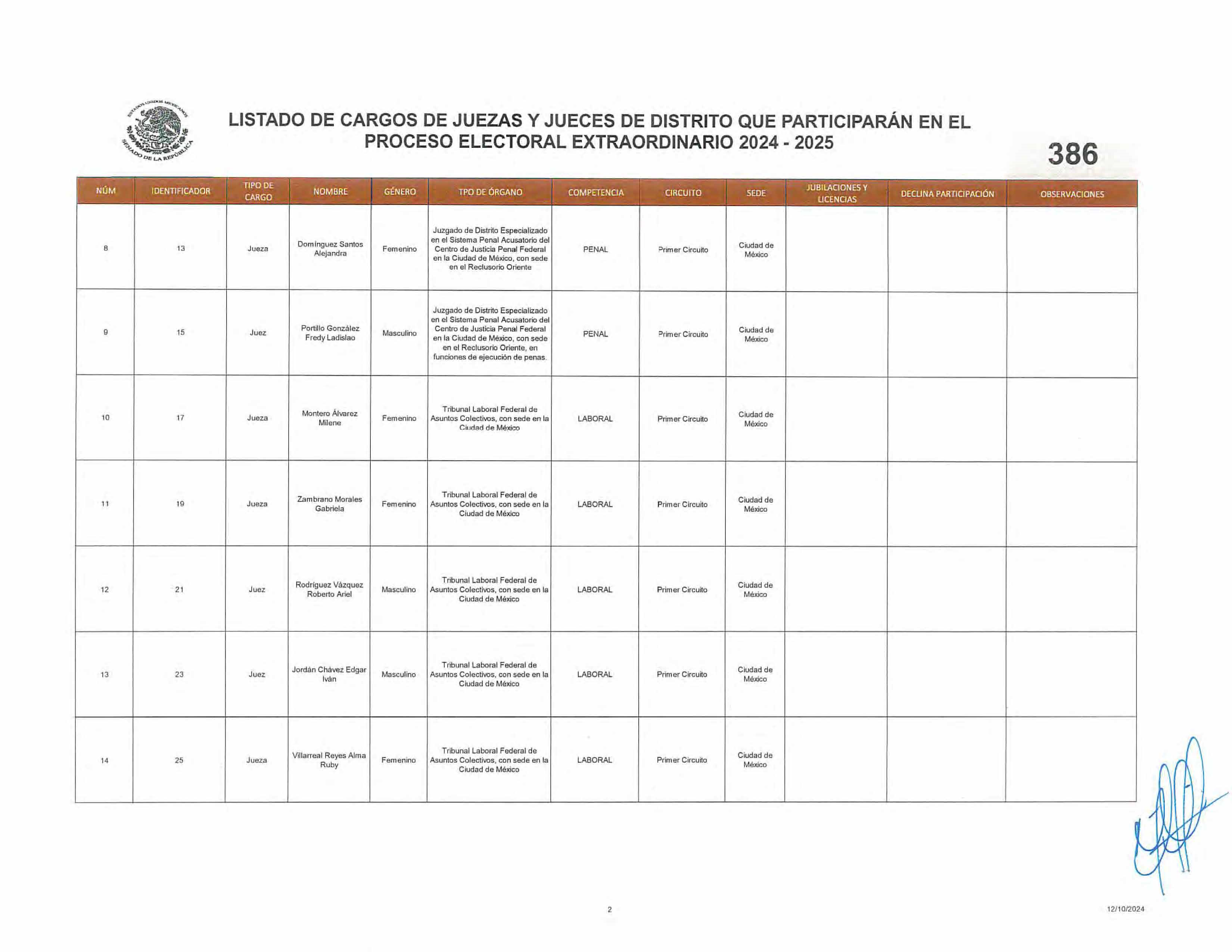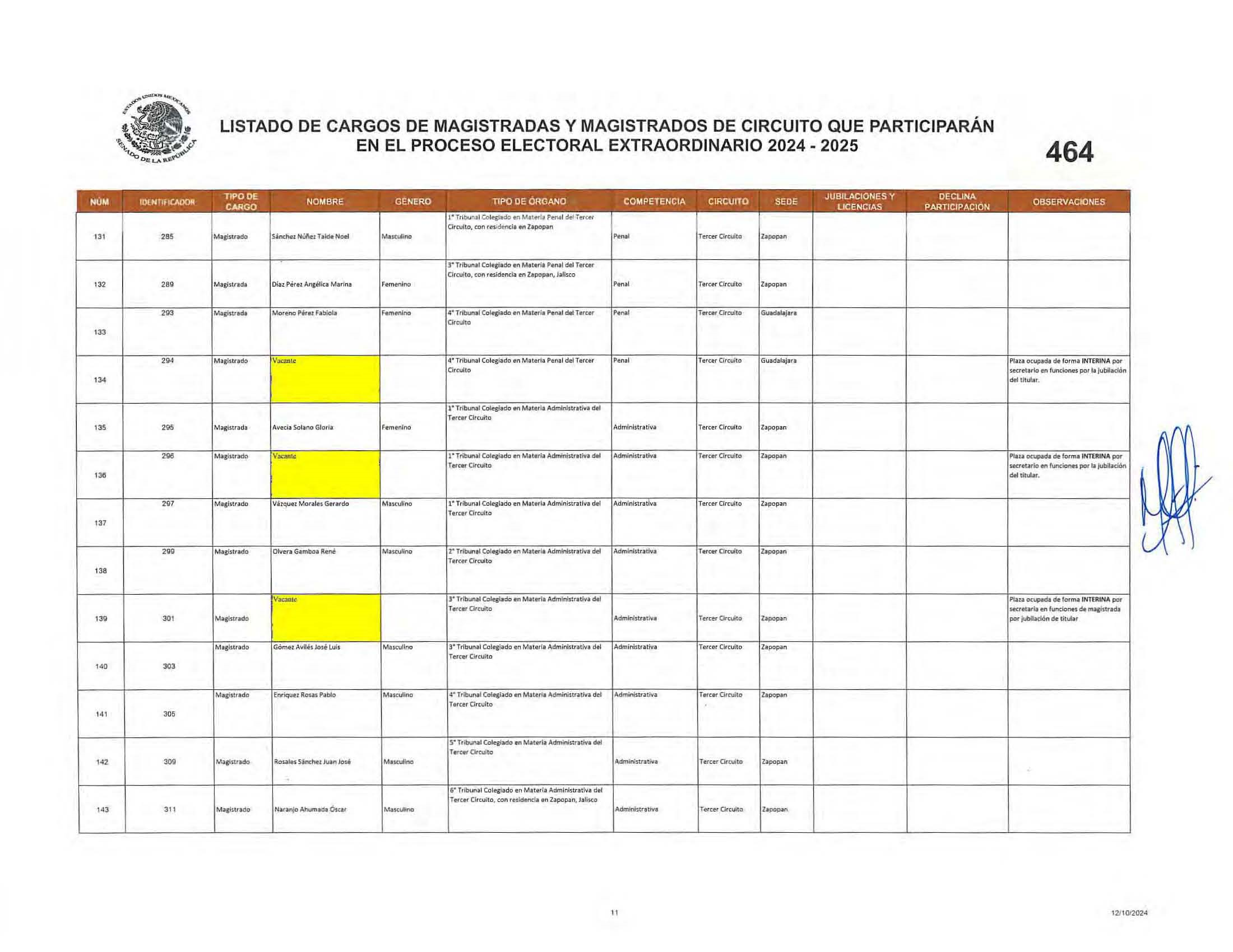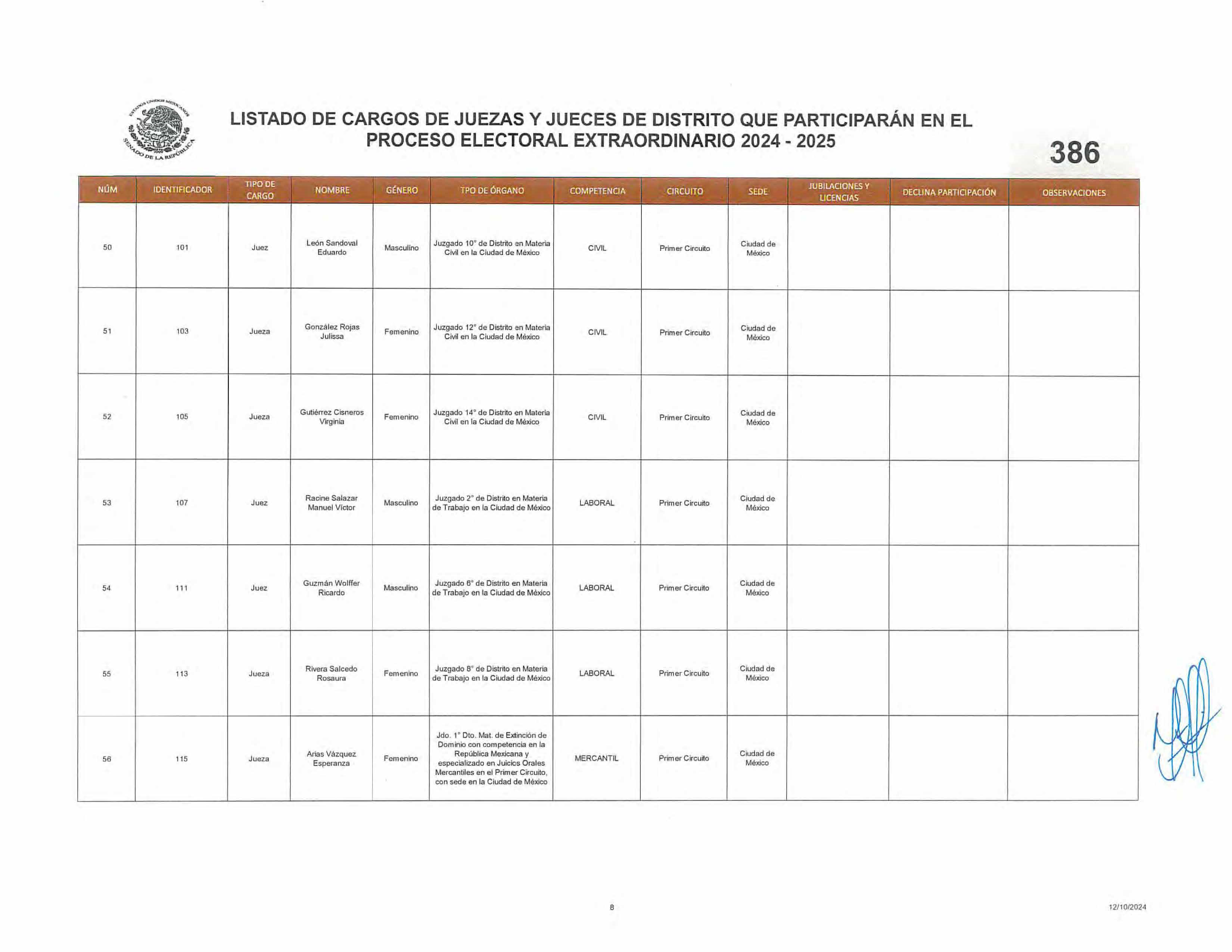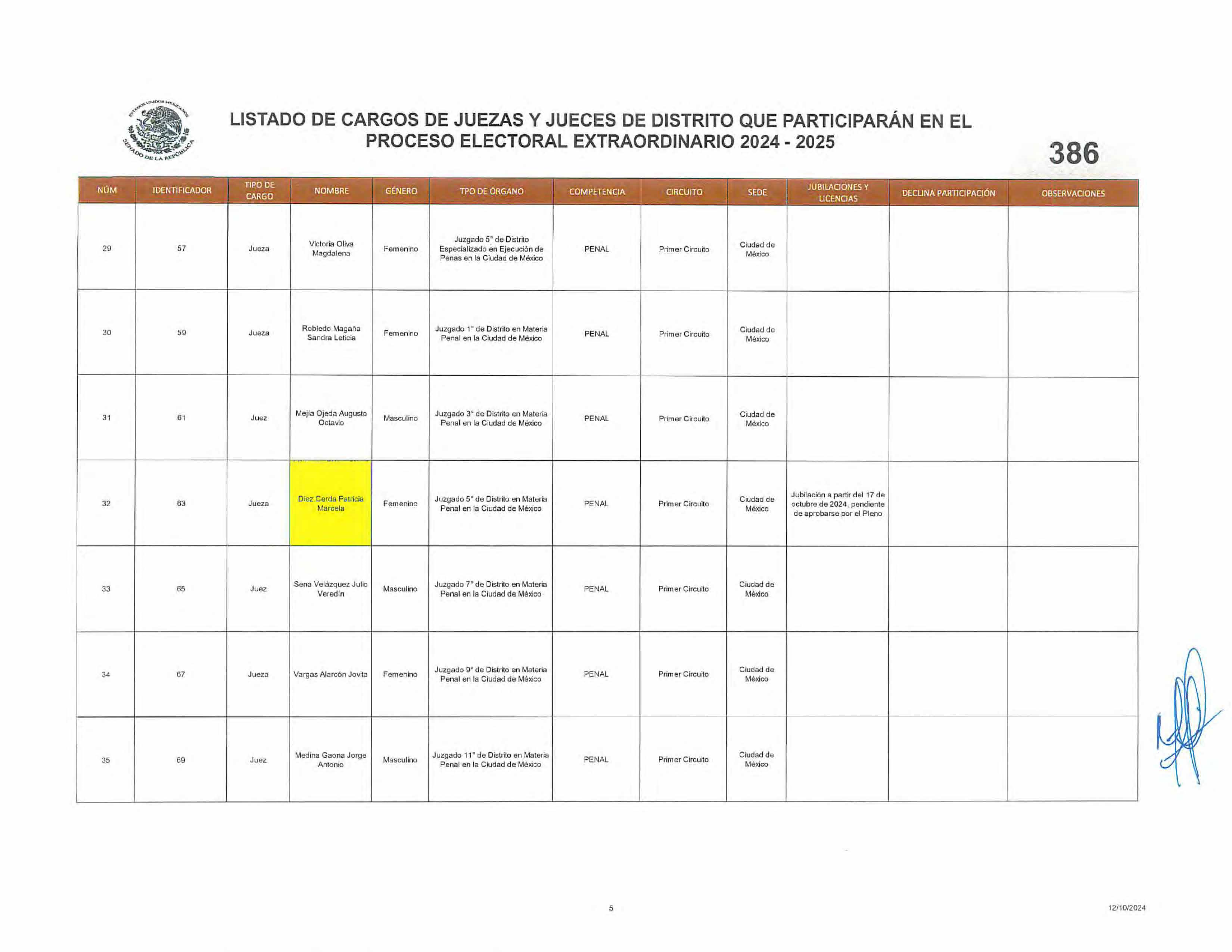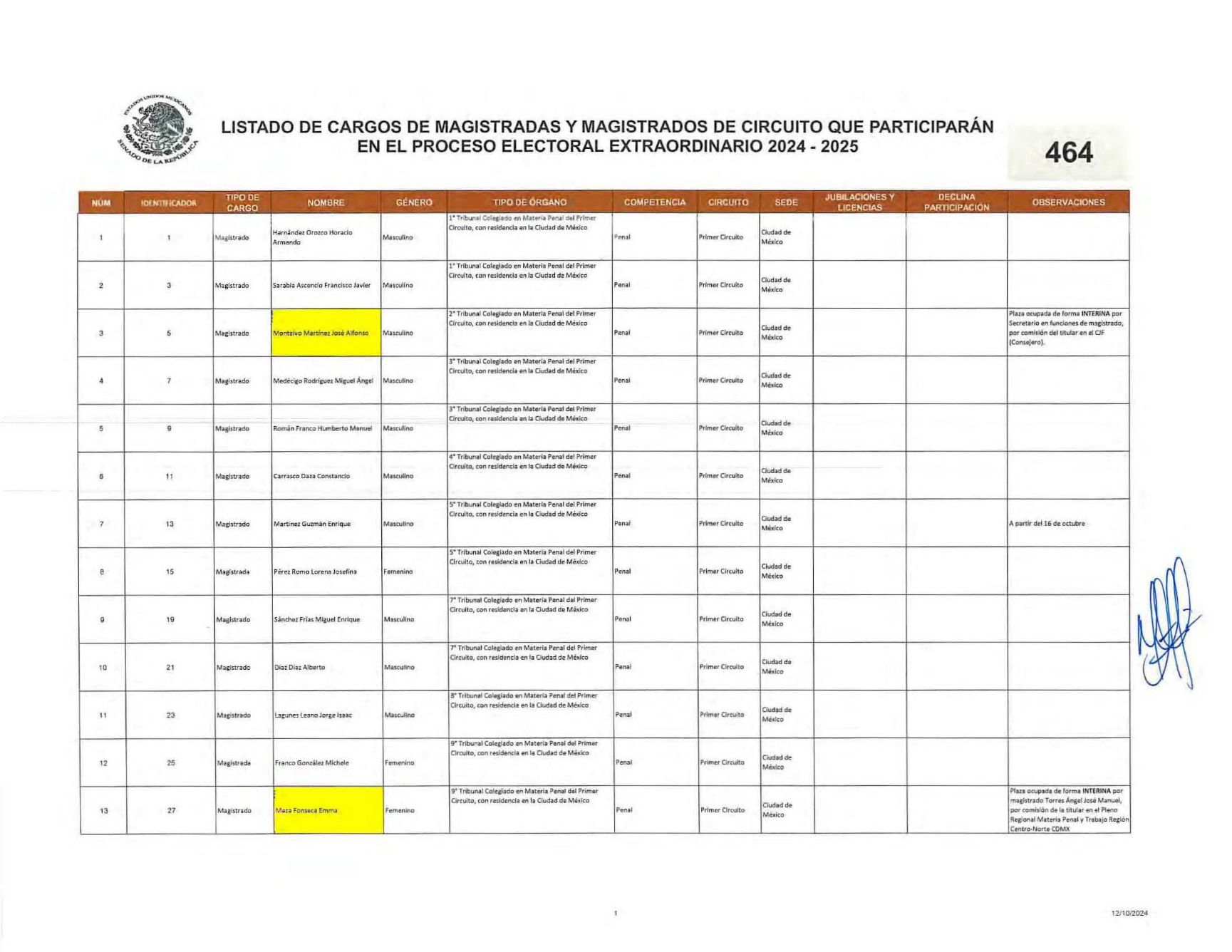 Noveno. El Presidente de la Mesa Directiva del Senado de la República, con fecha 19 de septiembre del año en curso, solicitó al Consejo de la Judicatura Federal (CJF) el listado con la totalidad de cargos de personas juzgadoras y este, en obsequio y también en acatamiento a lo previsto por el artículo segundo transitorio, párrafo cuarto, inciso a), del Decreto, remitió al Senado de la República, que lo recibió el 10 de octubre corriente, el listado con la totalidad de cargos de personas juzgadoras, indicando su circuito judicial, especialización por materia, género, vacancias por renuncia, jubilaciones y retiros programados, y la demás información que se requirió.