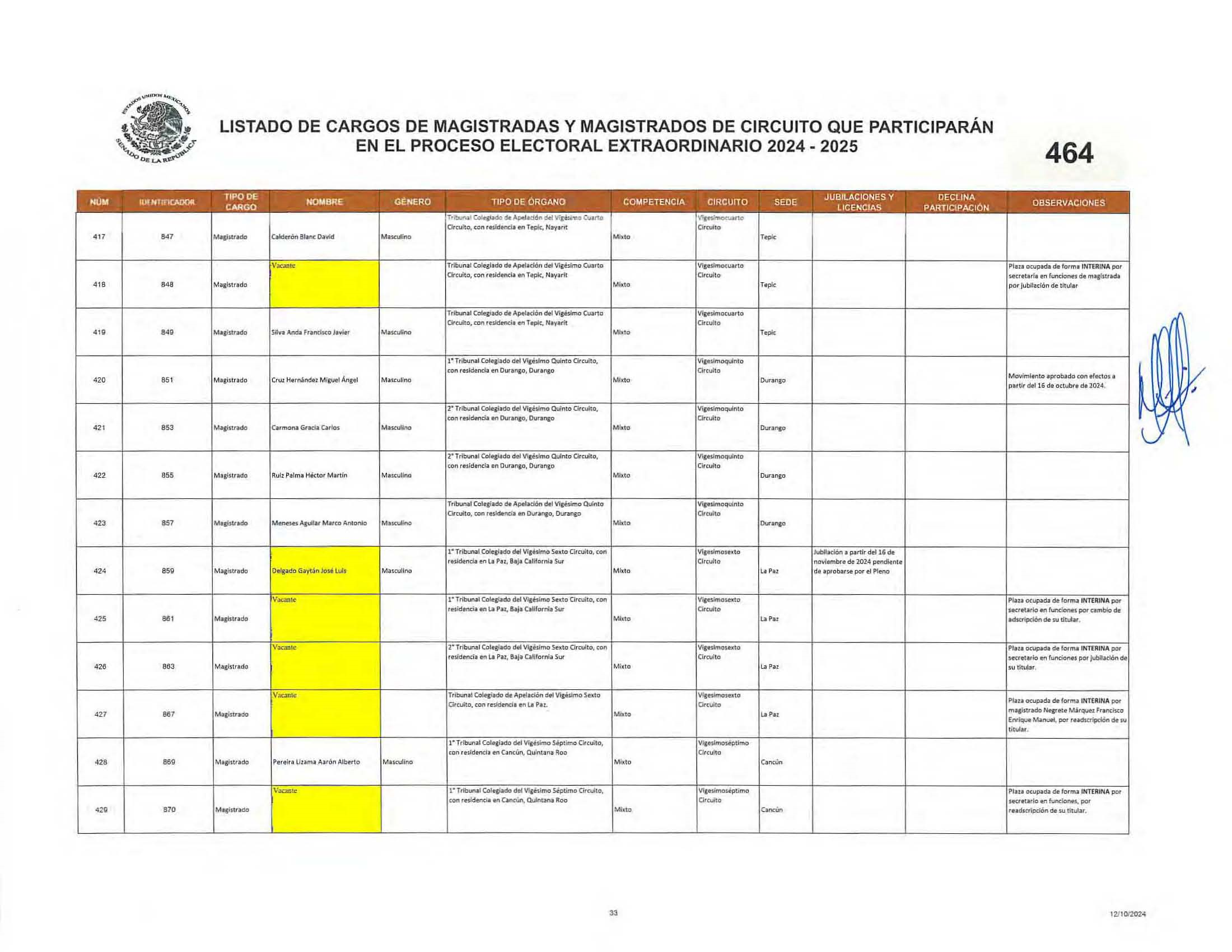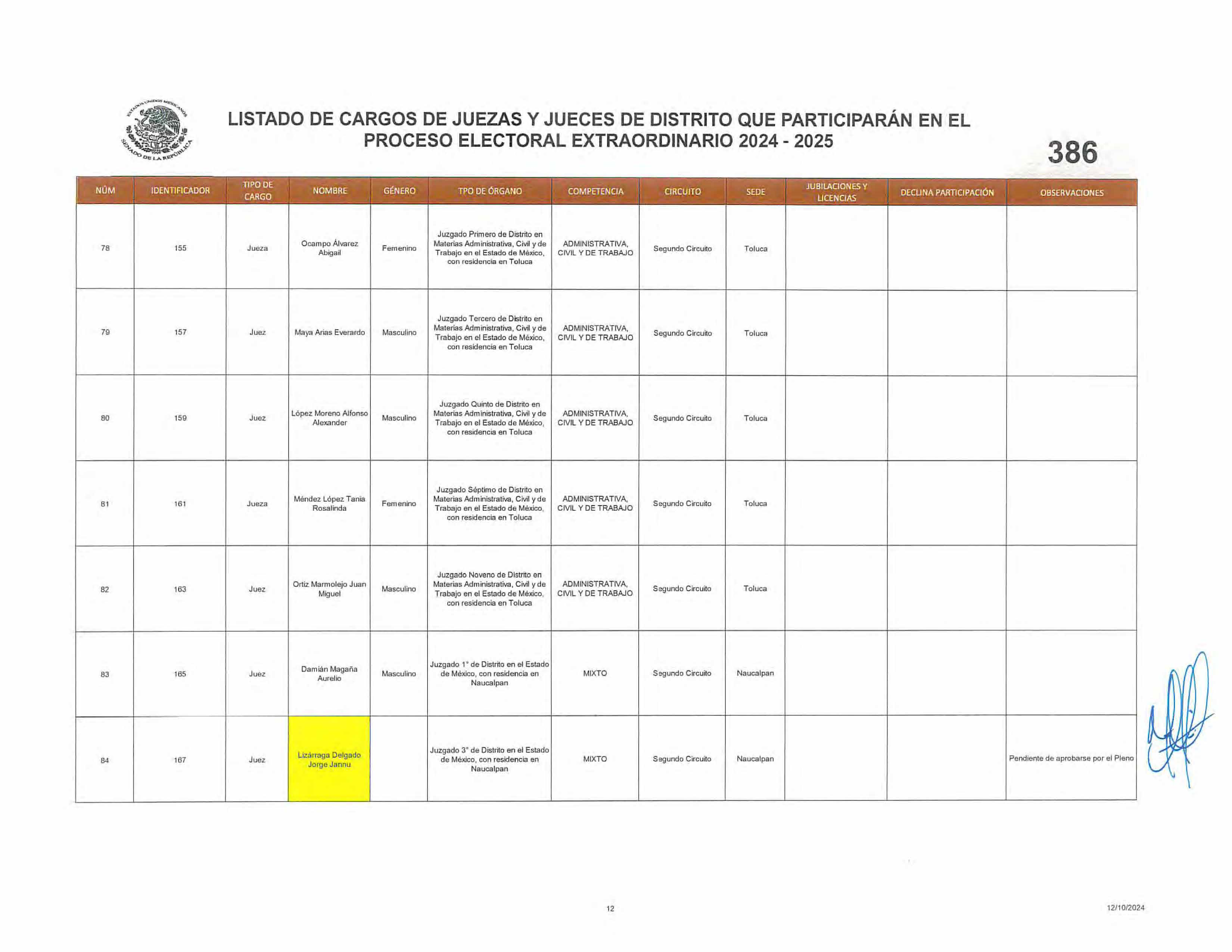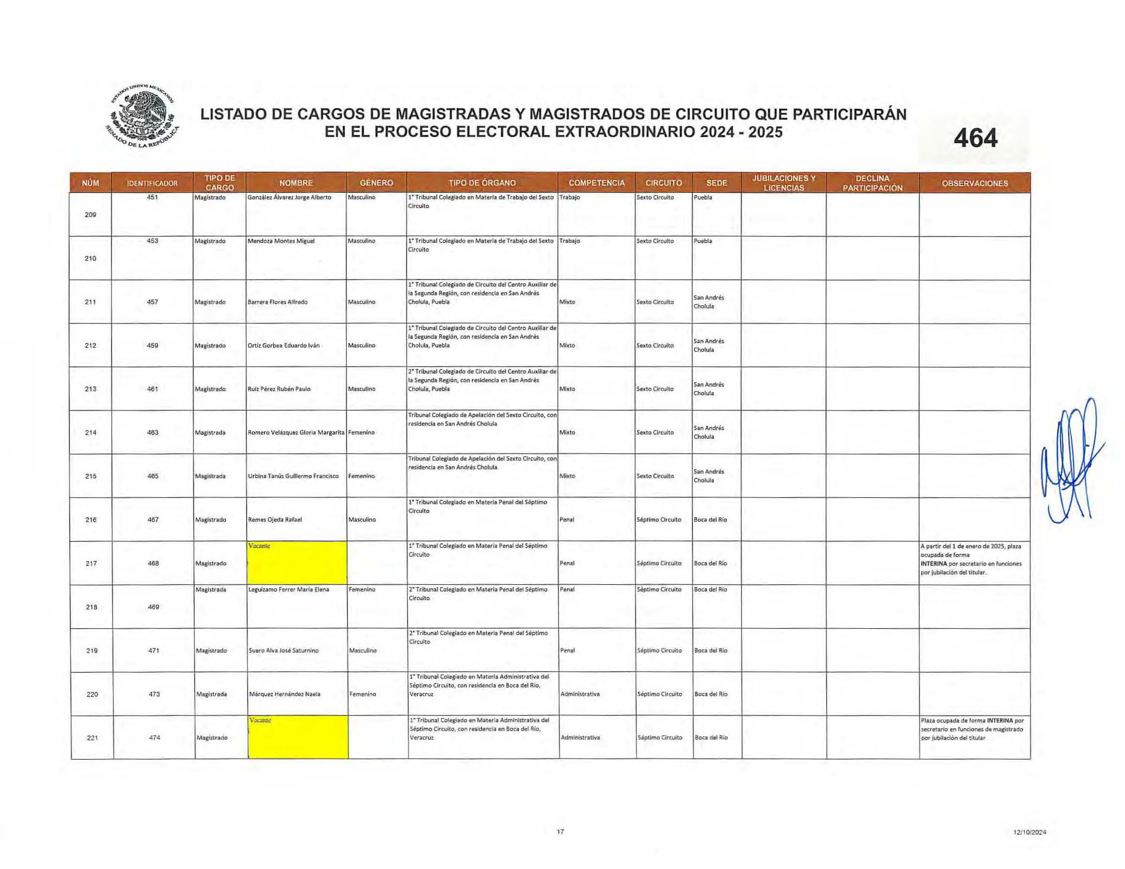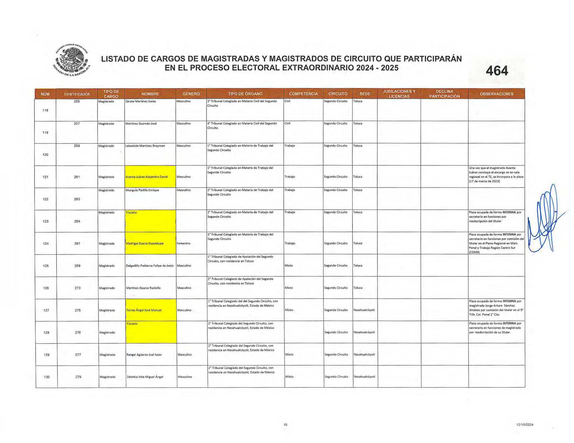 Noveno. El Presidente de la Mesa Directiva del Senado de la República, con fecha 19 de septiembre del año en curso, solicitó al Consejo de la Judicatura Federal (CJF) el listado con la totalidad de cargos de personas juzgadoras y este, en obsequio y también en acatamiento a lo previsto por el artículo segundo transitorio, párrafo cuarto, inciso a), del Decreto, remitió al Senado de la República, que lo recibió el 10 de octubre corriente, el listado con la totalidad de cargos de personas juzgadoras, indicando su circuito judicial, especialización por materia, género, vacancias por renuncia, jubilaciones y retiros programados, y la demás información que se requirió.