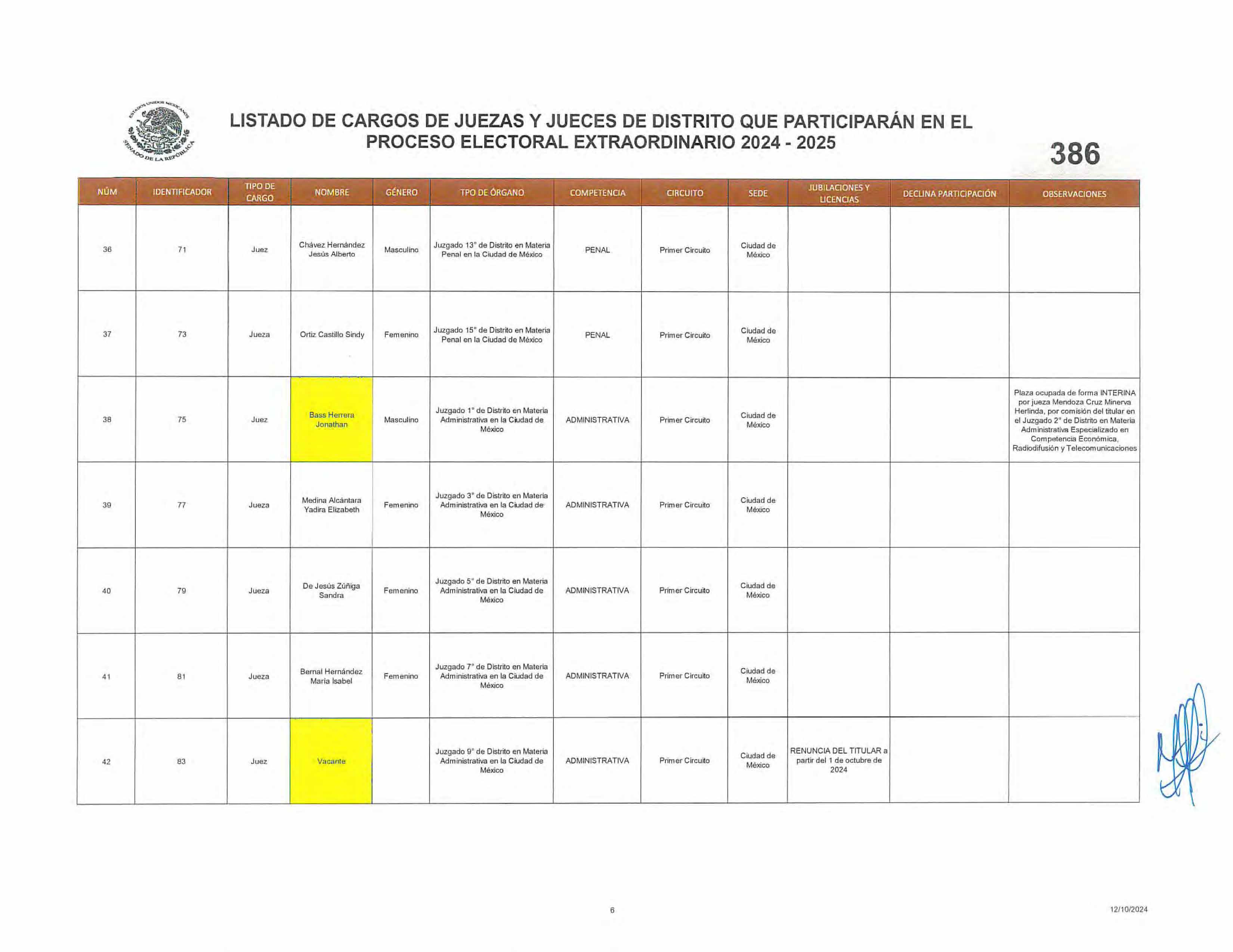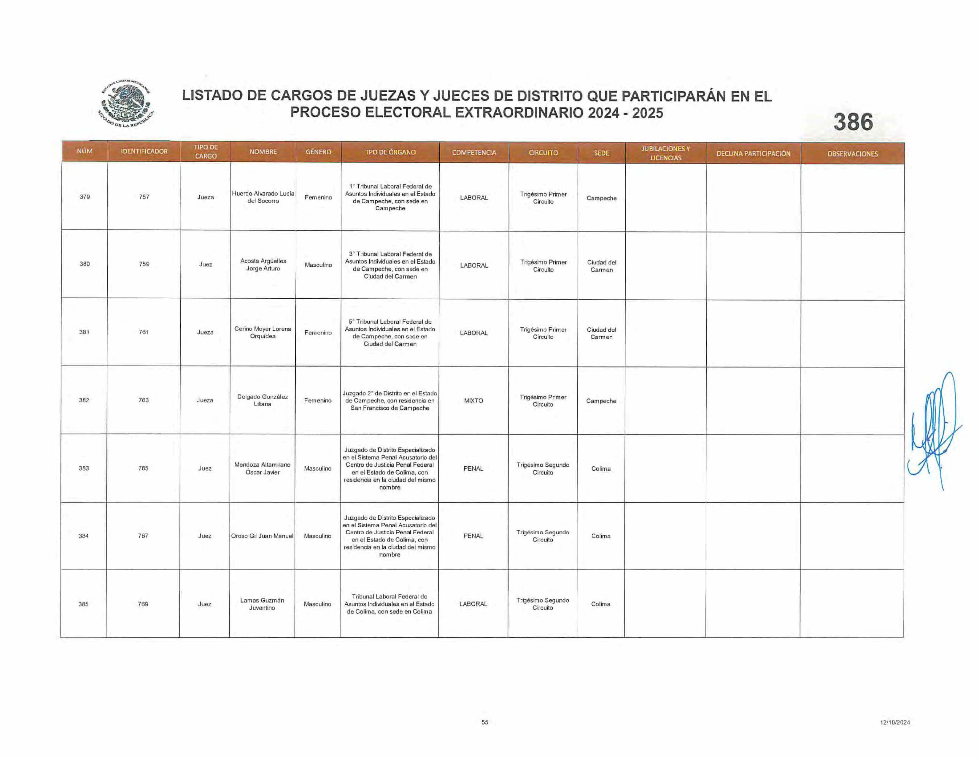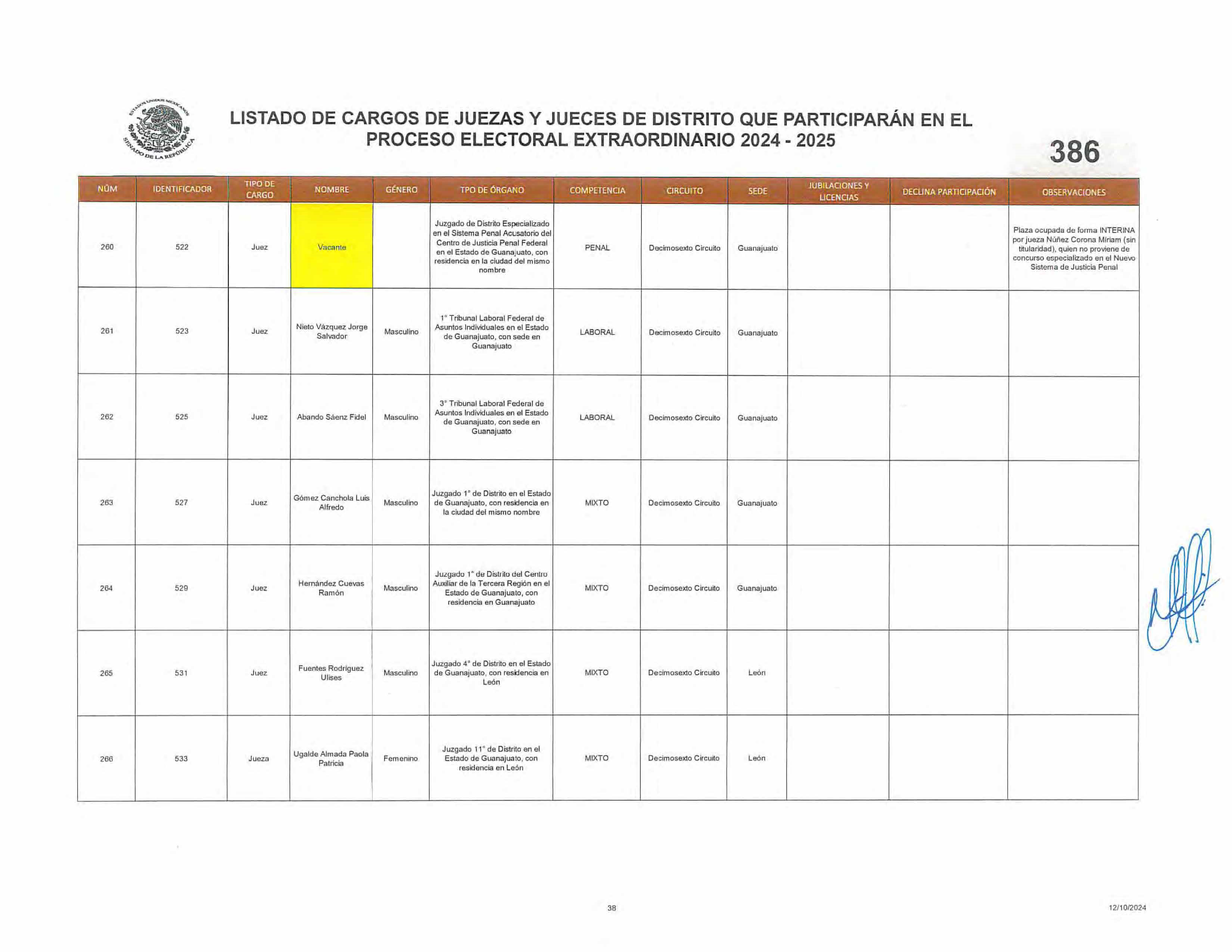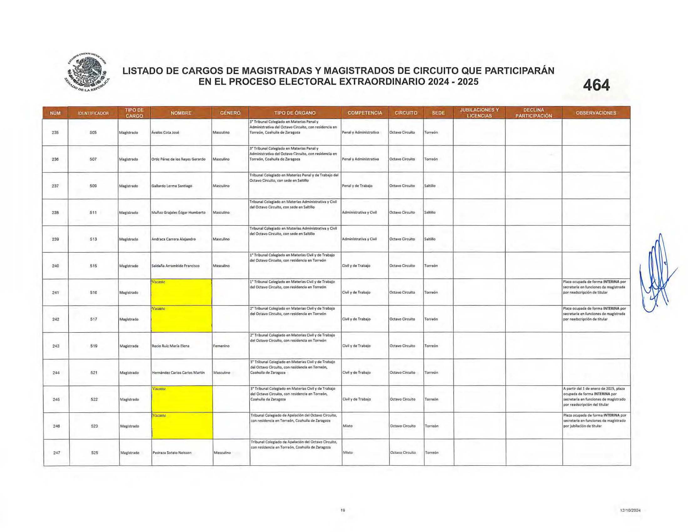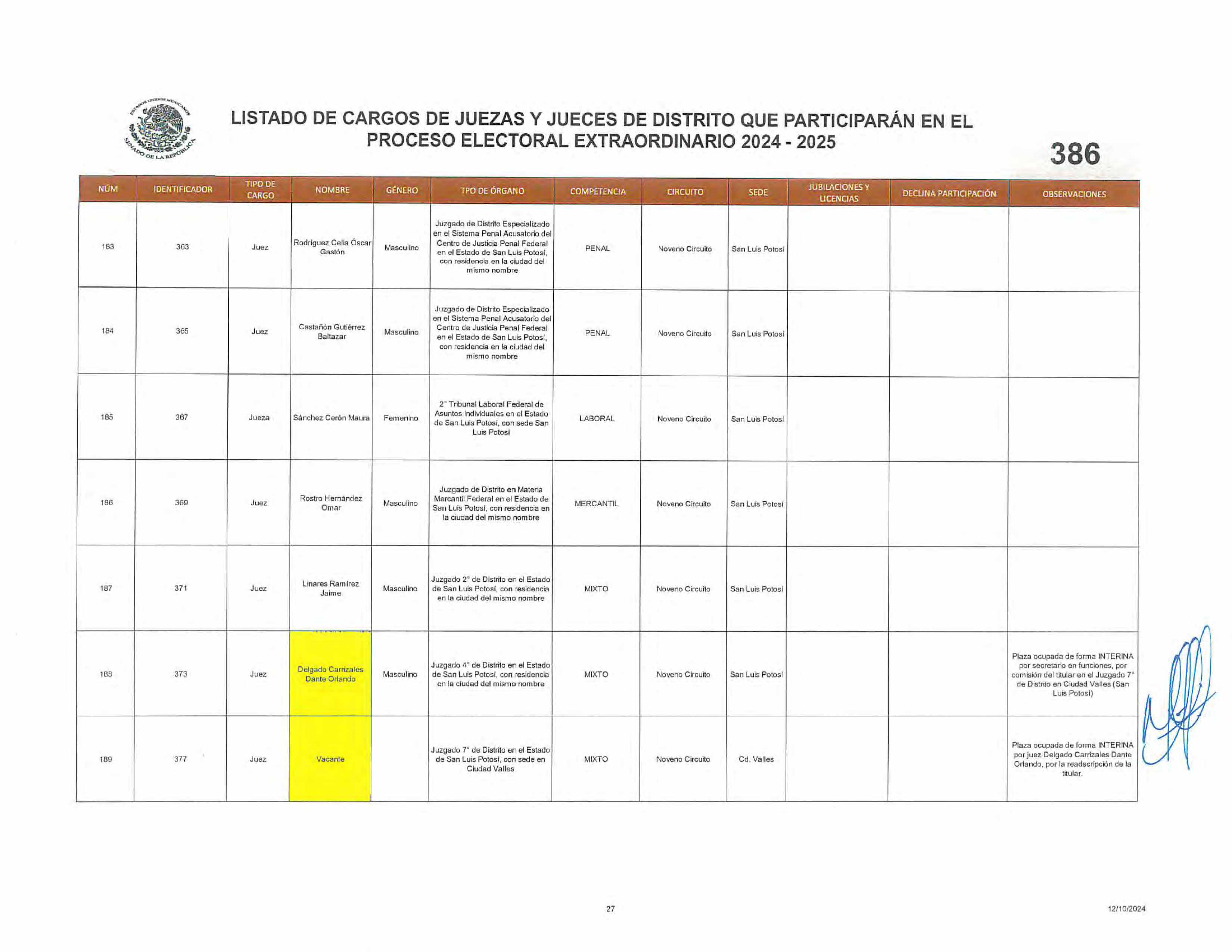 Noveno. El Presidente de la Mesa Directiva del Senado de la República, con fecha 19 de septiembre del año en curso, solicitó al Consejo de la Judicatura Federal (CJF) el listado con la totalidad de cargos de personas juzgadoras y este, en obsequio y también en acatamiento a lo previsto por el artículo segundo transitorio, párrafo cuarto, inciso a), del Decreto, remitió al Senado de la República, que lo recibió el 10 de octubre corriente, el listado con la totalidad de cargos de personas juzgadoras, indicando su circuito judicial, especialización por materia, género, vacancias por renuncia, jubilaciones y retiros programados, y la demás información que se requirió.