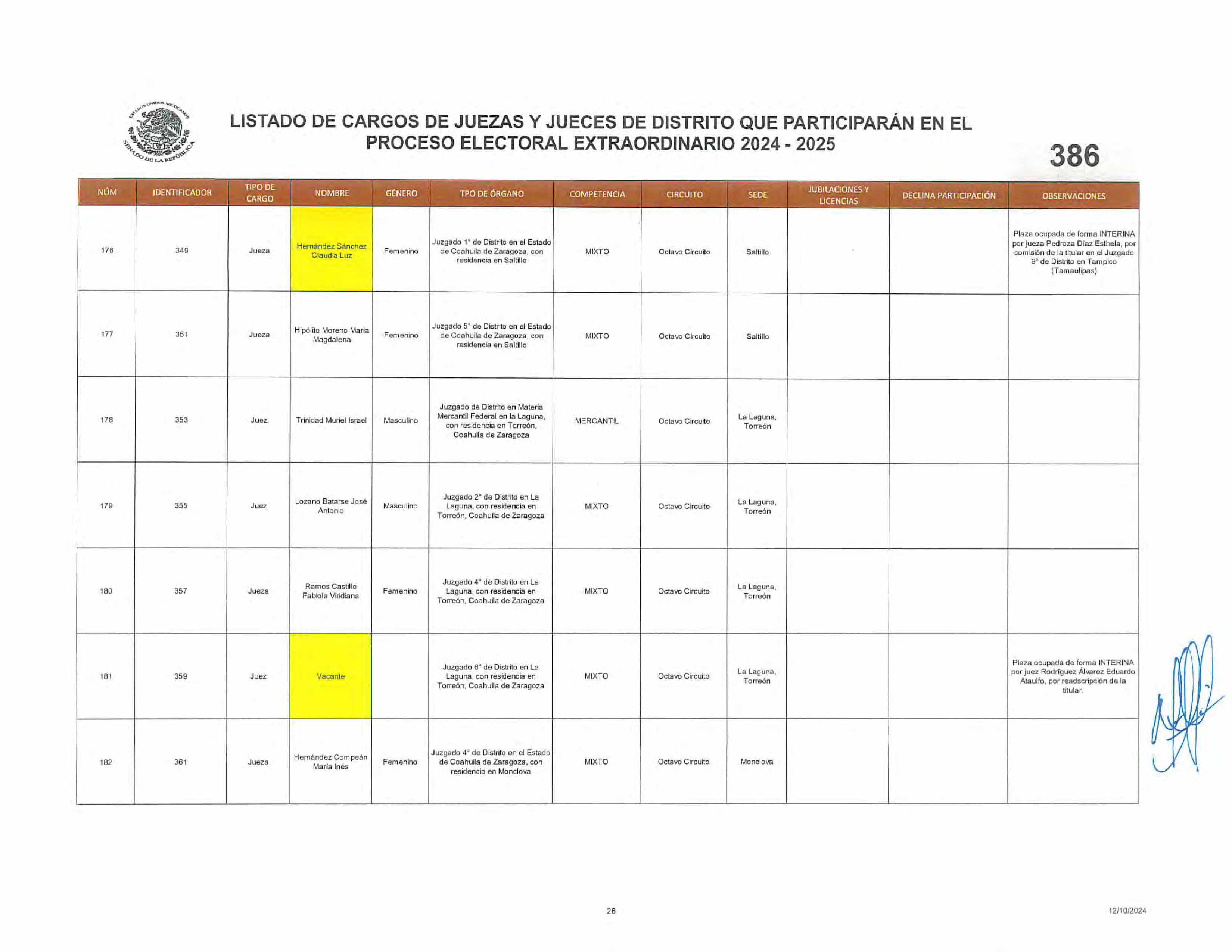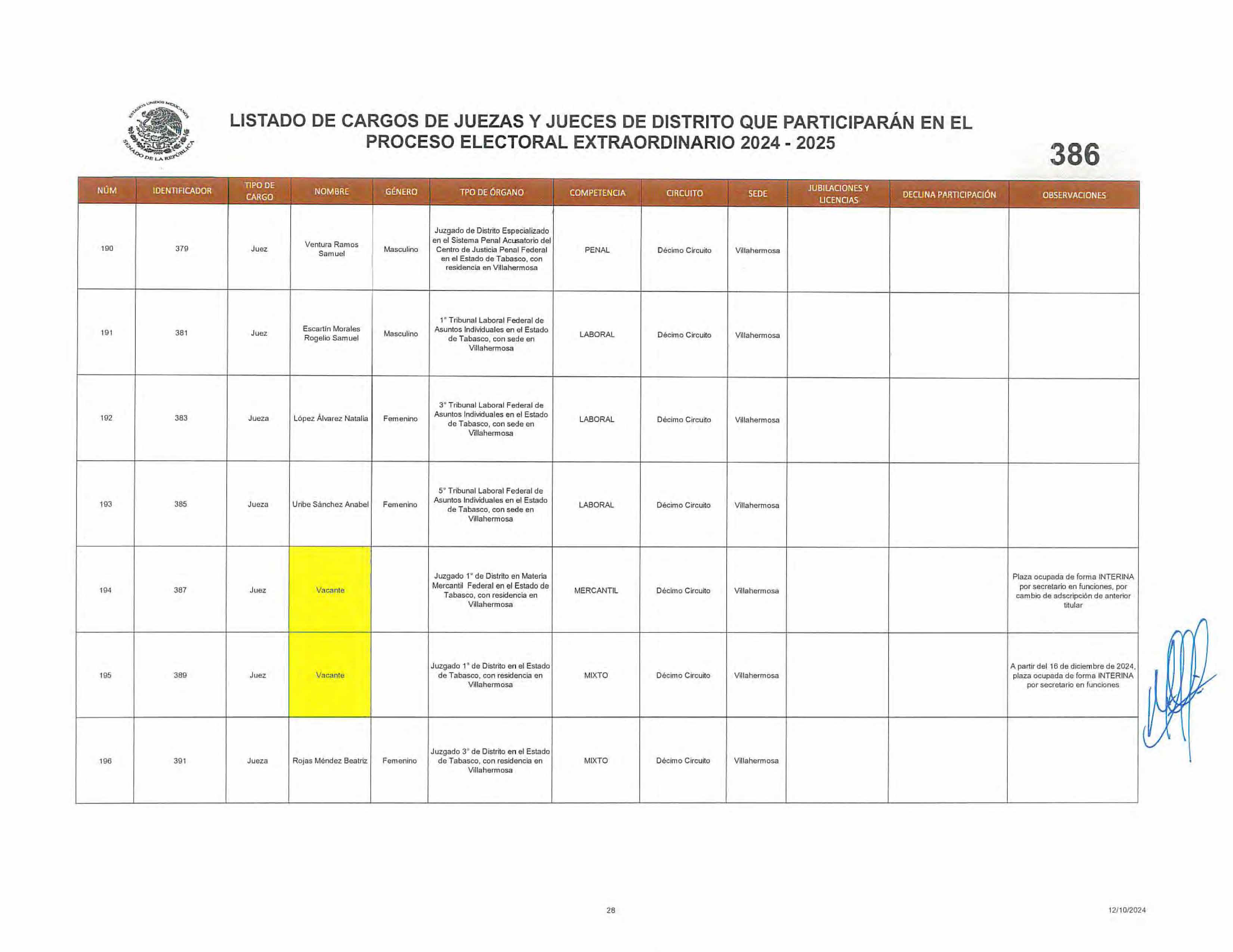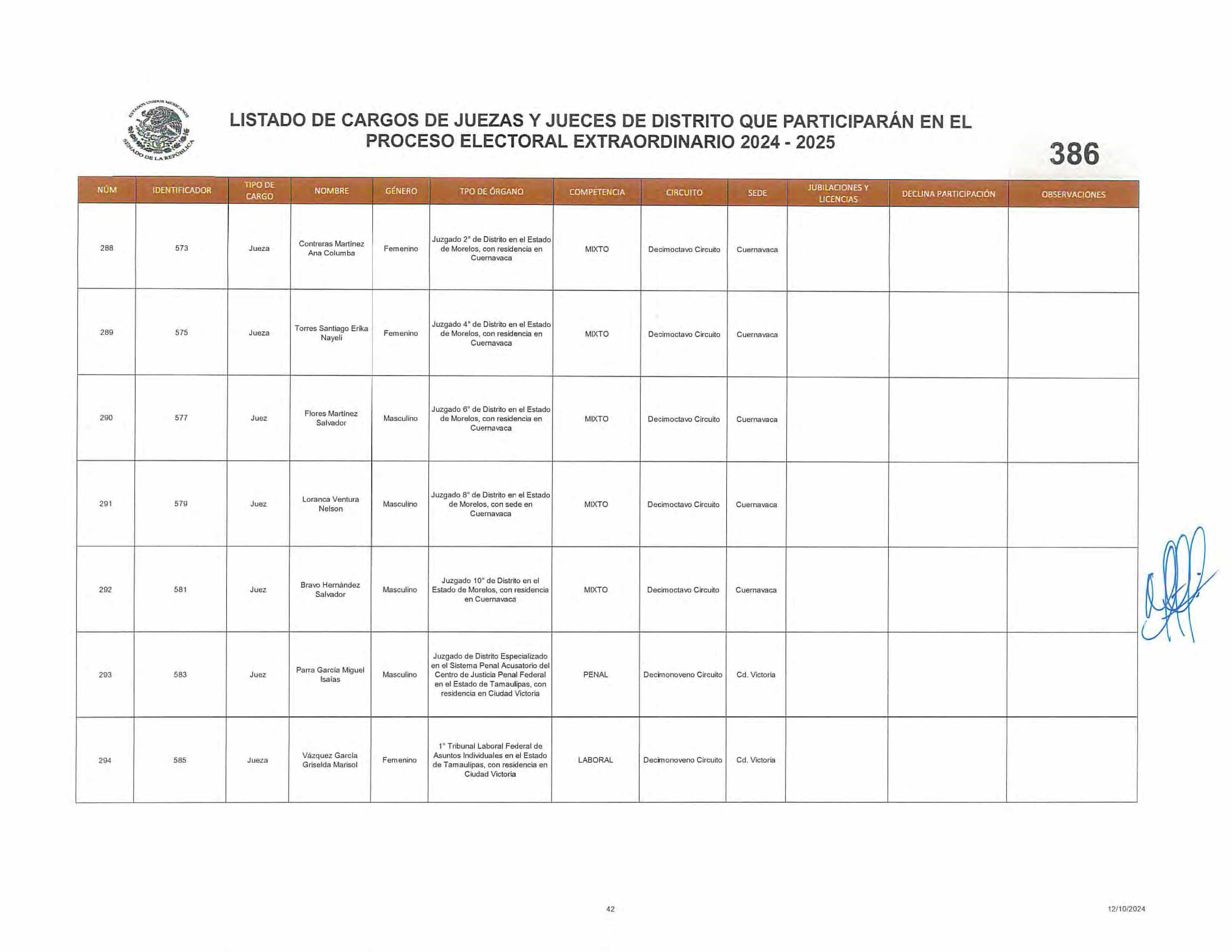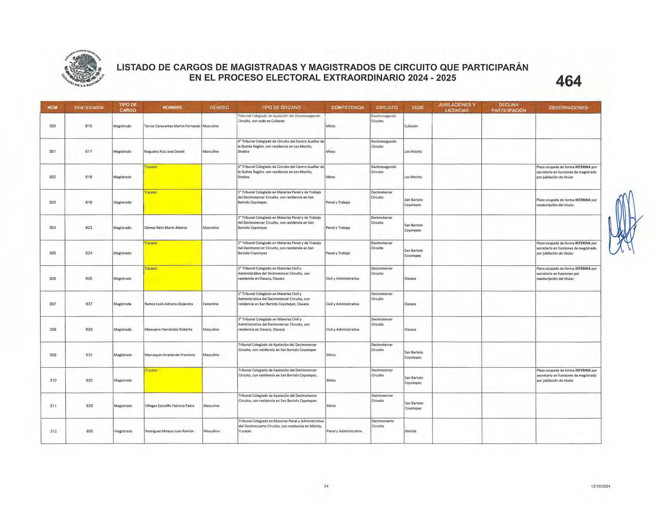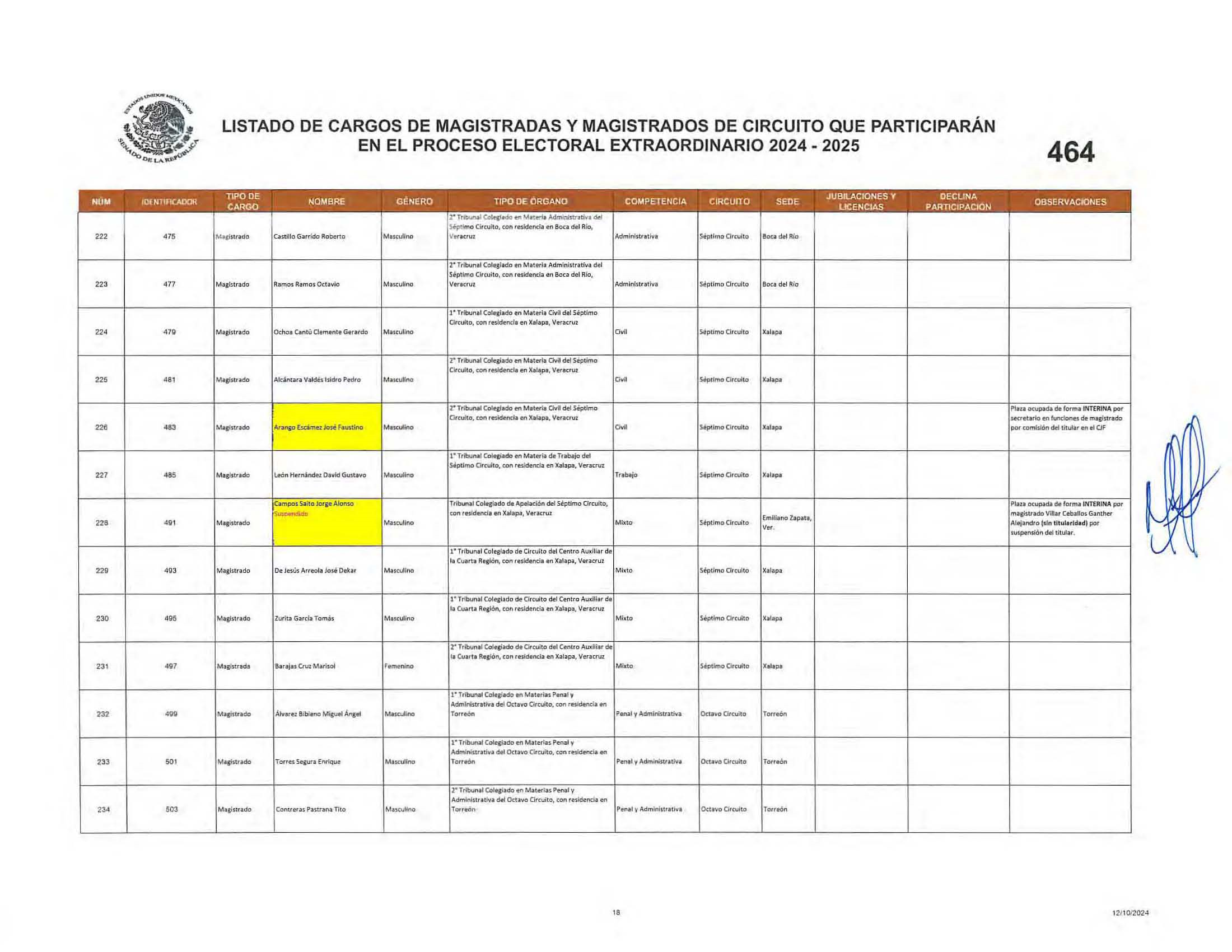 Noveno. El Presidente de la Mesa Directiva del Senado de la República, con fecha 19 de septiembre del año en curso, solicitó al Consejo de la Judicatura Federal (CJF) el listado con la totalidad de cargos de personas juzgadoras y este, en obsequio y también en acatamiento a lo previsto por el artículo segundo transitorio, párrafo cuarto, inciso a), del Decreto, remitió al Senado de la República, que lo recibió el 10 de octubre corriente, el listado con la totalidad de cargos de personas juzgadoras, indicando su circuito judicial, especialización por materia, género, vacancias por renuncia, jubilaciones y retiros programados, y la demás información que se requirió.