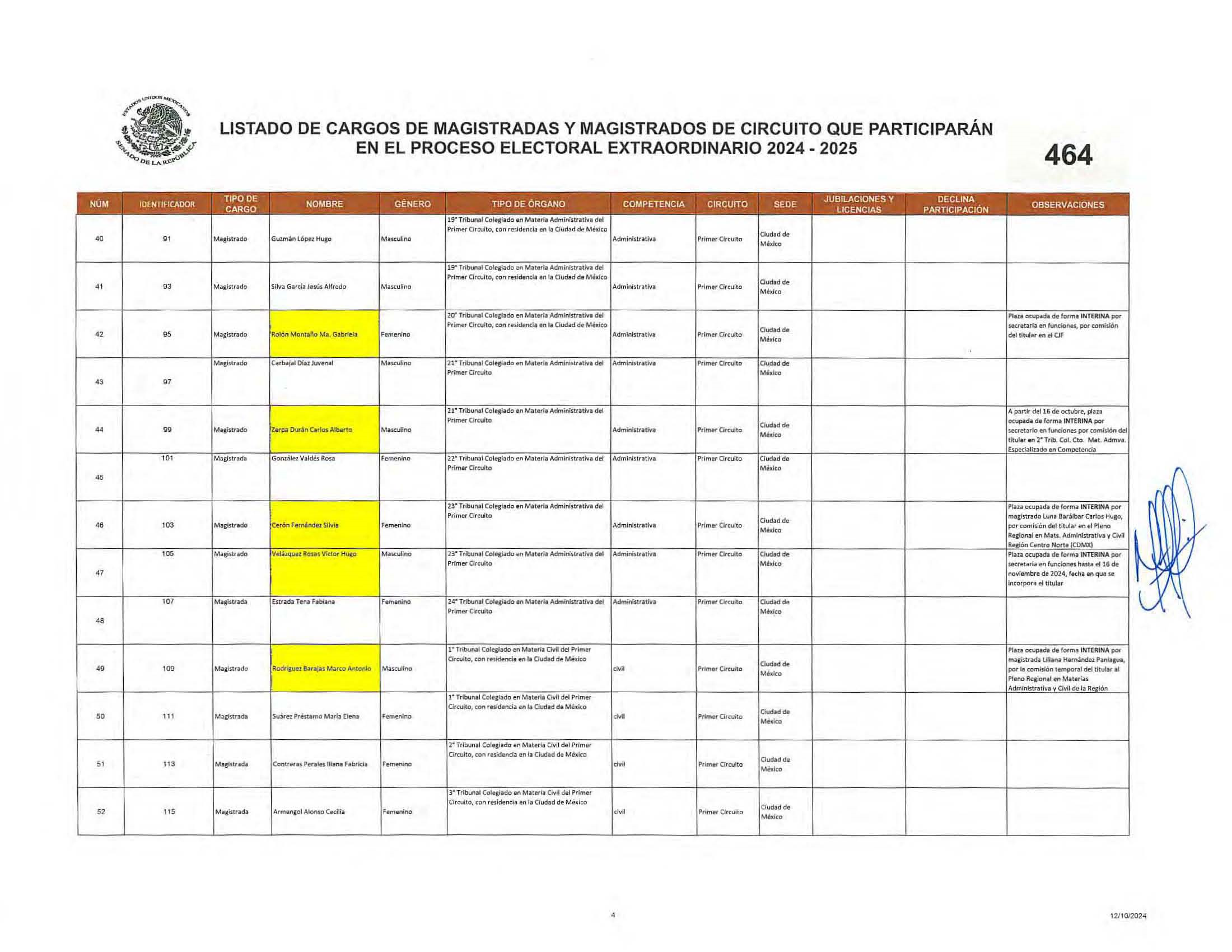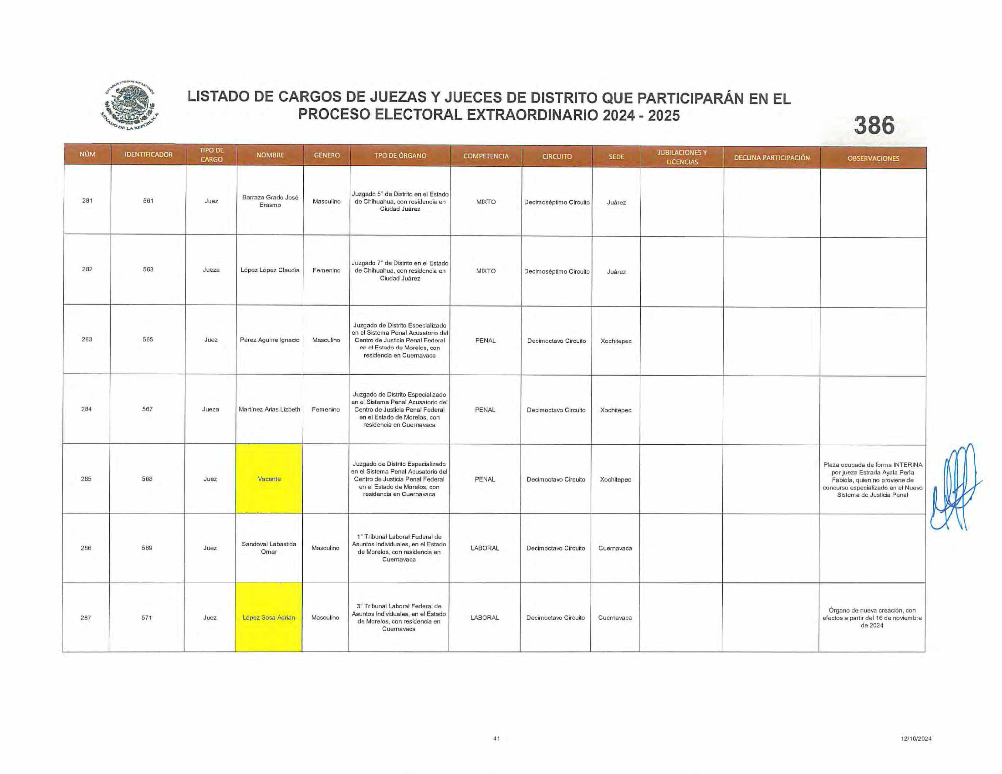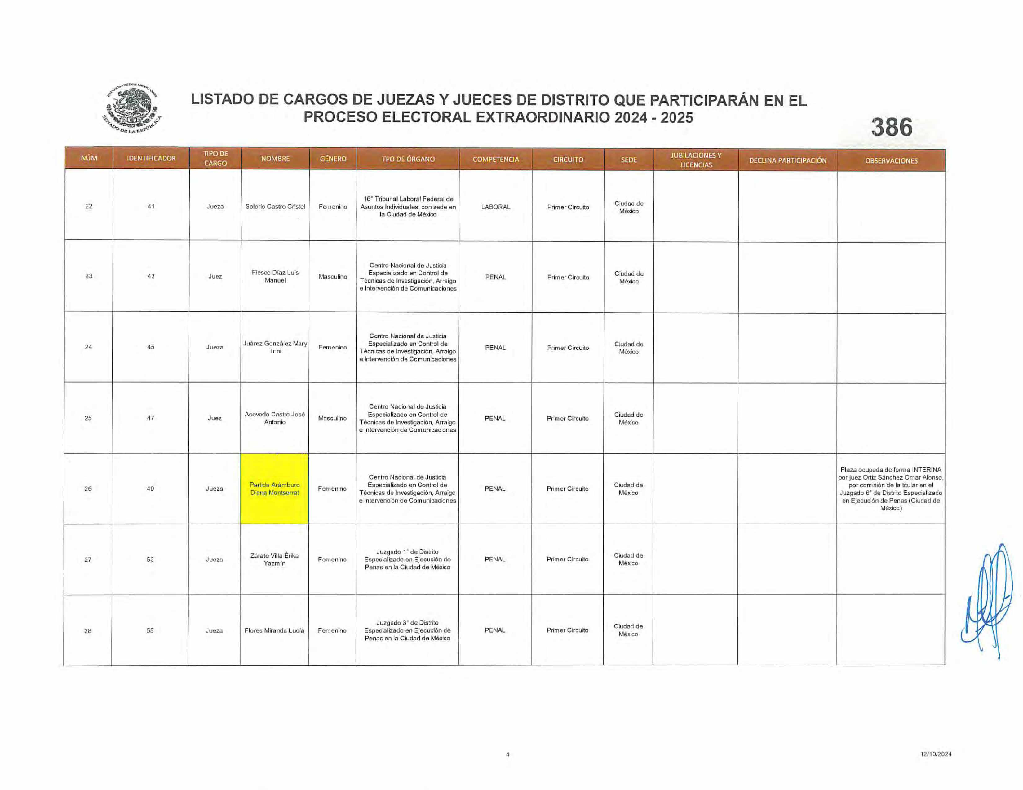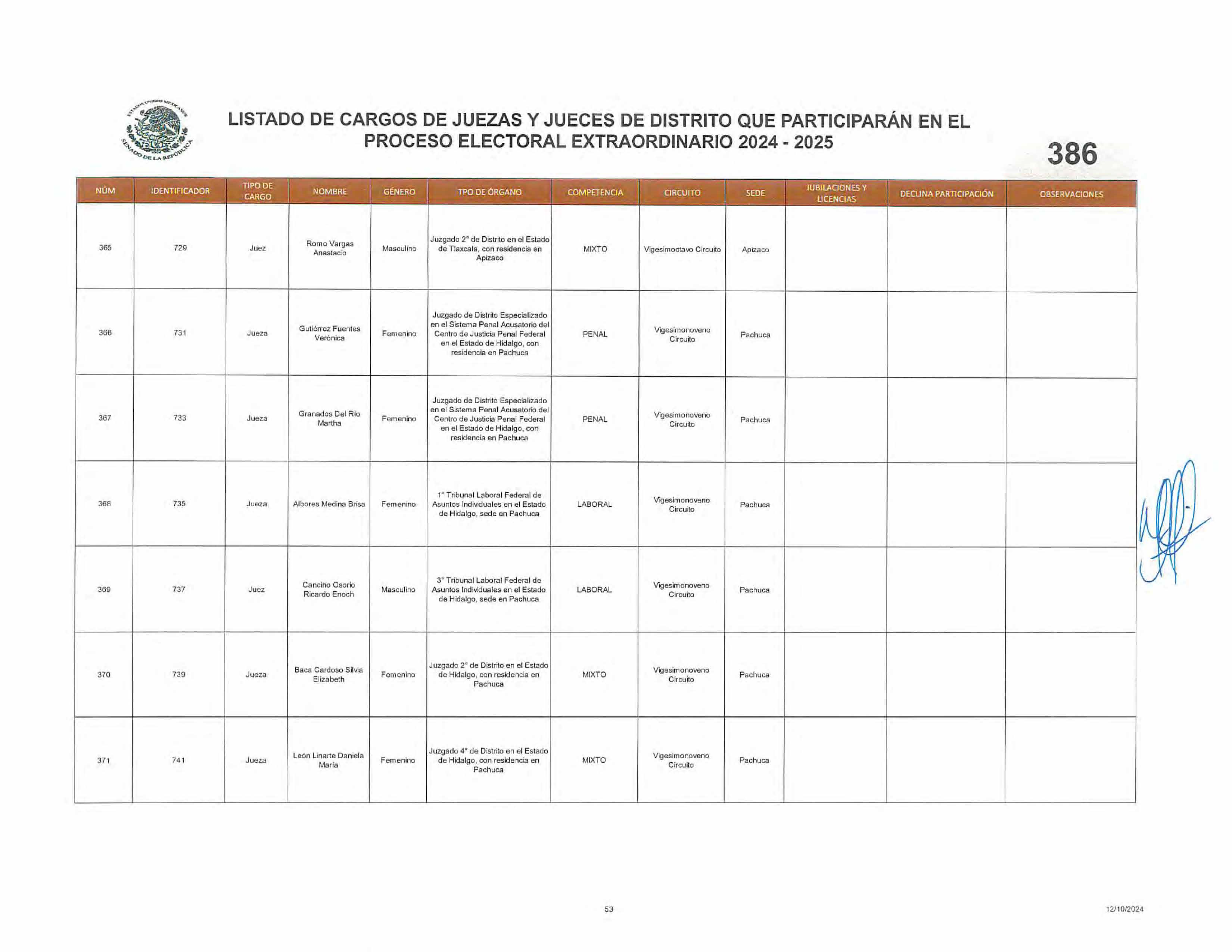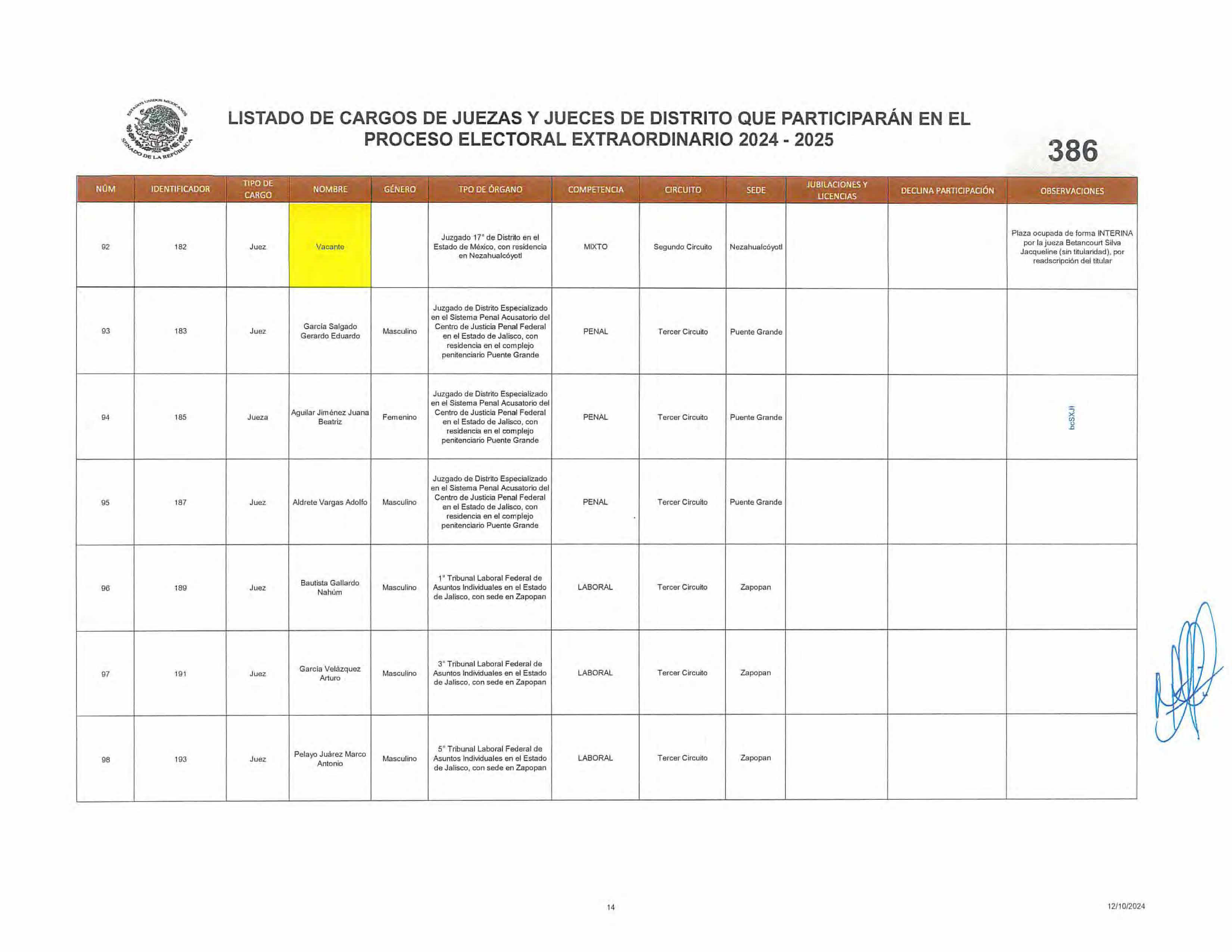 Noveno. El Presidente de la Mesa Directiva del Senado de la República, con fecha 19 de septiembre del año en curso, solicitó al Consejo de la Judicatura Federal (CJF) el listado con la totalidad de cargos de personas juzgadoras y este, en obsequio y también en acatamiento a lo previsto por el artículo segundo transitorio, párrafo cuarto, inciso a), del Decreto, remitió al Senado de la República, que lo recibió el 10 de octubre corriente, el listado con la totalidad de cargos de personas juzgadoras, indicando su circuito judicial, especialización por materia, género, vacancias por renuncia, jubilaciones y retiros programados, y la demás información que se requirió.