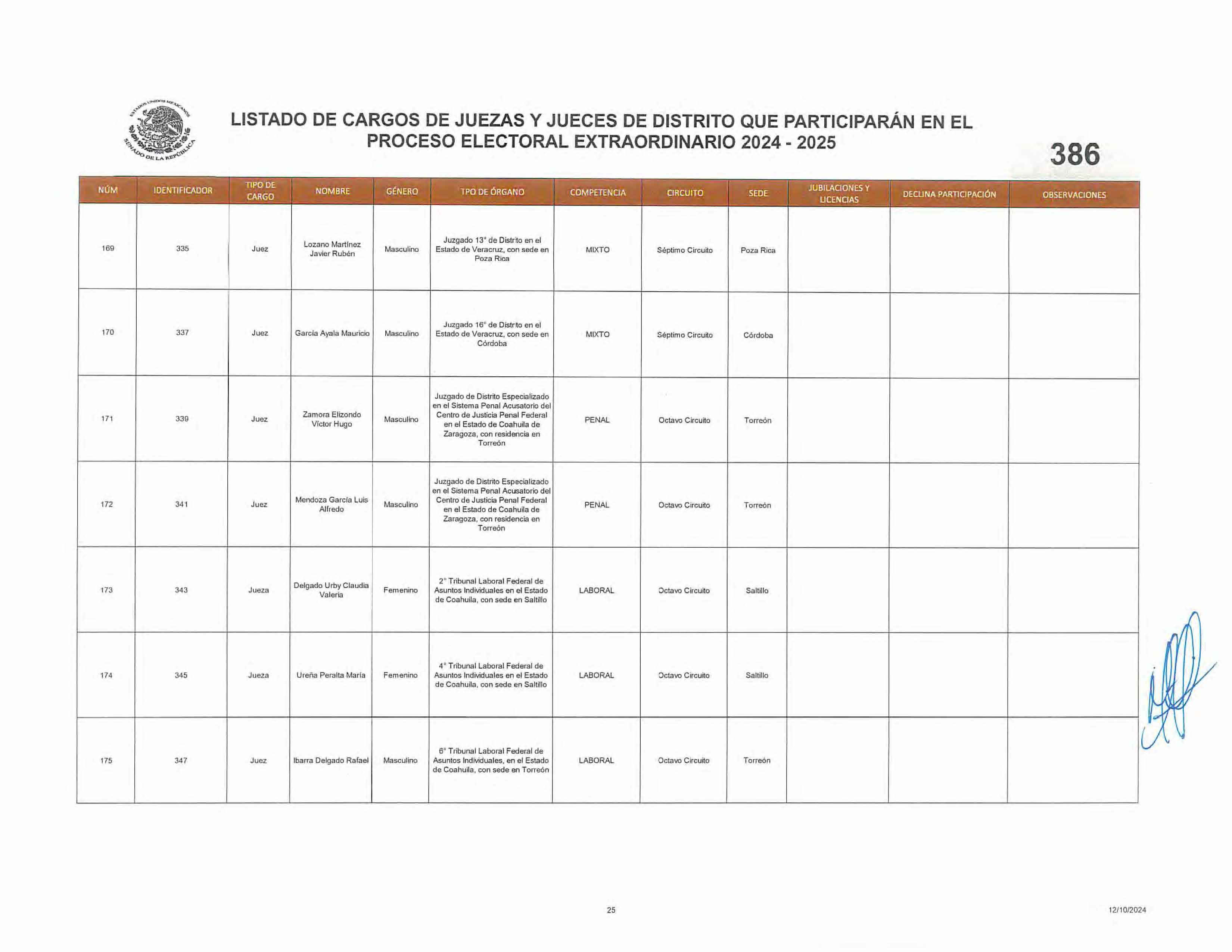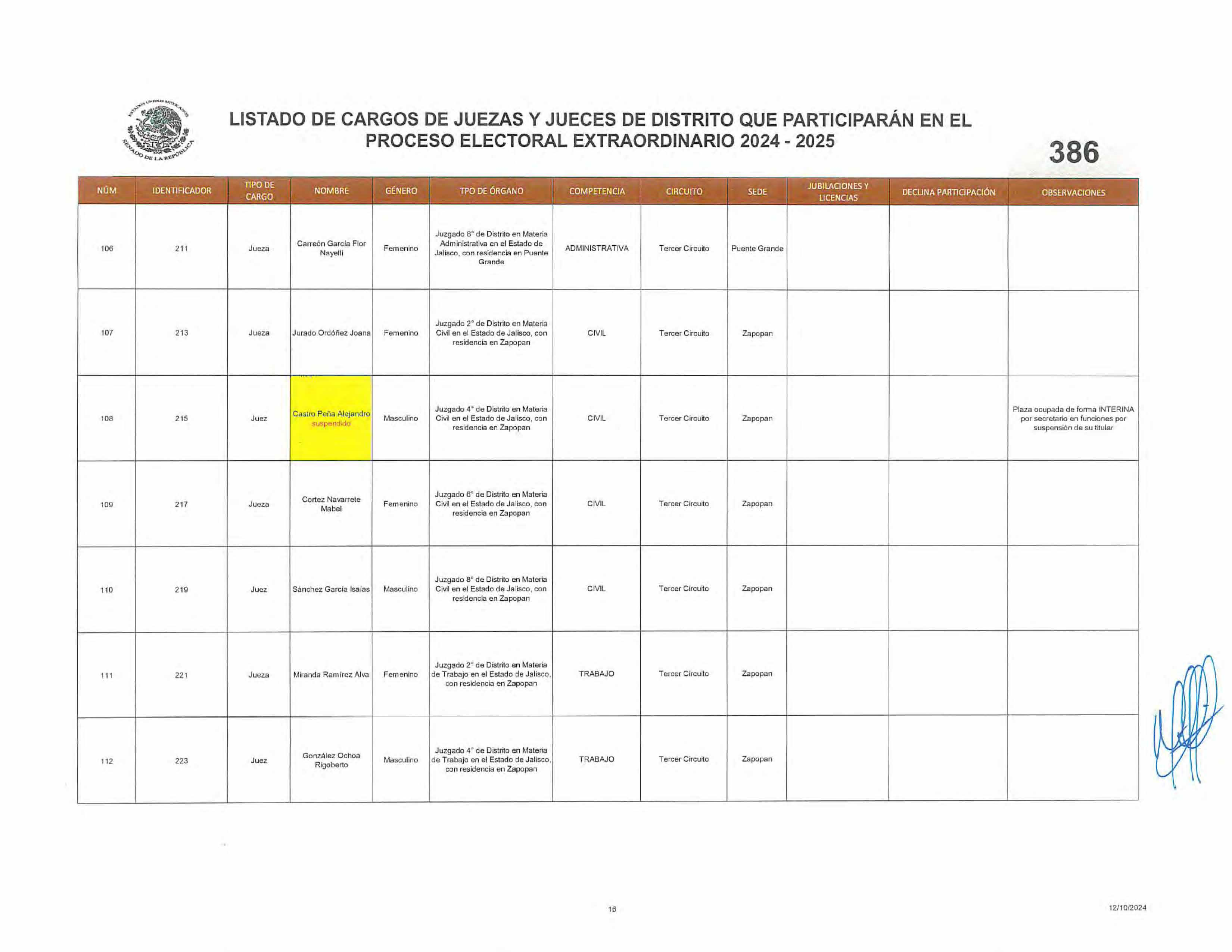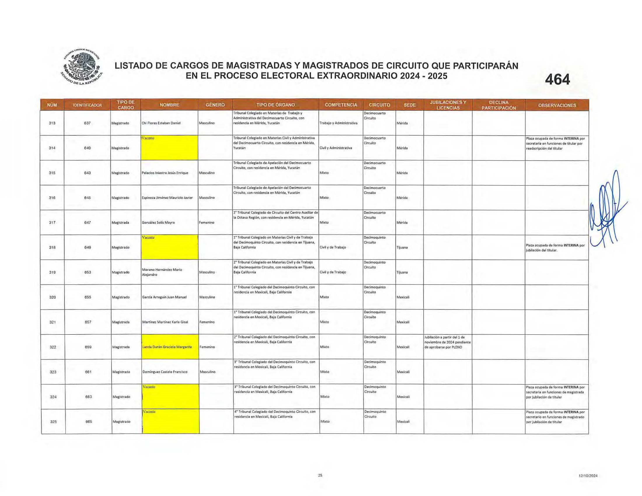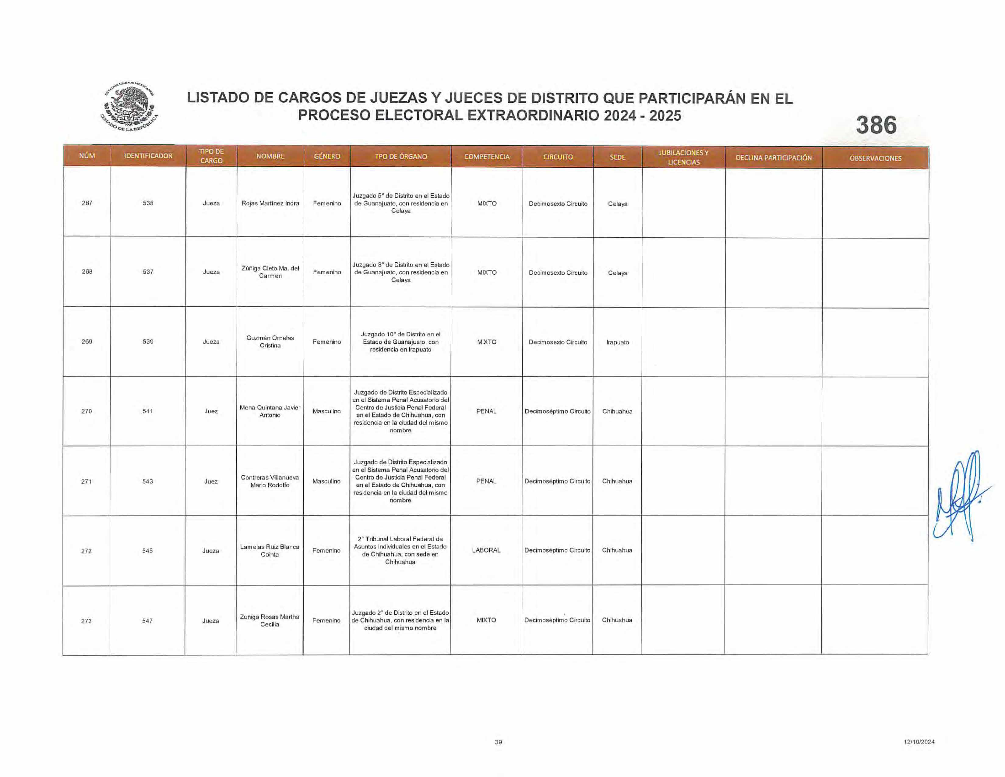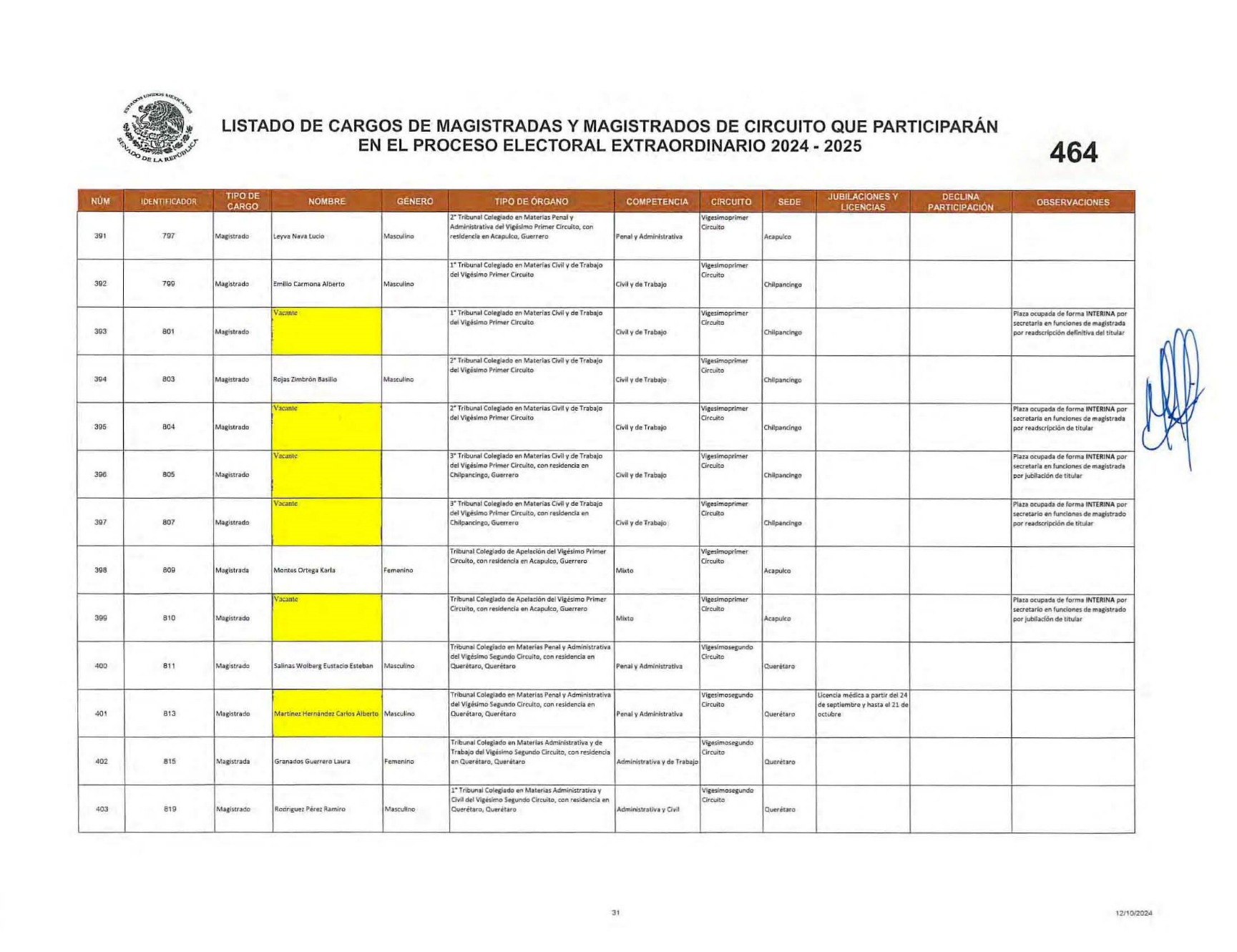 Noveno. El Presidente de la Mesa Directiva del Senado de la República, con fecha 19 de septiembre del año en curso, solicitó al Consejo de la Judicatura Federal (CJF) el listado con la totalidad de cargos de personas juzgadoras y este, en obsequio y también en acatamiento a lo previsto por el artículo segundo transitorio, párrafo cuarto, inciso a), del Decreto, remitió al Senado de la República, que lo recibió el 10 de octubre corriente, el listado con la totalidad de cargos de personas juzgadoras, indicando su circuito judicial, especialización por materia, género, vacancias por renuncia, jubilaciones y retiros programados, y la demás información que se requirió.