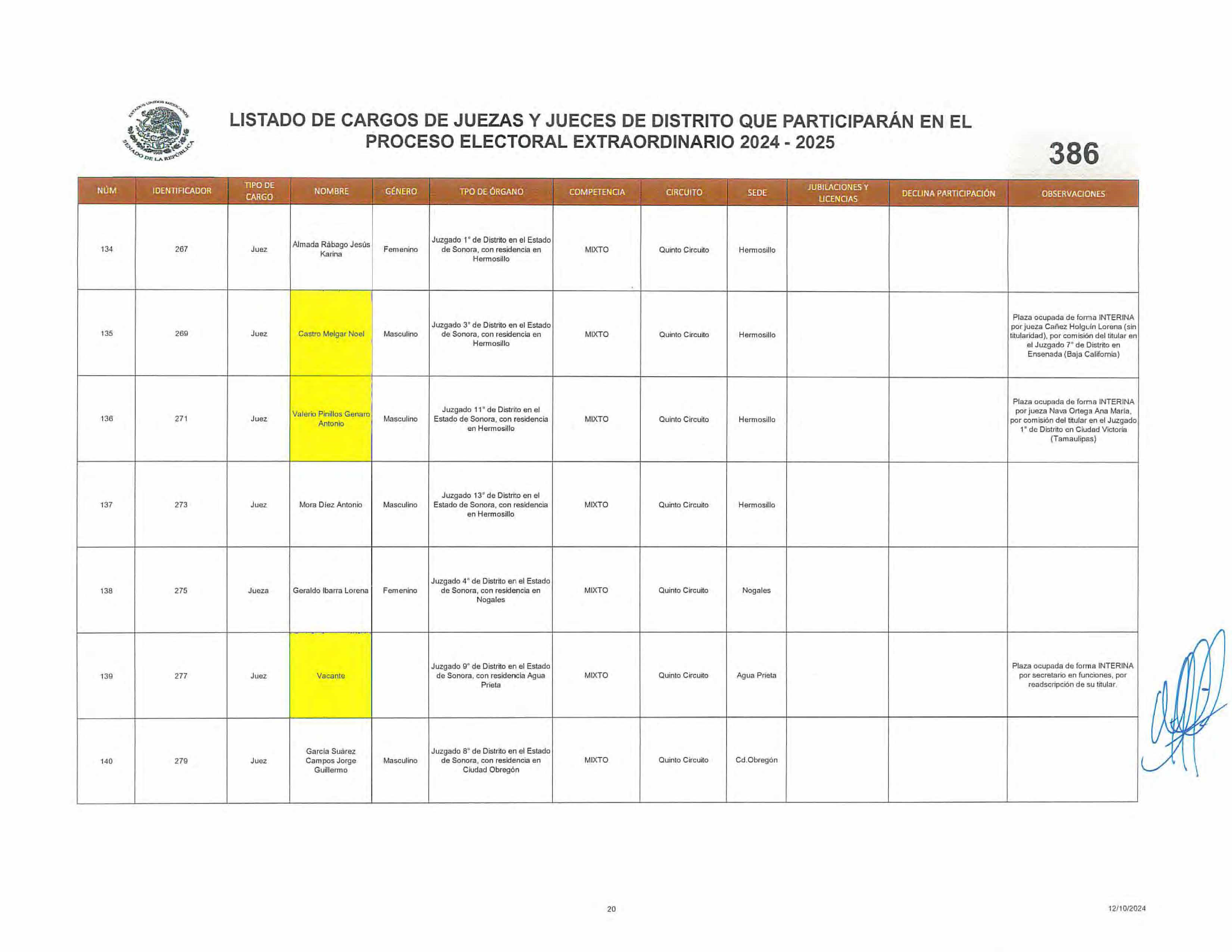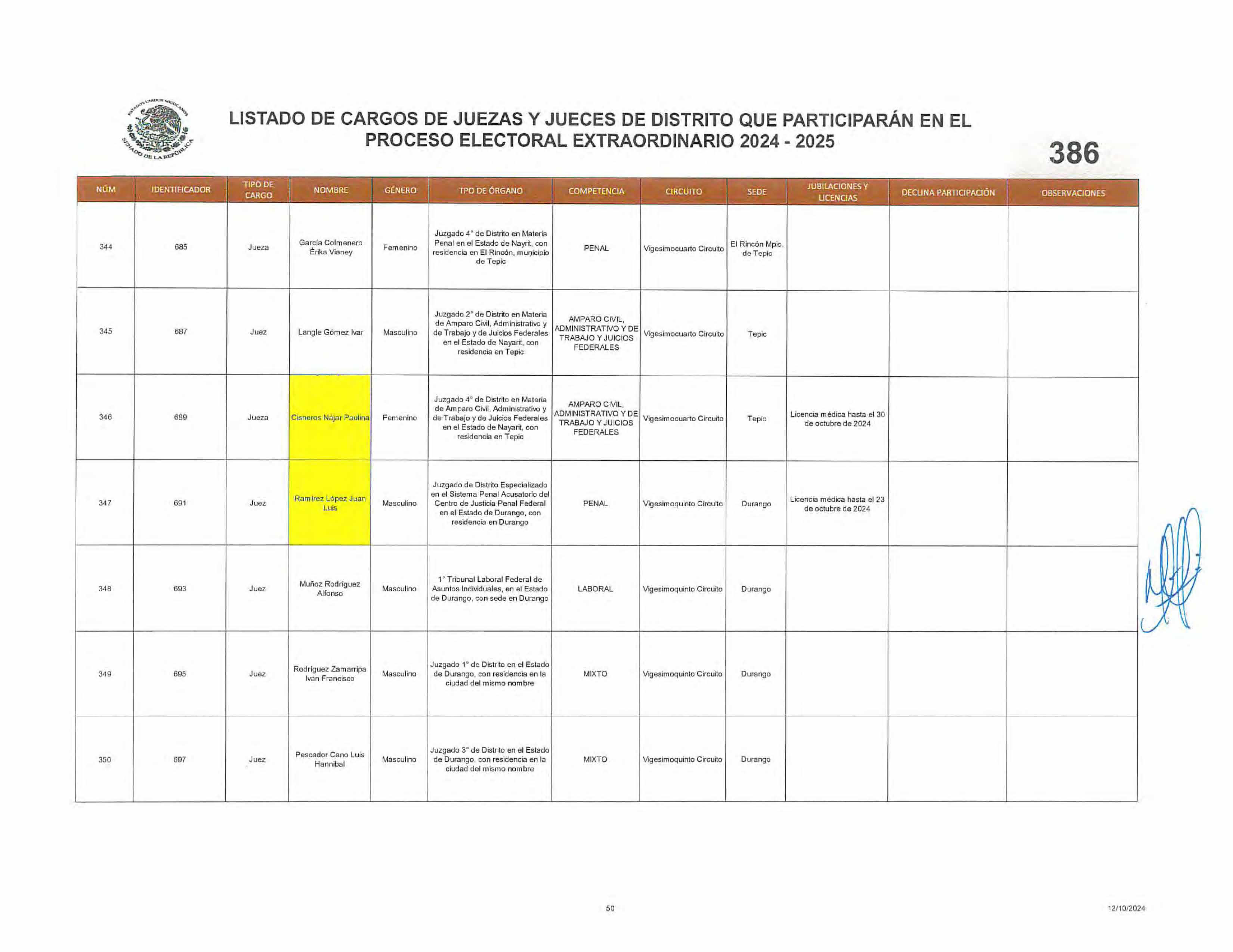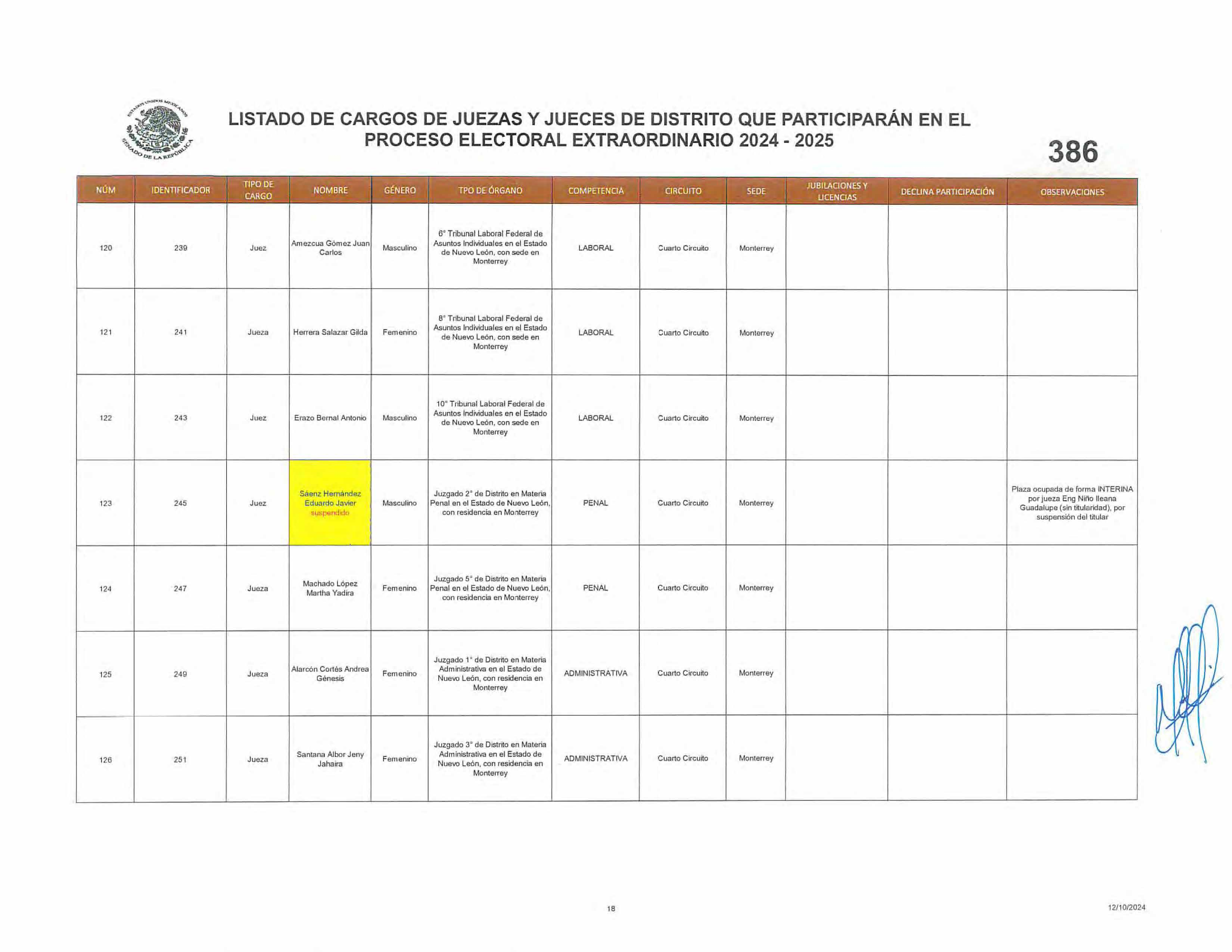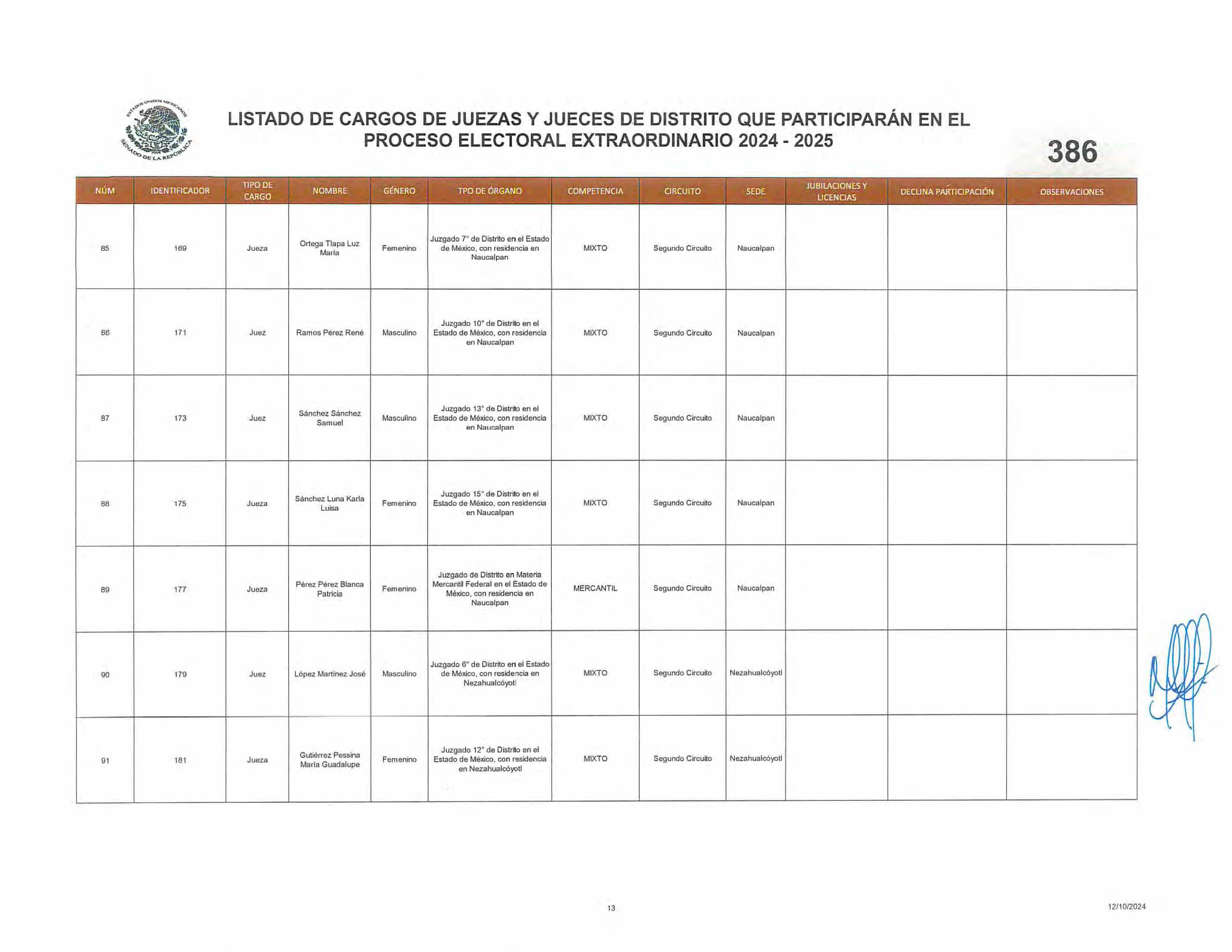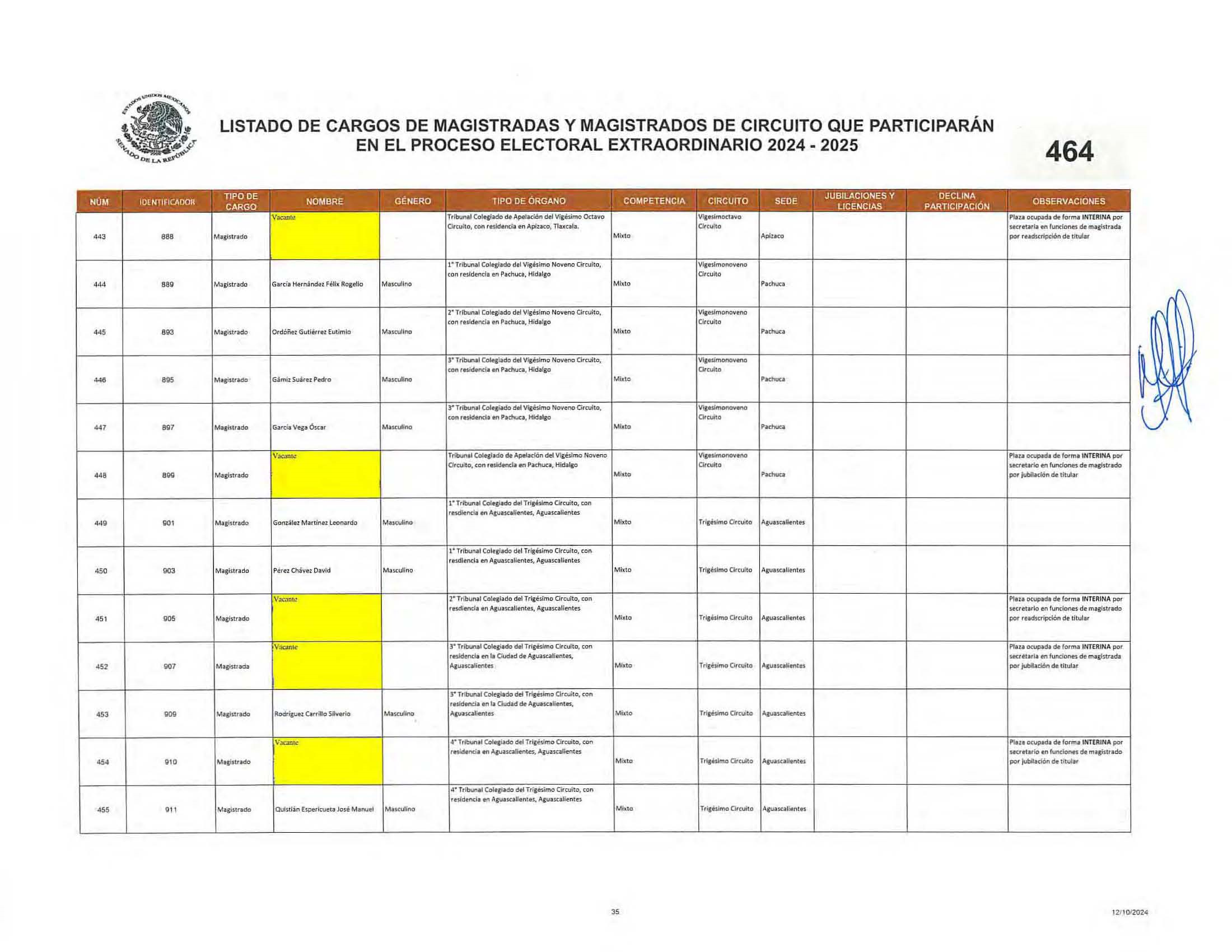 Noveno. El Presidente de la Mesa Directiva del Senado de la República, con fecha 19 de septiembre del año en curso, solicitó al Consejo de la Judicatura Federal (CJF) el listado con la totalidad de cargos de personas juzgadoras y este, en obsequio y también en acatamiento a lo previsto por el artículo segundo transitorio, párrafo cuarto, inciso a), del Decreto, remitió al Senado de la República, que lo recibió el 10 de octubre corriente, el listado con la totalidad de cargos de personas juzgadoras, indicando su circuito judicial, especialización por materia, género, vacancias por renuncia, jubilaciones y retiros programados, y la demás información que se requirió.