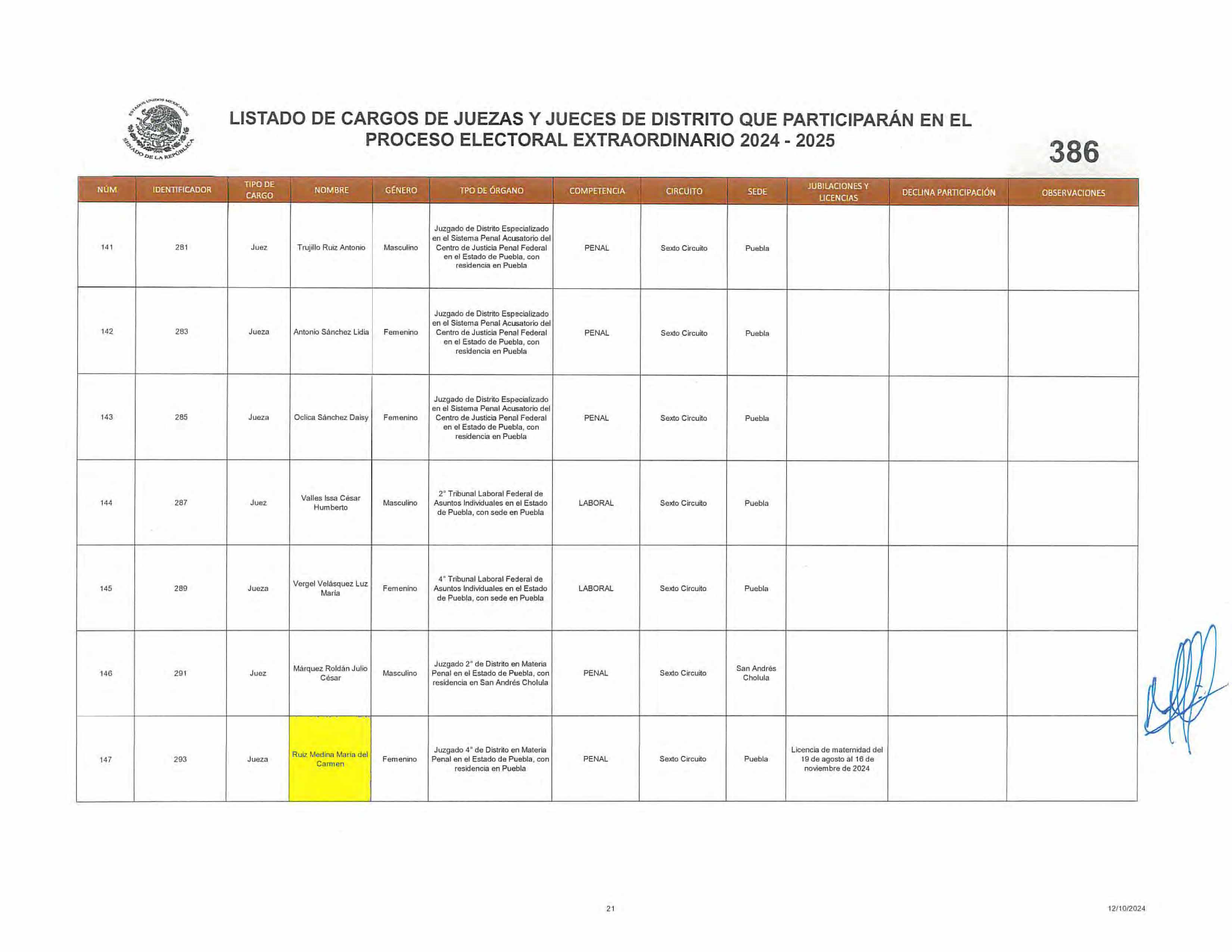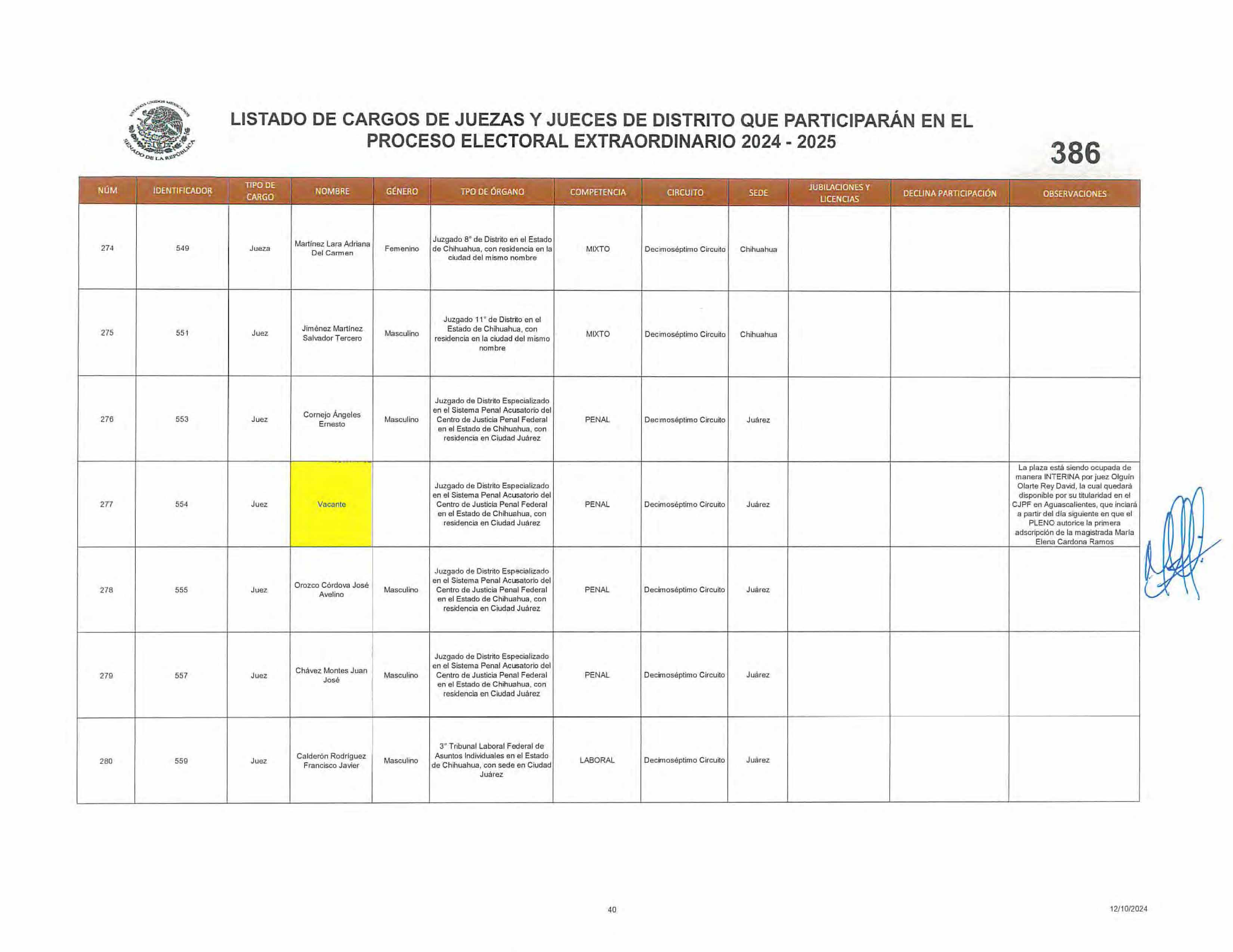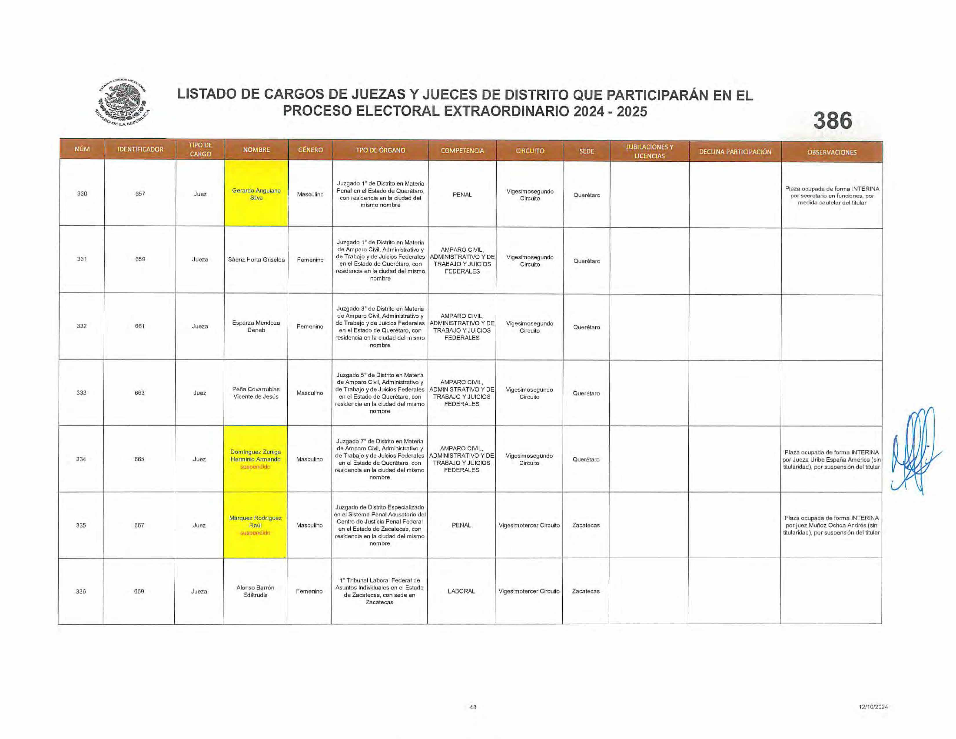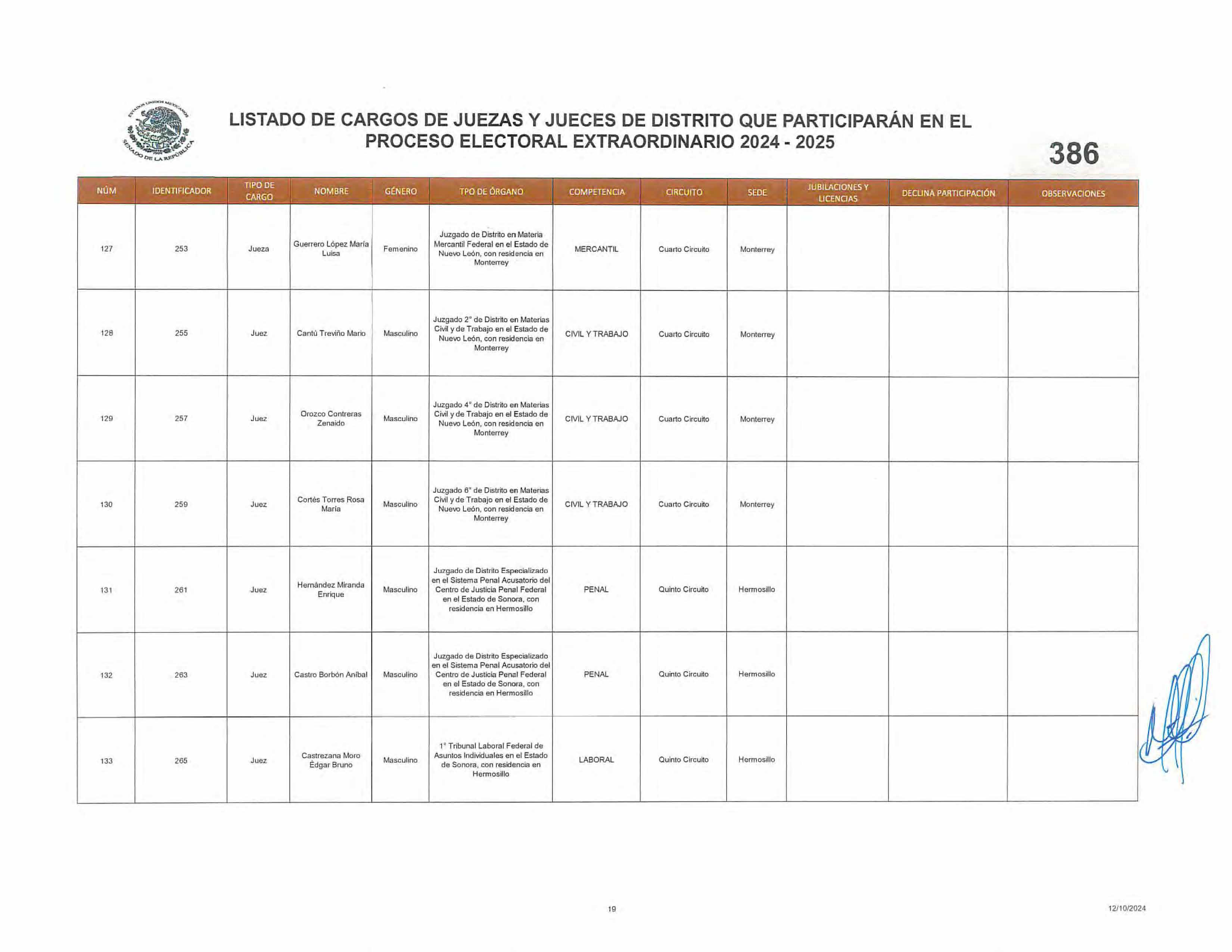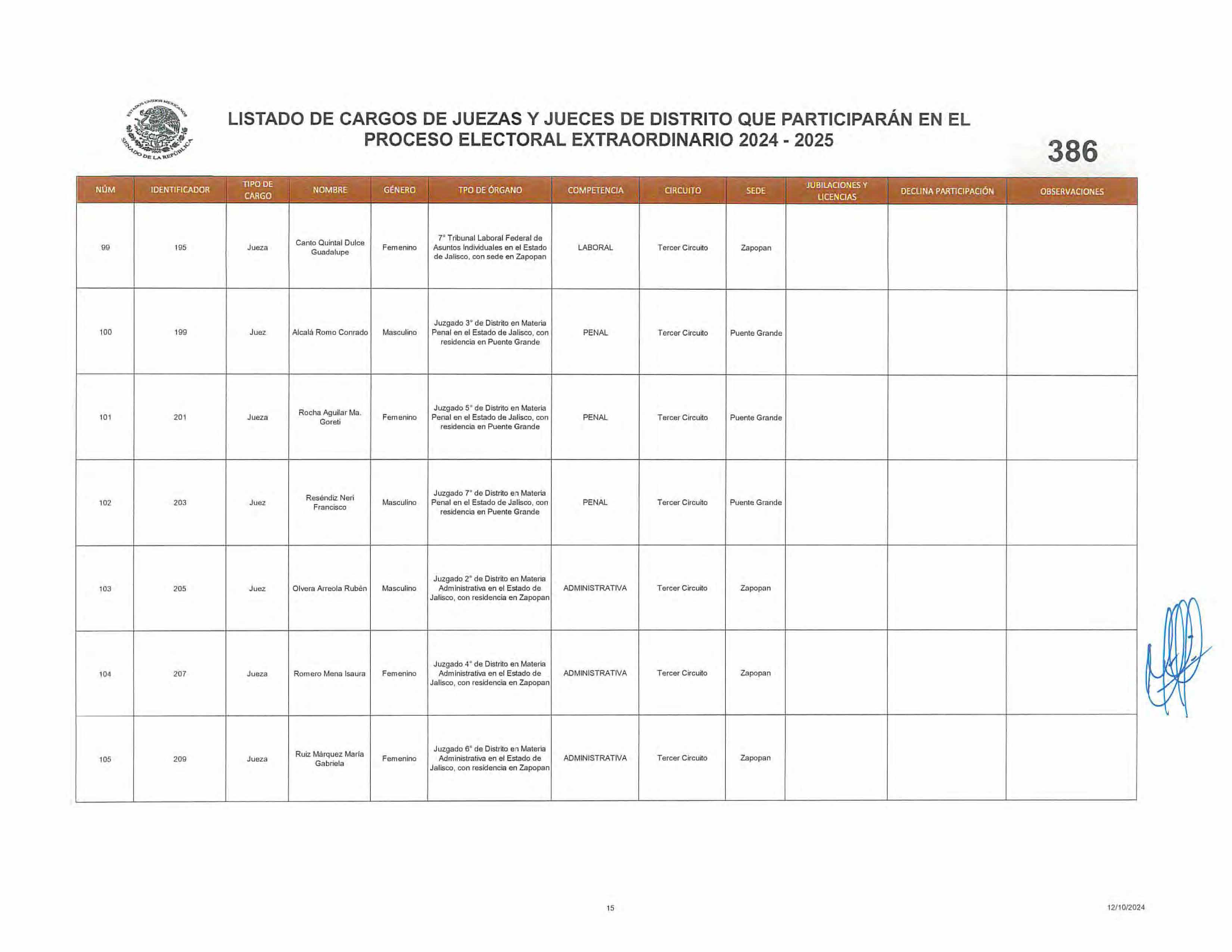 Noveno. El Presidente de la Mesa Directiva del Senado de la República, con fecha 19 de septiembre del año en curso, solicitó al Consejo de la Judicatura Federal (CJF) el listado con la totalidad de cargos de personas juzgadoras y este, en obsequio y también en acatamiento a lo previsto por el artículo segundo transitorio, párrafo cuarto, inciso a), del Decreto, remitió al Senado de la República, que lo recibió el 10 de octubre corriente, el listado con la totalidad de cargos de personas juzgadoras, indicando su circuito judicial, especialización por materia, género, vacancias por renuncia, jubilaciones y retiros programados, y la demás información que se requirió.