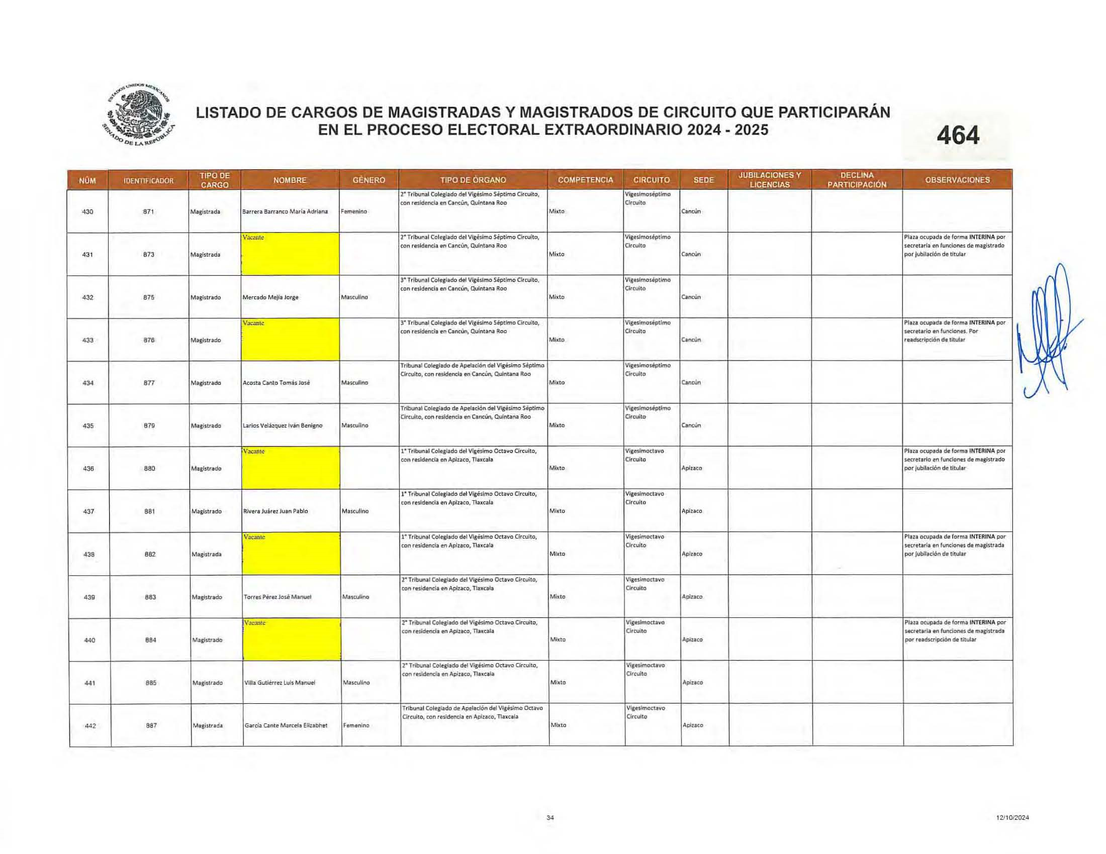 Tercero. Que mediante acuerdo INE/CG2240/2024 de 23 de septiembre de 2024, el Consejo General del Instituto Nacional Electoral (INE) emitió la declaratoria del inicio del Proceso Electoral Extraordinario del Poder Judicial de la Federación 2024-2025, en el que se elegirán los cargos de Ministras y Ministros de la Suprema Corte de Justicia de la Nación, Magistradas y Magistrados de las Salas Superior y Regionales del Tribunal Electoral del Poder Judicial de la Federación, Magistradas y Magistrados del Tribunal de Disciplina Judicial, y Magistradas y Magistrados de Circuito y Juezas y Jueces de Distrito, así como su etapa de preparación y se define la integración e instalación de los Consejos Locales.