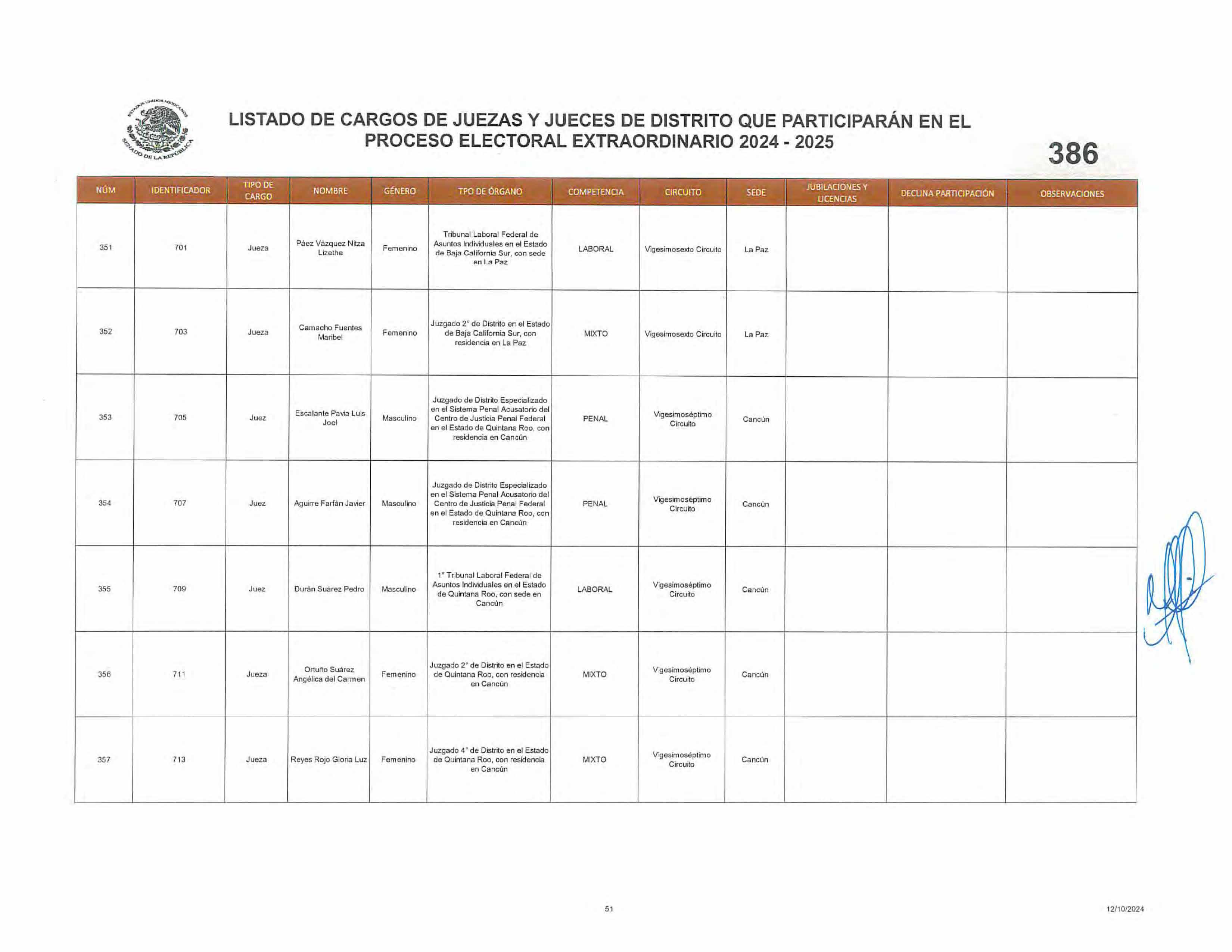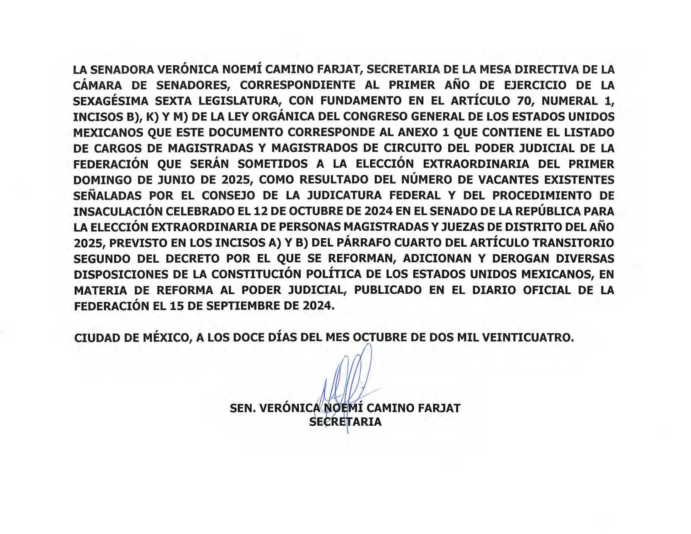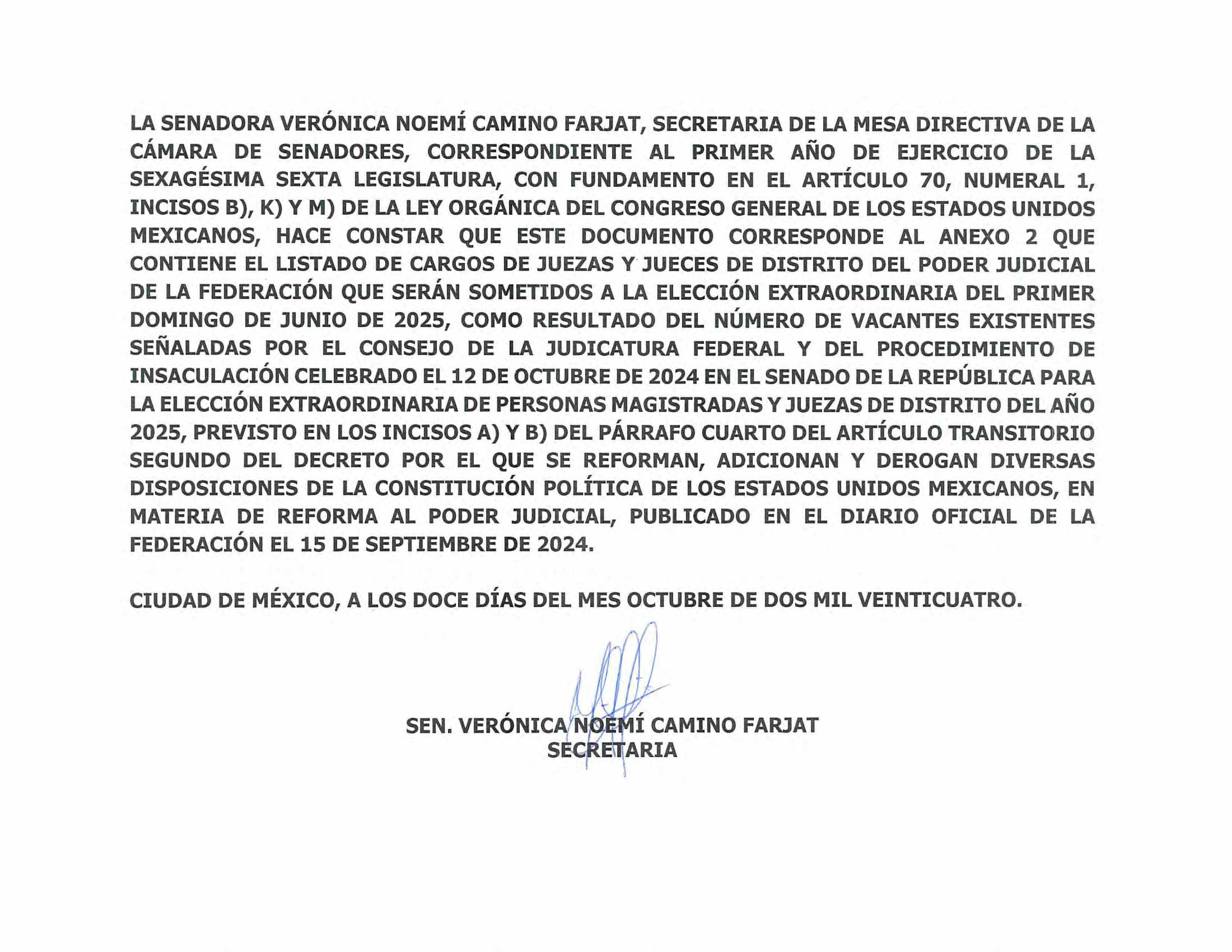 Las Secretarias de la Mesa Directiva Verónica Noemí Camino Farjat, Jasmine María Bugarín Rodríguez, Julieta Andrea Ramírez Padilla y Lizeth Sánchez García, llevaron a cabo el procedimiento de insaculación que se verificó en la sesión de Pleno del Senado de la República, donde, derivado del sorteo, se obtuvieron los cargos a elegir en la jornada electoral del 1° de junio de 2025 incluyendo previamente las plazas vacantes, reportadas por el Consejo de la Judicatura Federal conforme al antecedente Noveno de este Acuerdo.