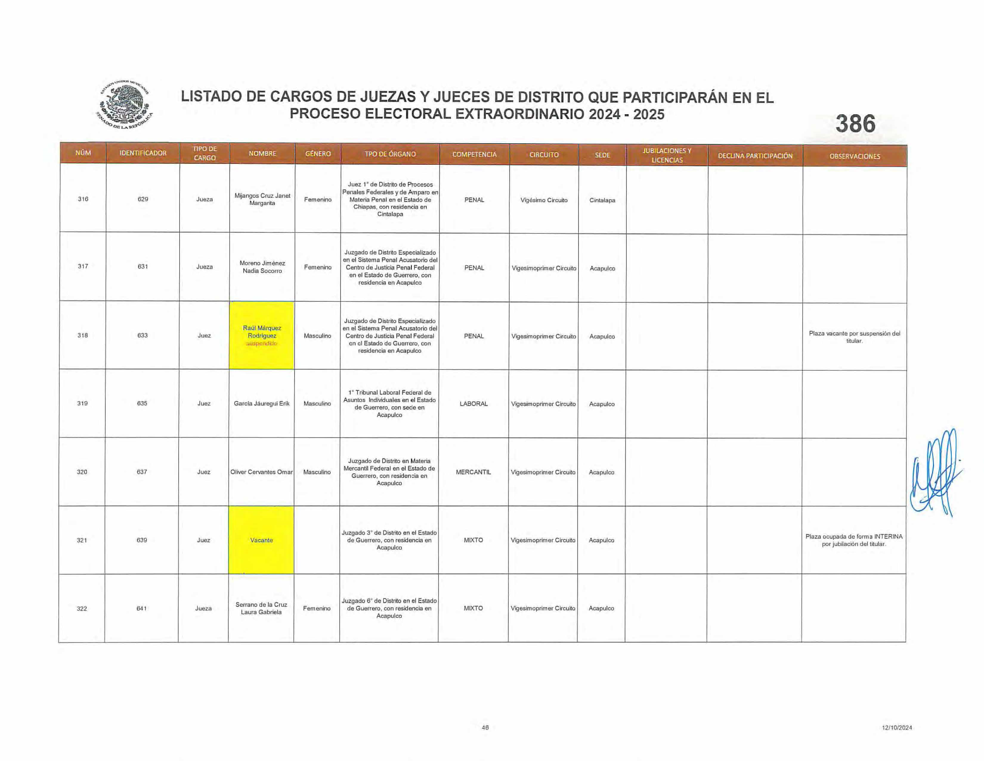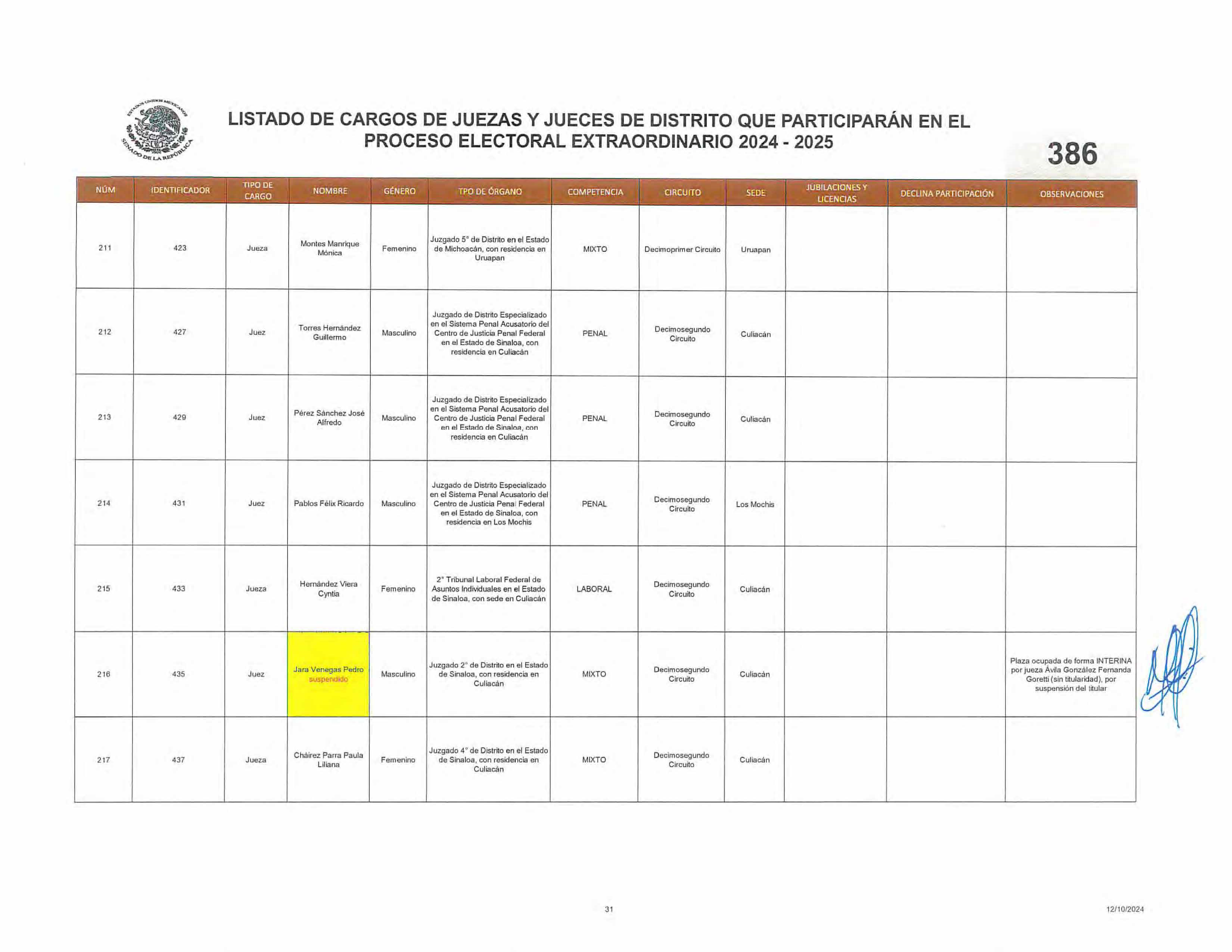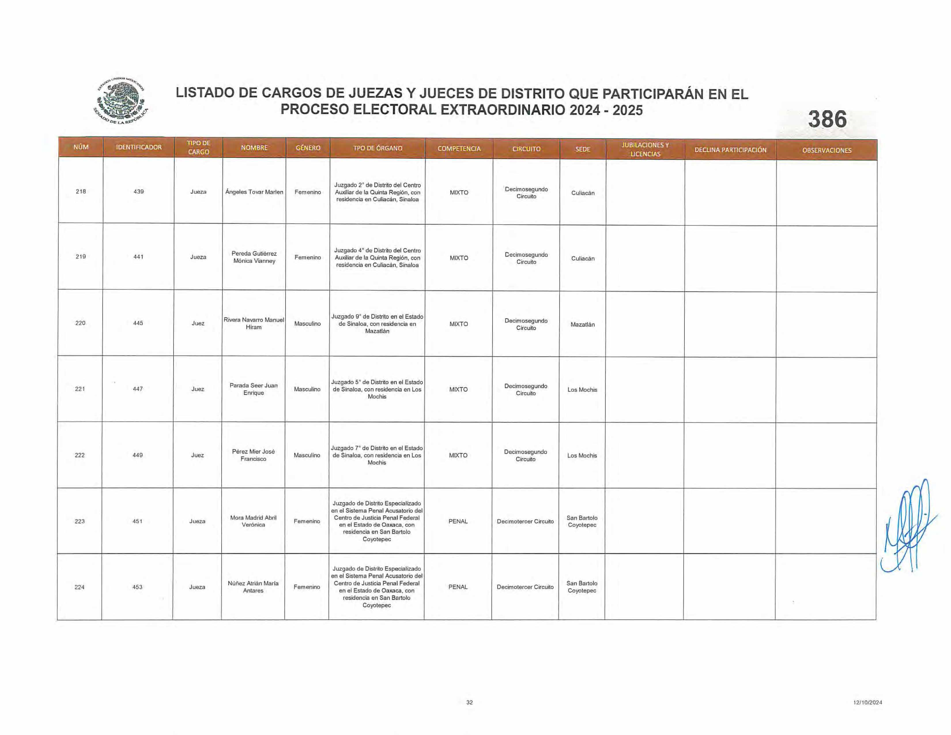 Las Secretarias de la Mesa Directiva Verónica Noemí Camino Farjat, Jasmine María Bugarín Rodríguez, Julieta Andrea Ramírez Padilla y Lizeth Sánchez García, llevaron a cabo el procedimiento de insaculación que se verificó en la sesión de Pleno del Senado de la República, donde, derivado del sorteo, se obtuvieron los cargos a elegir en la jornada electoral del 1° de junio de 2025 incluyendo previamente las plazas vacantes, reportadas por el Consejo de la Judicatura Federal conforme al antecedente Noveno de este Acuerdo.