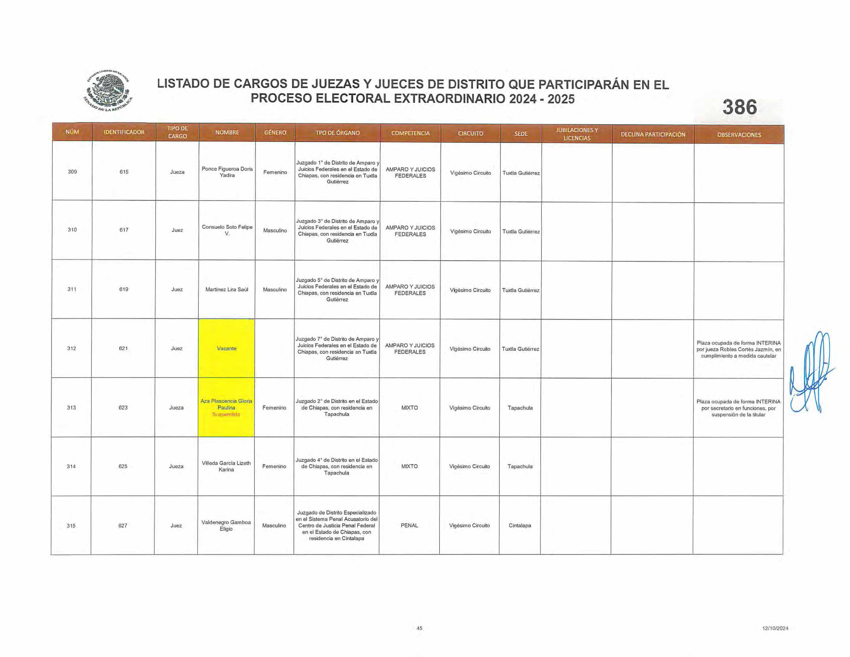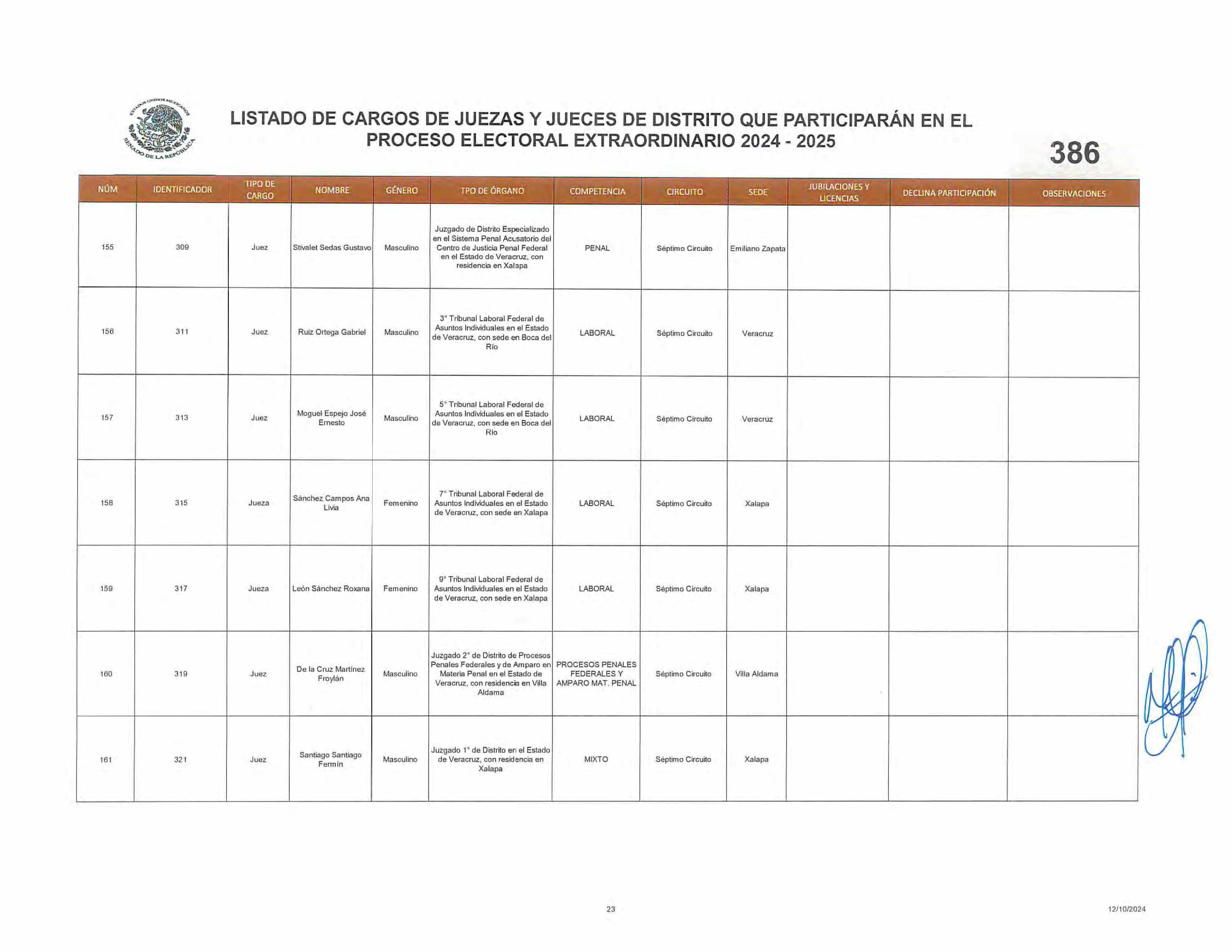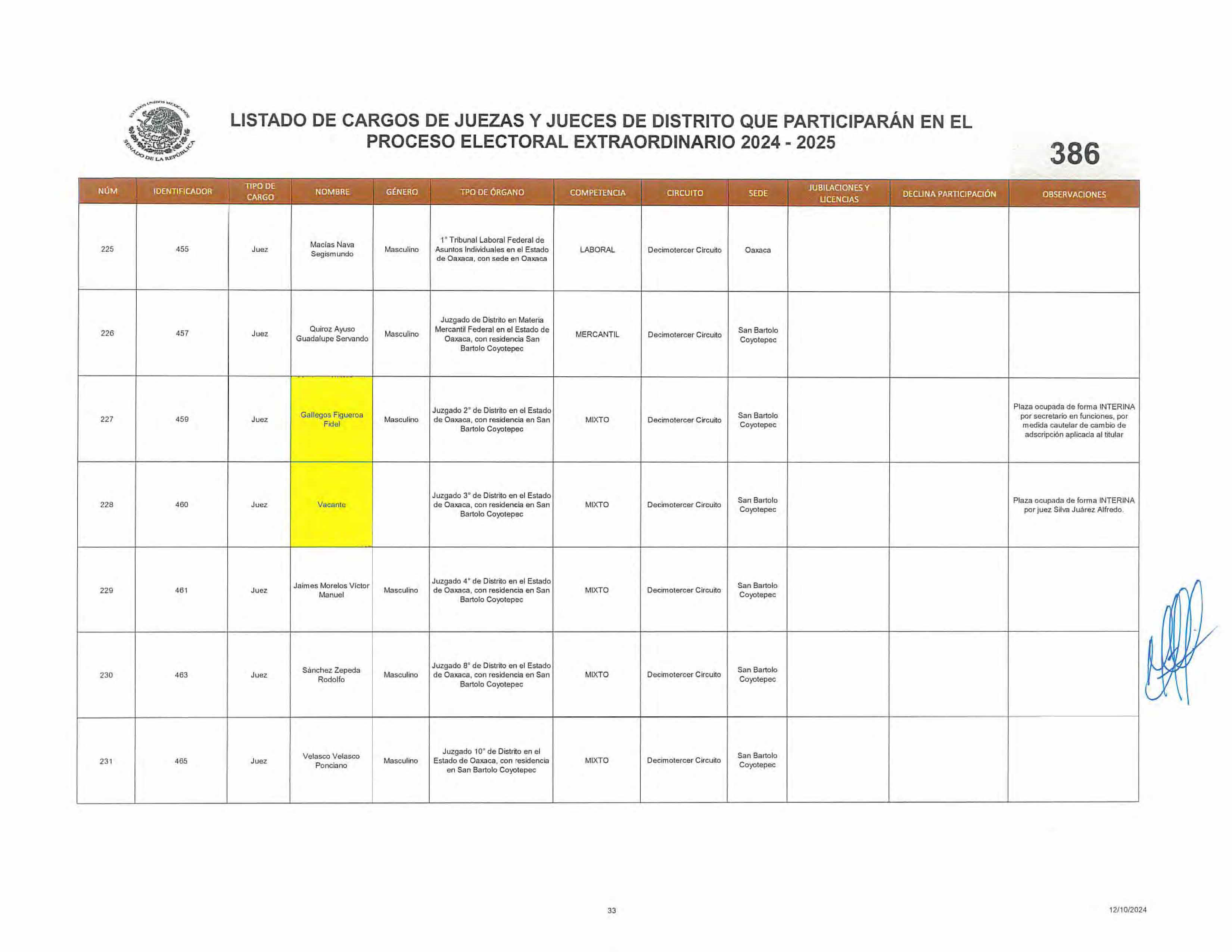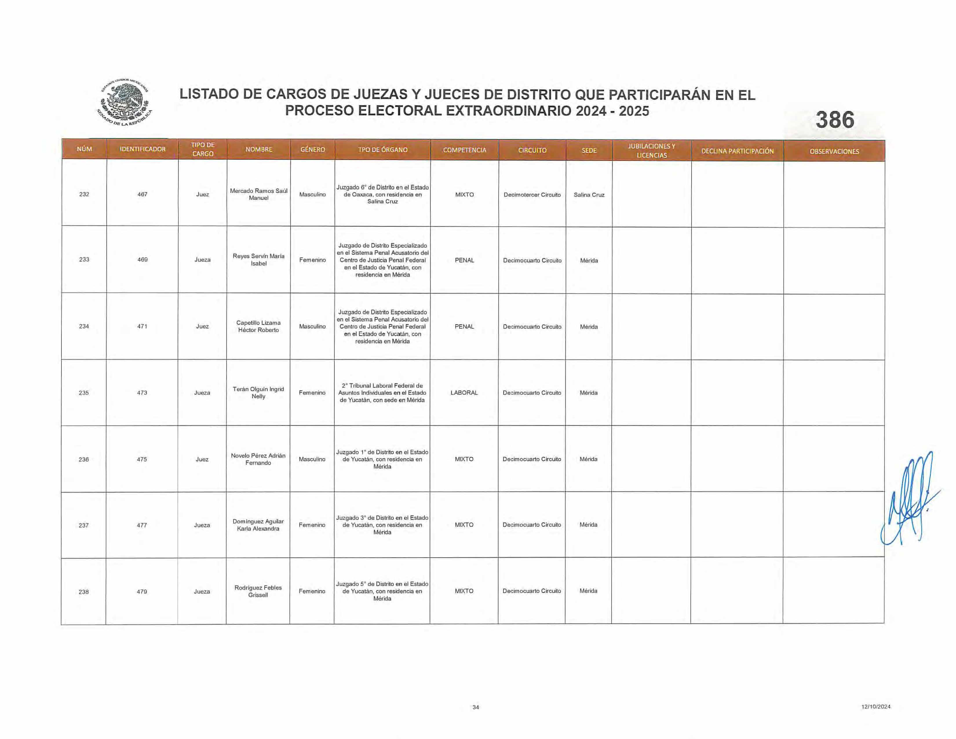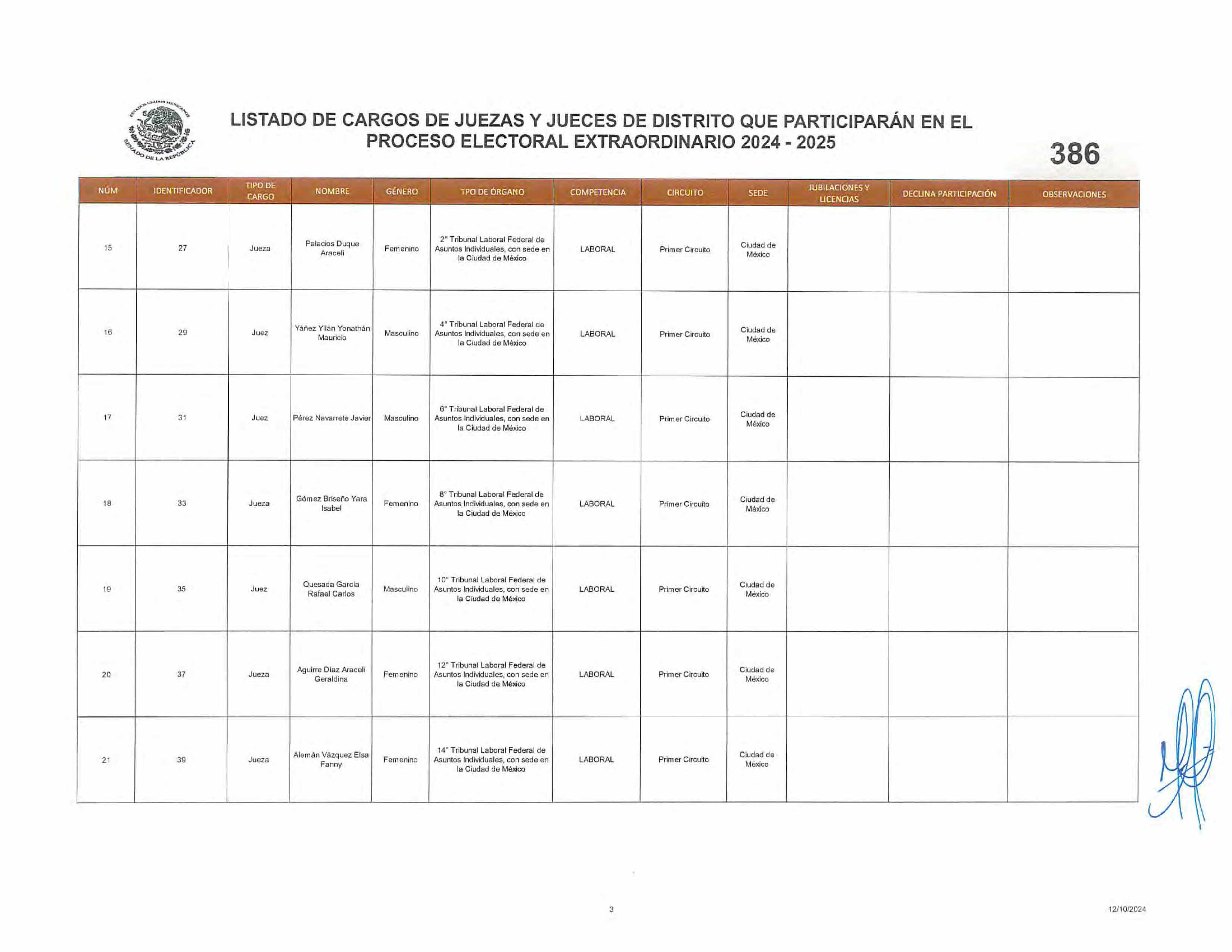 VI. Los respectivos trescientos ochenta y seis (386) cargos a elegir para Jueces y Juezas de Distrito, que se indican en cada uno de los apartados correspondientes a cada circuito judicial del país, respecto de las materias de competenciales de cada cargo, contenidos en el Anexo 2 de la presente Convocatoria.