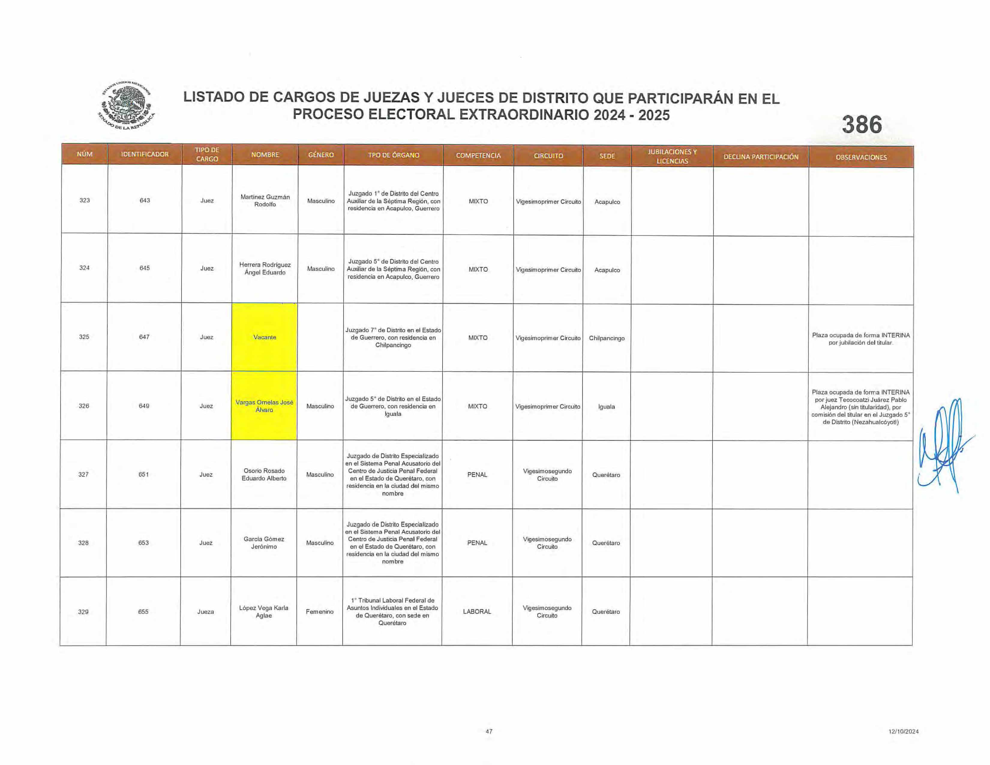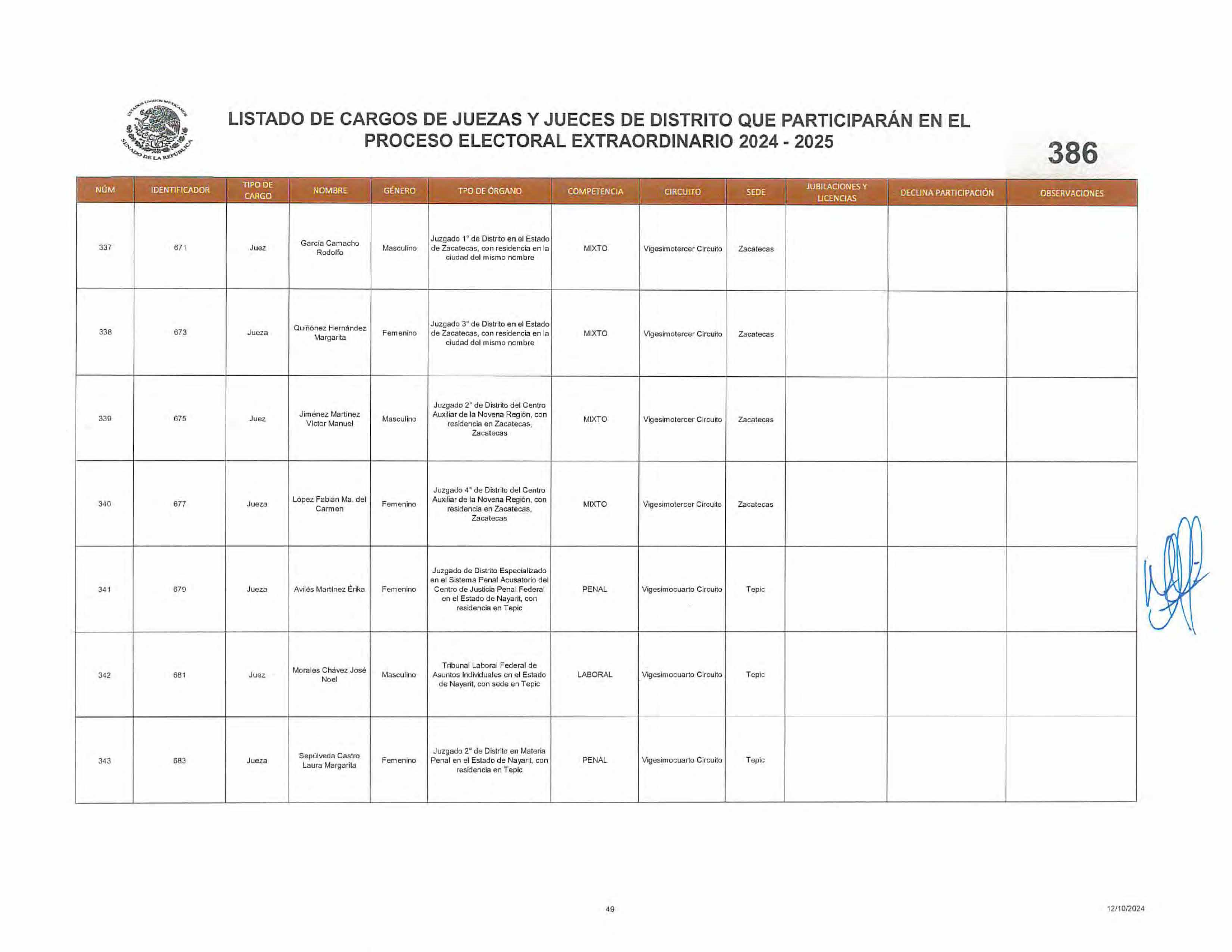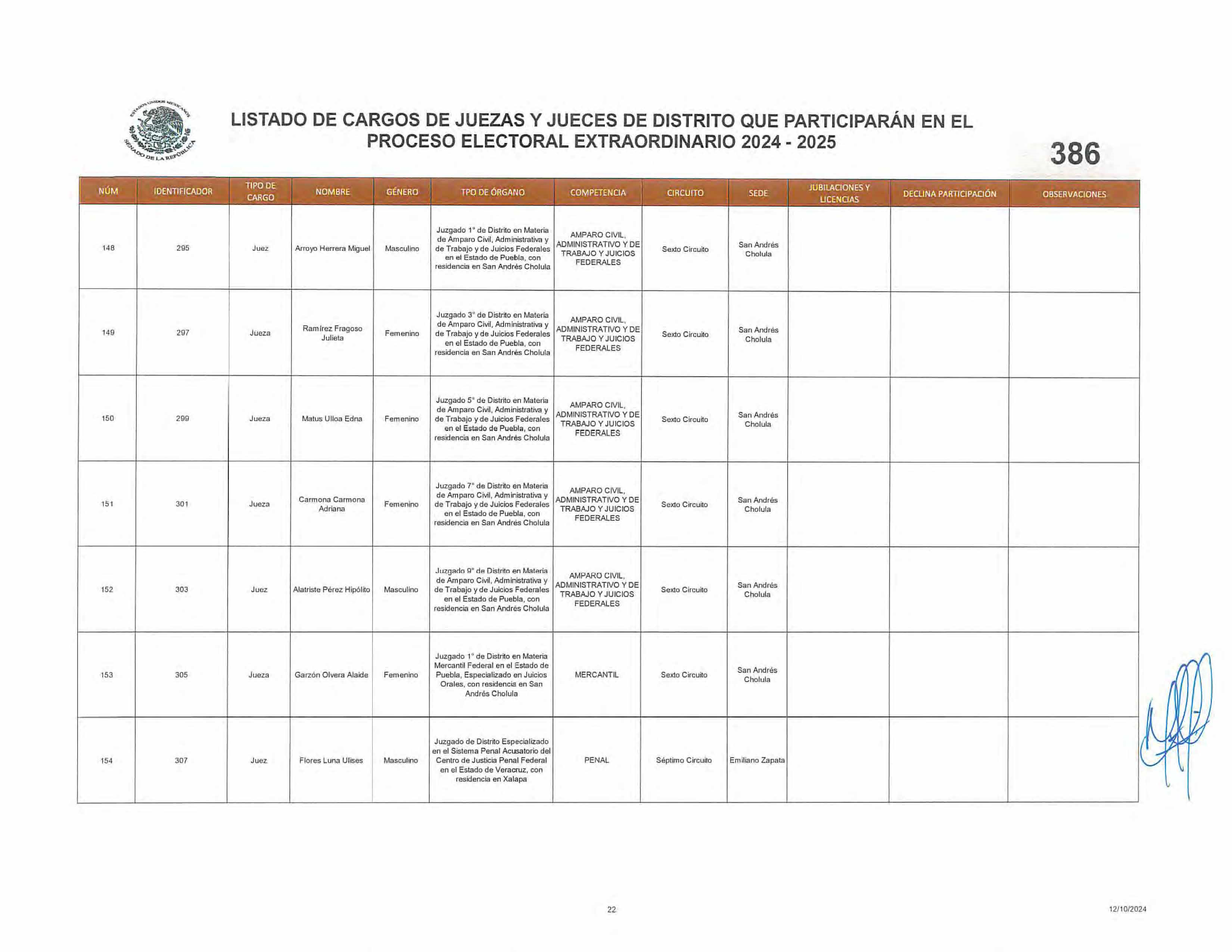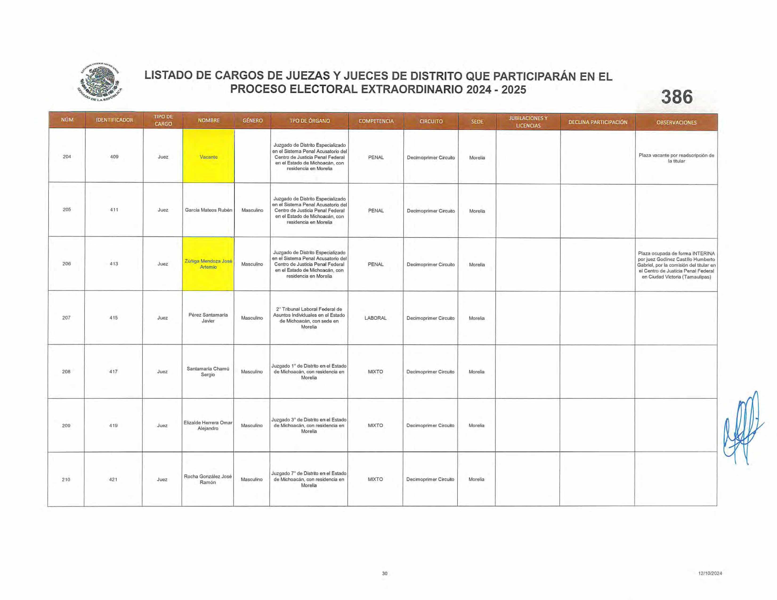 VI. Los respectivos trescientos ochenta y seis (386) cargos a elegir para Jueces y Juezas de Distrito, que se indican en cada uno de los apartados correspondientes a cada circuito judicial del país, respecto de las materias de competenciales de cada cargo, contenidos en el Anexo 2 de la presente Convocatoria.