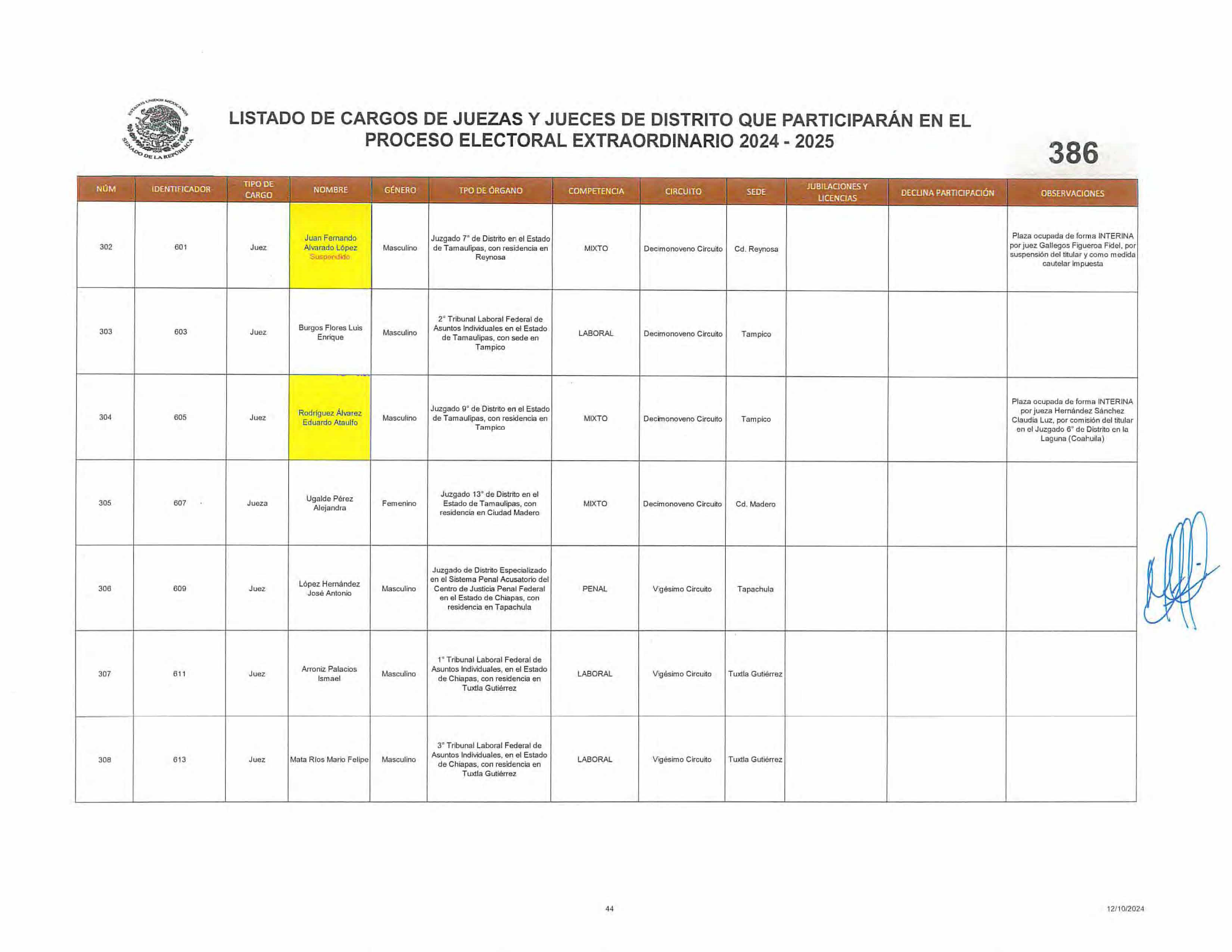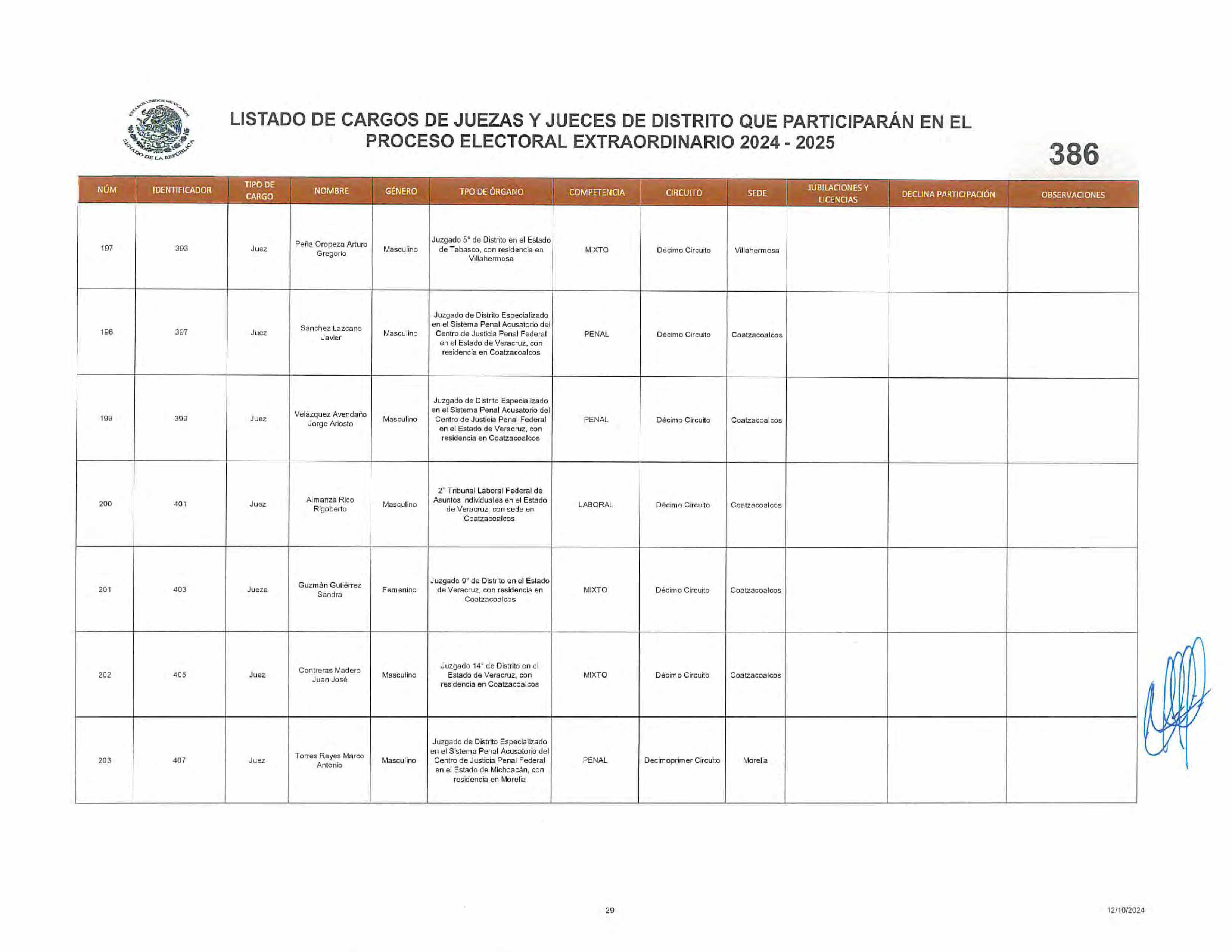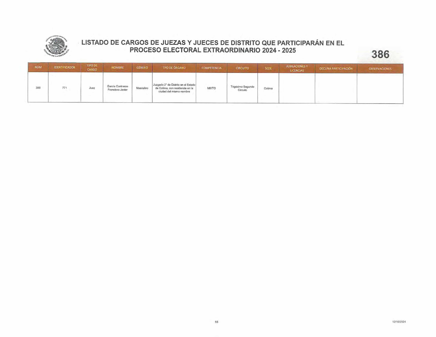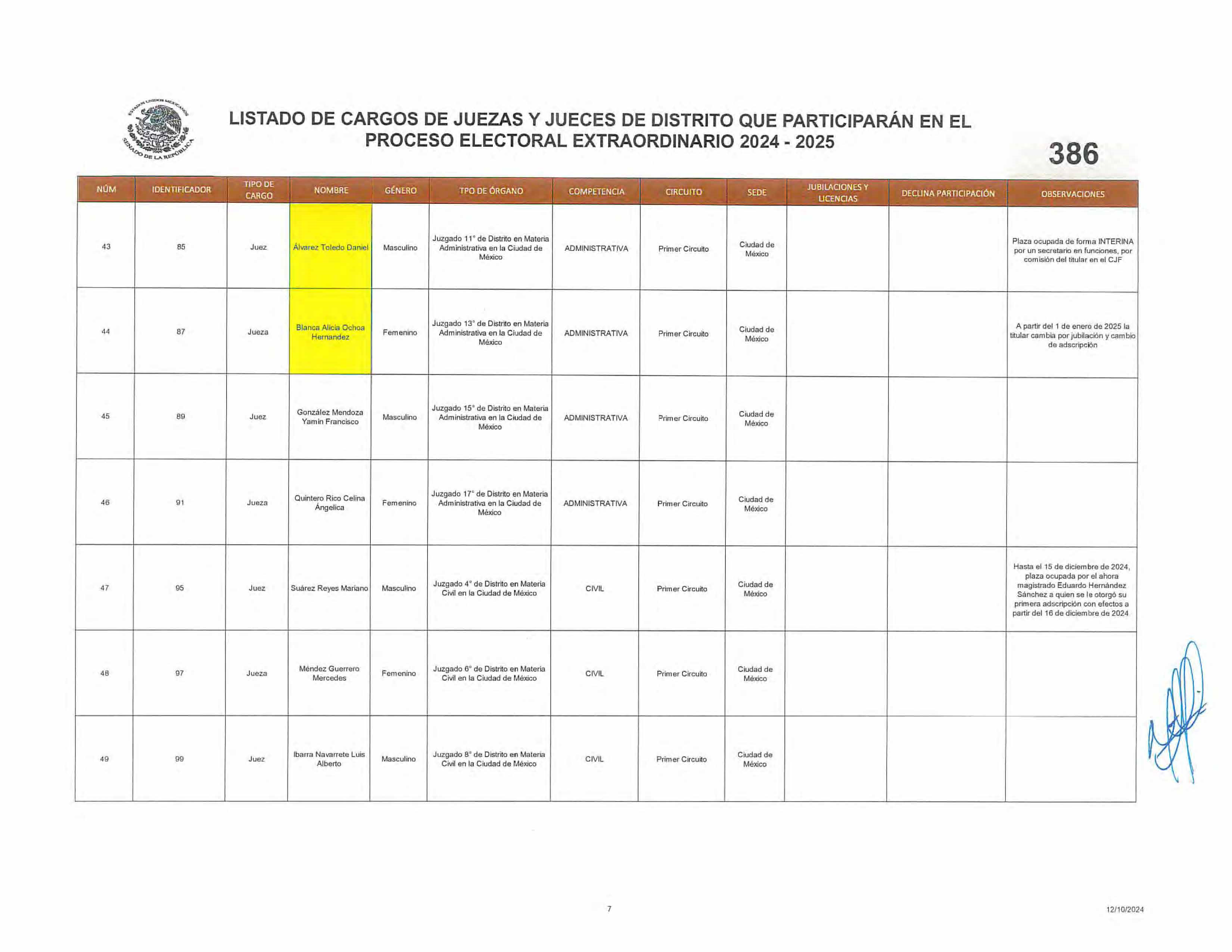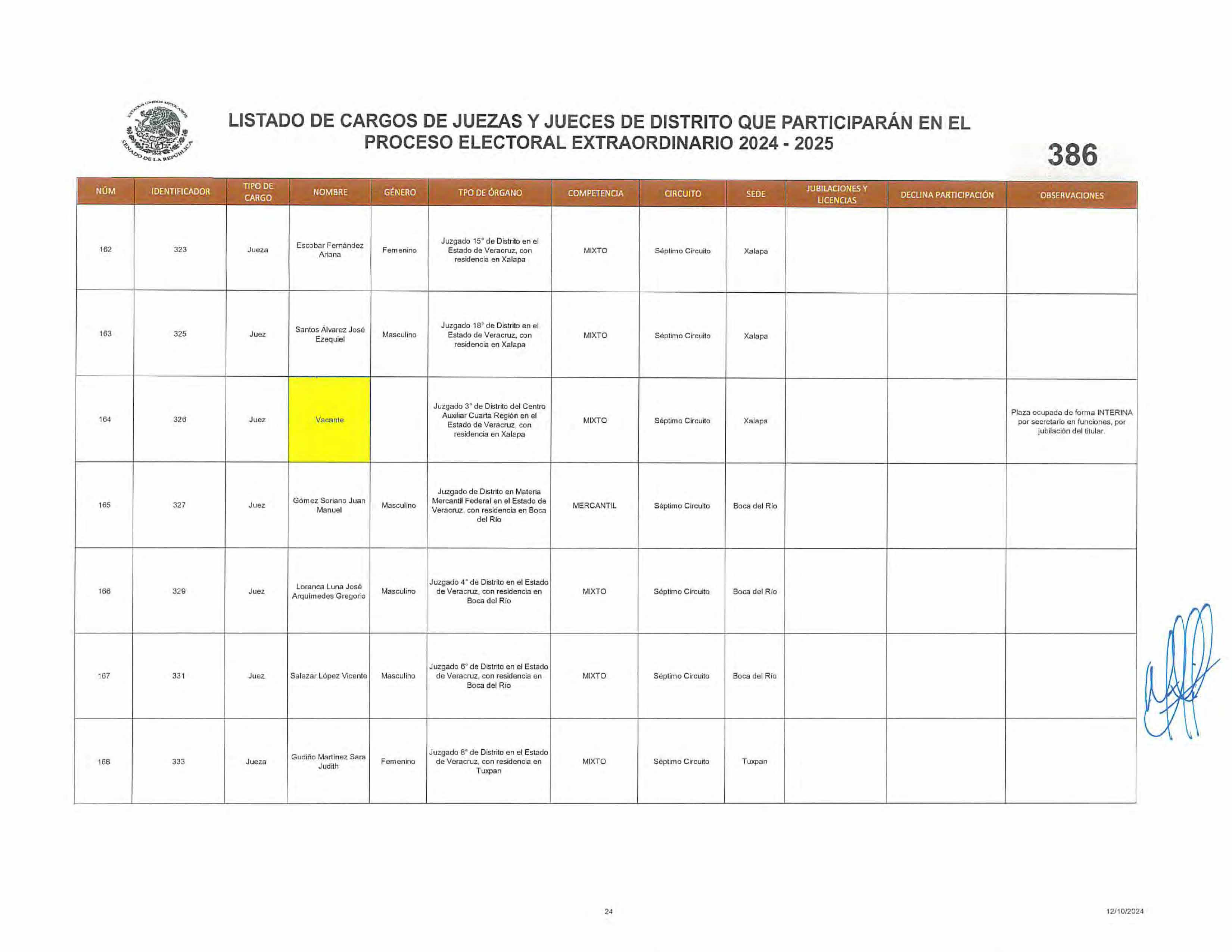 VI. Los respectivos trescientos ochenta y seis (386) cargos a elegir para Jueces y Juezas de Distrito, que se indican en cada uno de los apartados correspondientes a cada circuito judicial del país, respecto de las materias de competenciales de cada cargo, contenidos en el Anexo 2 de la presente Convocatoria.