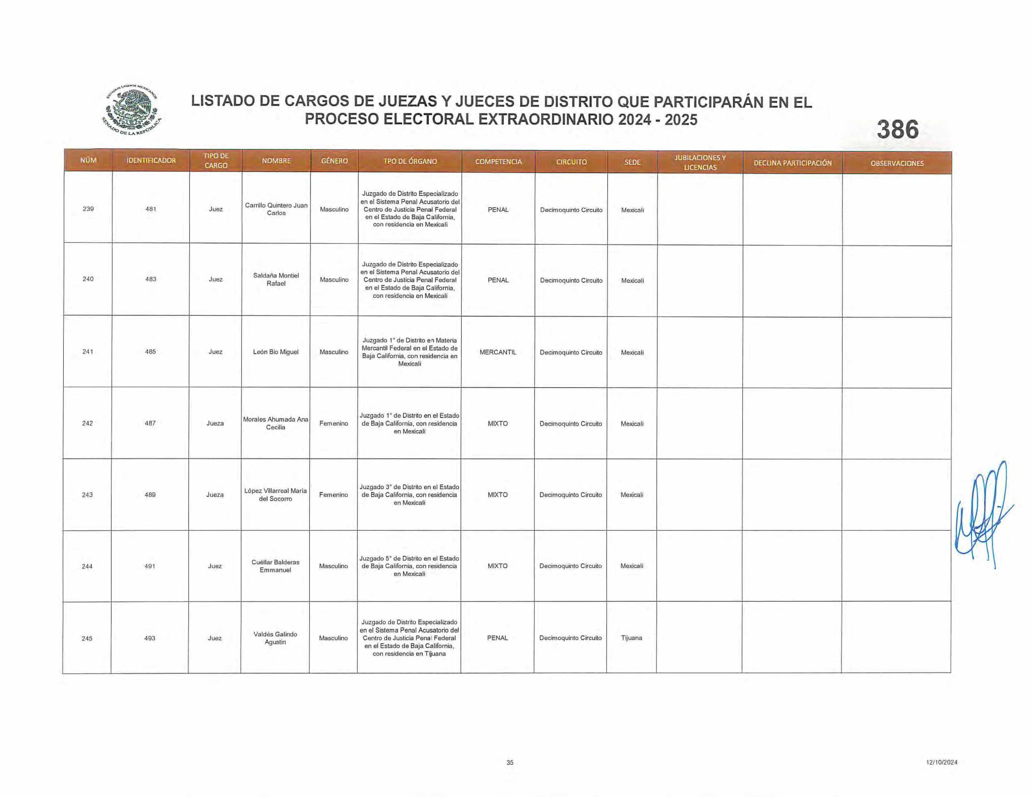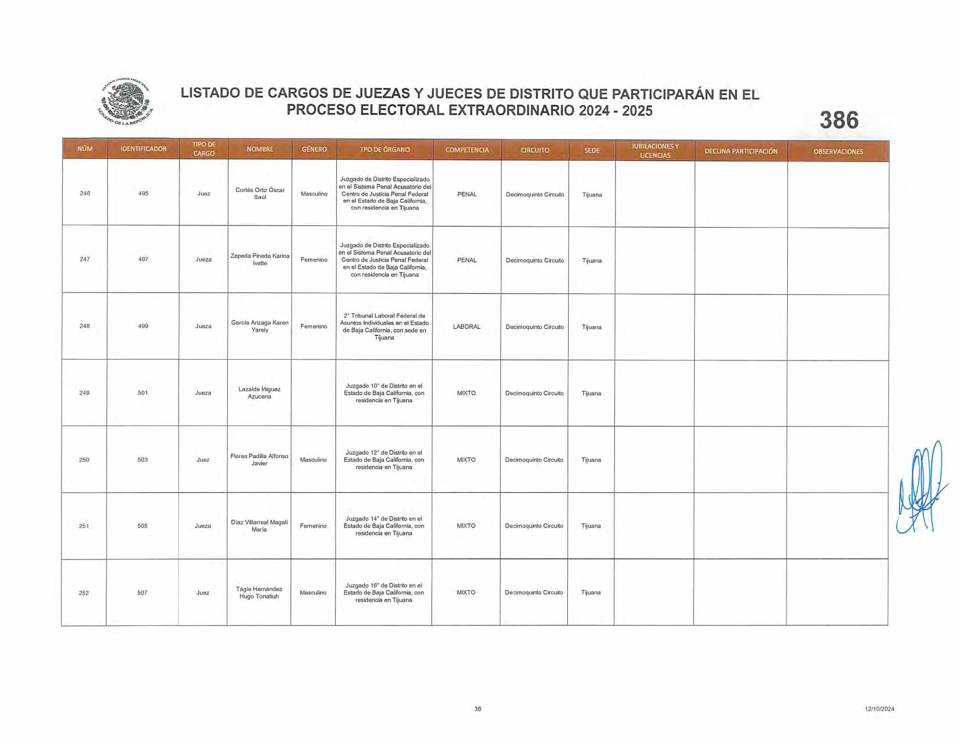 Décimo. Que en el día 10 se aprobó y el 12 de octubre de 2024 se modificó por la Cámara de Senadores el Acuerdo del Pleno del Senado de la República de insaculación para la elección extraordinaria de personas Magistradas y Juezas de Distrito del año 2025, que se instruyó para realizar lo que prevén los incisos a) y b) del párrafo cuarto del artículo transitorio segundo del Decreto por el cual se reformaron, adicionaron y derogaron diversas disposiciones de la Constitución Política de los Estados Unidos Mexicanos, en materia de reforma del Poder Judicial, publicado en el Diario Oficial de la Federación de 15 de septiembre de 2024, por el cual se establecieron las bases sobre el procedimiento, la metodología y mecánica a efecto de realizar la insaculación de cargos de personas juzgadoras federales para integrar la mitad elegible, considerando en esa porción las vacantes por cualquier causa legal, observando los principios de transparencia, máxima publicidad, certeza, legalidad, independencia, imparcialidad, objetividad y paridad de género.