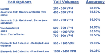 | | 4 | 2. Puntos de mejora a la norma Los comentarios a continuación atienden los temas relacionados con el objetivo de reducir los tiempos de los usuarios en el proceso de pago de peaje. Esto no quiere decir que de alguna manera se avale todo lo referente a seguridad. El tema de seguridad simplemente no se atenderá en esta nota. 2.1 Número de carriles en la plaza El inciso 6.3.1 (Diamante de transición) de la norma hace mención sobre el número de carriles que tendrá que tener la plaza de cobro. En específico hace referencia al inciso 6.1 (Análisis de la demanda) y el tipo de estudios y análisis que se deberán realizar y el horizonte de éstos. Se menciona que la capacidad de la plaza de cobro estará determinada por la combinación del número de carriles de cobro, así como por los tiempos de transacción. La norma sin embargo no especifica tiempos máximos de espera en la plaza. En efecto el documento LINEAMIENTOS GENERALES QUE DEBERÁ CUMPLIR EL SISTEMA DE CONTROL DE PEAJE DEL PROYECTO publicado por la entonces Secretaría de Comunicaciones y Transportes en noviembre de 2004 y que forma parte de los anexos de los títulos de concesión desde aquella fecha, cuenta con mucho más detalle que el proyecto de norma aquí atendida y especifica que el tiempo de espera en las estaciones de cobro no puede exceder tres minutos por cada 50km de carretera. Sin embargo, ni el proyecto de norma ni los LINEAMIENTOS son claros en las consecuencias de incumplimiento ni los mecanismos para asegurar su cumplimiento. Por ello, no es difícil encontrar plazas de cobro en los que el tiempo de espera excede en mucho el límite ya mencionado. No existe nada en el proyecto de norma que haga que esta situación cambie. Dentro del mismo punto 6.3.1, se sugiere homologar un método para estimar el área necesaria de construcción de la zona de carriles, un ejemplo puede ser el siguiente: ![]() Aunado a lo anterior, y tratando de complementar la siguiente oración: "que la capacidad de la plaza de cobro estará determinada por la combinación del número de carriles de cobro, así como por los tiempos de transacción". Se sugiere definir capacidades mínimas o máximas (Umbrales) por tipo de carril, con ello el proyectista podrá contar con una referencia de comparación y definición respecto a su estudio de demanda, un ejemplo podría ser el que se muestra en la Figura: ![]() | 2.1 Los tiempos máximos de espera a los que hace referencia el promovente están establecidos en el capítulo 7 Eficiencia operativa, en el cual se señala que: " ... se deberán establecer los sistemas que permitan a los usuarios no demorar por efecto de pago de peajes más de tres (3) minutos o permanecer en el carril de cobro más allá de la zona de aproximación ...". Dicho tiempo de espera o la distancia de la zona de aproximación indicada, es independiente de los kilómetros, como lo señala el promovente, pues lo que pretende regular el proyecto de NOM es que no existan vehículos en la zona de aproximación o, si los hay, que en número sean muy pocos y que estos permanezcan muy corto tiempo, a fin de disminuir la probabilidad de que eventualmente puedan ser impactados por un vehículo fuera de control. No procede Sobre las consecuencias de incumplimiento de la NOM y de los mecanismos para asegurar su cumplimiento, independientemente de que el proyecto de NOM no considere dichas consecuencias, la Ley de Infraestructura de la Calidad, en su artículo 3, fracción XII, establece que las Autoridades Normalizadoras, léase la SICT, cuentan con la atribución de imponer diversas sanciones por incumplimientos a esta Ley y a las disposiciones que emanen de ella, como son las NOMs. Por lo que toca a los mecanismos para asegurar el cumplimiento de la NOM, el proyecto de NOM contempla el capítulo 13 Evaluación de la Conformidad, previsto también por la Ley, que es el proceso técnico que permite demostrar el cumplimiento con las NOMs. No procede Respecto a la sugerencia de homologar un método para estimar el área necesaria de construcción de la zona de carriles, en particular el ejemplo que propone el promovente: El establecer en el proyecto de NOM el método para calcular el área del diamante de transición, dada su simpleza, no se considera que agregue valor a la regulación. El ejemplo no incluye las áreas de aproximación y de aceleración, lo que podría crear confusión en el usuario de la NOM. No procede Sobre la sugerencia para definir capacidades mínimas o máximas (Umbrales) por tipo de carril, con ello el proyectista podrá contar con una referencia de comparación y definición respecto a su estudio de demanda, el inciso 5.3 Modalidades de cobro del proyecto de NOM ya contempla las capacidades de cruce/carril de hasta 300 veh/h para la modalidad de pago manual, de 600 a 700 veh/h para la modalidad de pago mixto (manual y telepeaje), y de 900 a 1 200 veh/h para la modalidad de pago exclusivo con telepeaje. Si bien el pago a través de moneda o bien mediante el sistema denominado Free Flow que aparecen en el ejemplo del promovente, son prácticamente inexistentes en el país, se considera pertinente agregar al inciso 5.3.1. la capacidad de cruce/carril que incluya, en los sistemas cerrados, la entrega de la tarjeta electrónica en el punto de entrada a la carretera. En el contexto nacional, donde el establecimiento de modalidades de cobro de circulación continua tipo Free Flow para eliminar la interferencia que constituyen las plazas de cobro en las condiciones normales de tránsito, si bien es lo deseable, no parece ser factible en el corto plazo. Procede parcialmente | 5.3.1. Carriles con pago manual: el usuario hace el pago del peaje en efectivo, asistido por personal en las casetas de cobro, una vez clasificado su vehículo en el sistema de control de tránsito, y se emite un boleto de pago con la información de la plaza de cobro, el carril, la tarifa, el día y la hora de la transacción. Esta form