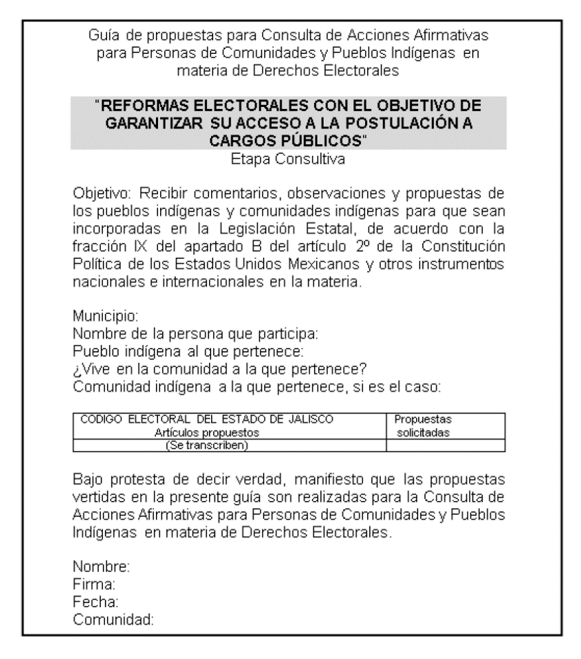Primero. Consultas a las personas con discapacidad y a los pueblos y las comunidades indígenas y afromexicanas. Previo a expedir el decreto de reformas impugnado, se llevó a cabo todo un proceso de preconsulta y consulta, en coordinación con el Instituto Electoral y de Participación Ciudadana del Estado de Jalisco, a través de foros y espacios de carácter informativos y de diálogo incluyente, con la participación de asociaciones, representación de comunidades indígenas, de grupos con discapacidad, autoridades e investigadores. En particular, el Poder Legislativo Estatal se avocó a la realización de lo siguiente: a) Invitó a grupos de comunidades indígenas y de personas con discapacidad a participar en las fases informativas, de preconsulta y consulta, las que sirvieron de base para la aprobación de la metodología y la temática a desarrollar en los foros de consulta; b) Envió oficios y correos electrónicos a los municipios del Estado a efecto de informar y solicitar el apoyo para la difusión y la participación de los grupos vulnerables; c) Creó micrositios para consulta y difusión de información, así como para solicitar la participación de estos colectivos; d) Tradujo la iniciativa del Decreto a las lenguas indígenas náhuatl, wixarika, otomí, purépecha, mixteco y mazhua, asimismo, subió al micrositio la citada iniciativa de Decreto en formato de video de interpretación, audio, texto de fácil lectura, lenguaje a señas mexicanas, así como en pictogramas, con sus respectivas traducciones a náhuatl y wixarika; e) En las sesiones de consulta abierta celebradas en los municipios de la entidad, se contó con la colaboración de traductores de lenguas indígenas y de señas, recibiéndose recomendaciones, propuestas y opiniones, asimismo, se subió al micrositio los videos que contienen las sesiones llevadas a cabo; f) Las convocatorias para las consultas se publicaron en medios de comunicaciones masivos y electrónicos, en particular, en diversos medios de prensa escrita; y g) de manera oportuna y por canales diversos se difundió la fecha de celebración de la sesión plenaria en la que se aprobó el Decreto de reformas impugnado.