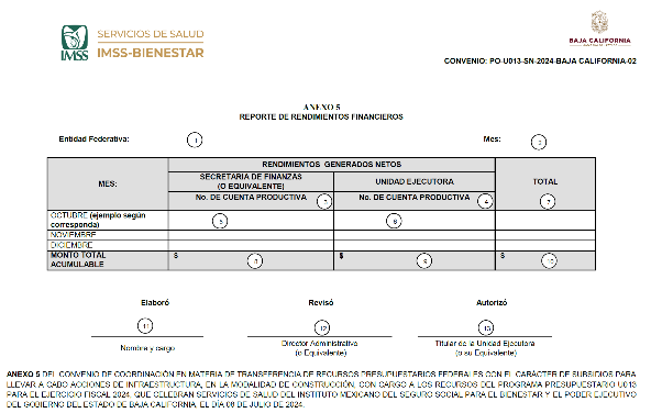 Nota: La Unidad Ejecutora deberá de presentar de manera mensual el registro y control del Formato "Reporte de Rendimientos Financieros" ante el administrador del contrato, acompañado de los estados de cuenta bancarios de la Secretaría de Finanzas (o su equivalente) y de la Unidad Ejecutora.