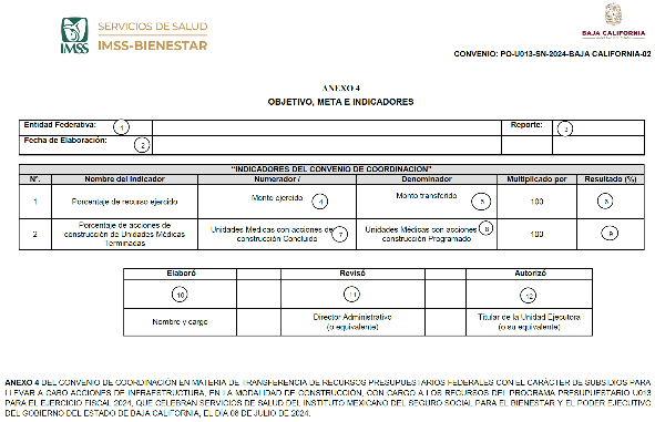 ANEXO 4 DEL CONVENIO DE COORDINACIÓN EN MATERIA DE TRANSFERENCIA DE RECURSOS PRESUPUESTARIOS FEDERALES CON EL CARÁCTER DE SUBSIDIOS PARA LLEVAR A CABO ACCIONES DE INFRAESTRUCTURA, EN LA MODALIDAD DE CONSTRUCCIÓN, CON CARGO A LOS RECURSOS DEL PROGRAMA PRESUPUESTARIO U013 PARA EL EJERCICIO FISCAL 2024, QUE CELEBRAN SERVICIOS DE SALUD DEL INSTITUTO MEXICANO DEL SEGURO SOCIAL PARA EL BIENESTAR Y EL PODER EJECUTIVO DEL GOBIERNO DEL ESTADO DE BAJA CALIFORNIA, EL DÍA 08 DE JULIO DE 2024.