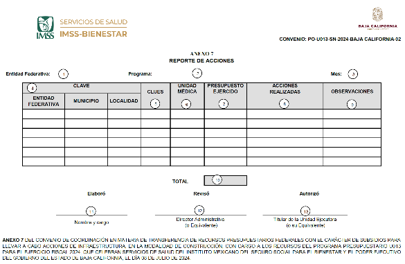 ANEXO 7 DEL CONVENIO DE COORDINACIÓN EN MATERIA DE TRANSFERENCIA DE RECURSOS PRESUPUESTARIOS FEDERALES CON EL CARÁCTER DE SUBSIDIOS PARA LLEVAR A CABO ACCIONES DE INFRAESTRUCTURA, EN LA MODALIDAD DE CONSTRUCCIÓN, CON CARGO A LOS RECURSOS DEL PROGRAMA PRESUPUESTARIO U013 PARA EL EJERCICIO FISCAL 2024, QUE CELEBRAN SERVICIOS DE SALUD DEL INSTITUTO MEXICANO DEL SEGURO SOCIAL PARA EL BIENESTAR Y EL PODER EJECUTIVO DEL GOBIERNO DEL ESTADO DE BAJA CALIFORNIA, EL DÍA 08 DE JULIO DE 2024.