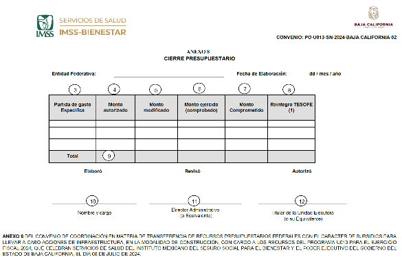 ANEXO 8 DEL CONVENIO DE COORDINACIÓN EN MATERIA DE TRANSFERENCIA DE RECURSOS PRESUPUESTARIOS FEDERALES CON EL CARÁCTER DE SUBSIDIOS PARA LLEVAR A CABO ACCIONES DE INFRAESTRUCTURA, EN LA MODALIDAD DE CONSTRUCCIÓN, CON CARGO A LOS RECURSOS DEL PROGRAMA PRESUPUESTARIO U013 PARA EL EJERCICIO FISCAL 2024, QUE CELEBRAN SERVICIOS DE SALUD DEL INSTITUTO MEXICANO DEL SEGURO SOCIAL PARA EL BIENESTAR Y EL PODER EJECUTIVO DEL GOBIERNO DEL ESTADO DE BAJA CALIFORNIA, EL DÍA 08 DE JULIO DE 2024.