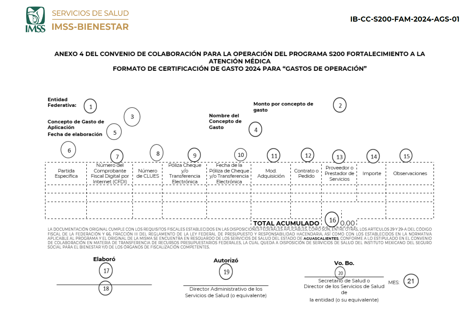 | 4 | Nombre del Concepto de Gasto (de conformidad con el Clasificador por Objeto del Gasto para la APF) | | 15 | Observaciones Generales |