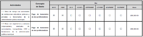 | 1. Planificar de forma trasversal las actividades de intervención con actores estratégicos para el desarrollo, monitoreo y evaluación de la estrategia de intervención. | 1.1 Mesa de trabajo con autoridades de instituciones educativas públicas y privadas y funcionarios de la administración pública municipal. 1.2 Mesa con organismos y cámaras empresariales, sindicatos de comerciantes, transportistas, OSC y funcionarios de la administración pública municipal. 1.3 Mesa con personal de la administración pública municipal y estatal. | 1. Número de instituciones convocadas / número de instituciones participantes 2. Número de mesas de trabajo programadas / número de mesas de trabajo implementadas. | 1. Listas de asistencia minutas de reunión memorias fotográficas 2. Informe de actividad 3. Evaluación de la actividad 4. Actas de acuerdo de reuniones. |
