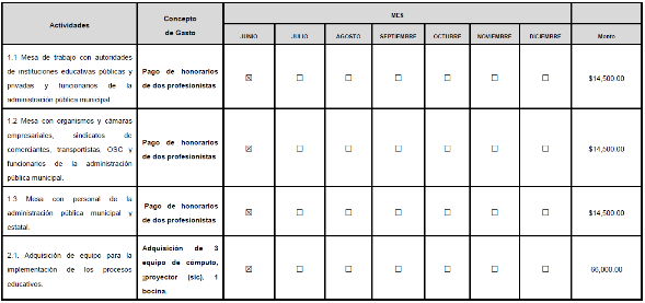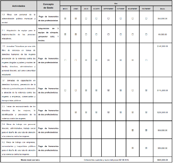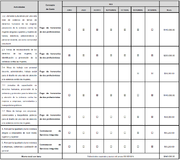 | 2. Poner en marcha las actividades de intervención en materia de perspectiva de género, derechos de las mujeres, nuevas masculinidades y prevención de la violencia en instituciones educativas públicas y privadas. | 2.1. Adquisición de equipo de cómputo, video proyección y audio para la implementación de las jornadas educativas. 2.2. Jornadas Educativas por una vida libre de violencia en temas de derechos humanos prevención de la violencia contra las mujeres dirigidas a padres y madres de familia, directivos, administrativos y personal docente; así como comunidad estudiantil. 2.3. Ferias de reconocimiento de los derechos de las mujeres, la identificación y prevención de la violencia contra las mujeres 2.4. Mesa de trabajo con personal docente, administrativo, trabajo social, para la implementación de acciones para la detección y atención a la violencia contra mujeres niñas y adolescentes. | 1. Número de equipos adquirido / número de equipo en resguardo. 2. Número de personas que participan en el proceso / Número de personas que concluyen el proceso por grupo etario, desagregado por sexo y edad. | 1. Listas de asistencia minutas de reunión memorias fotográficas. 2. Informe de actividad. 3. Evaluación de la actividad. |