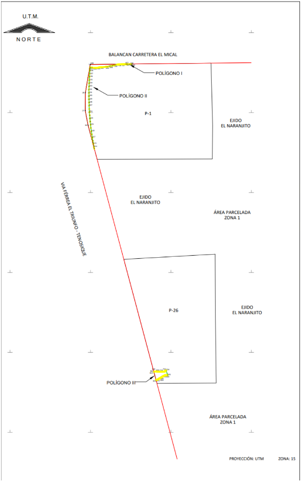 IV. Que, de diversos documentos contenidos en el expediente de expropiación número DGOPR-DE/SOE-27TB/0038 FONATUR TREN MAYA, S.A. DE C.V./2023, se advierte que la superficie que se solicitó expropiar al ejido "El Naranjito" fue 01-24-76.14 ha; sin embargo, una vez realizados los trabajos técnicos, resultó que la superficie real es de 01-25-26 ha de uso parcelado, como consta en el informe de comisión de Trabajos Técnicos e Informativos de Expropiación, referido en el resultando 21, motivo por el cual la superficie a expropiar al ejido "El Naranjito", municipio de Balancán, estado de Tabasco debe ser de 01-25-26 ha;