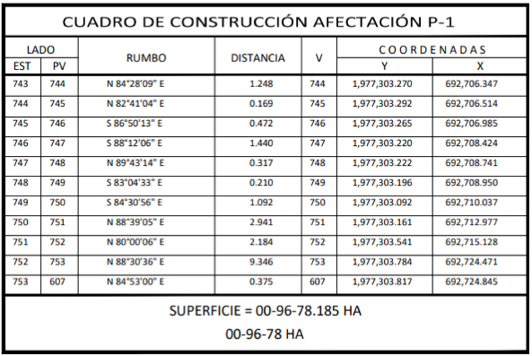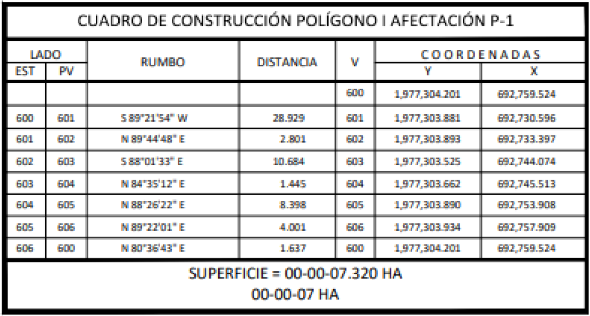 21. Que el comisionado técnico del RAN y el comisionado agrario de la Sedatu rindieron el "informe de comisión de Trabajos Técnicos e Informativos de Expropiación", de 21 de julio de 2023, en el que señalan que la superficie real a expropiar al ejido "El Naranjito", municipio de Balancán, estado de Tabasco es de 01-25-26 ha de uso parcelado, que se describen en el siguiente plano y cuadros de construcción: