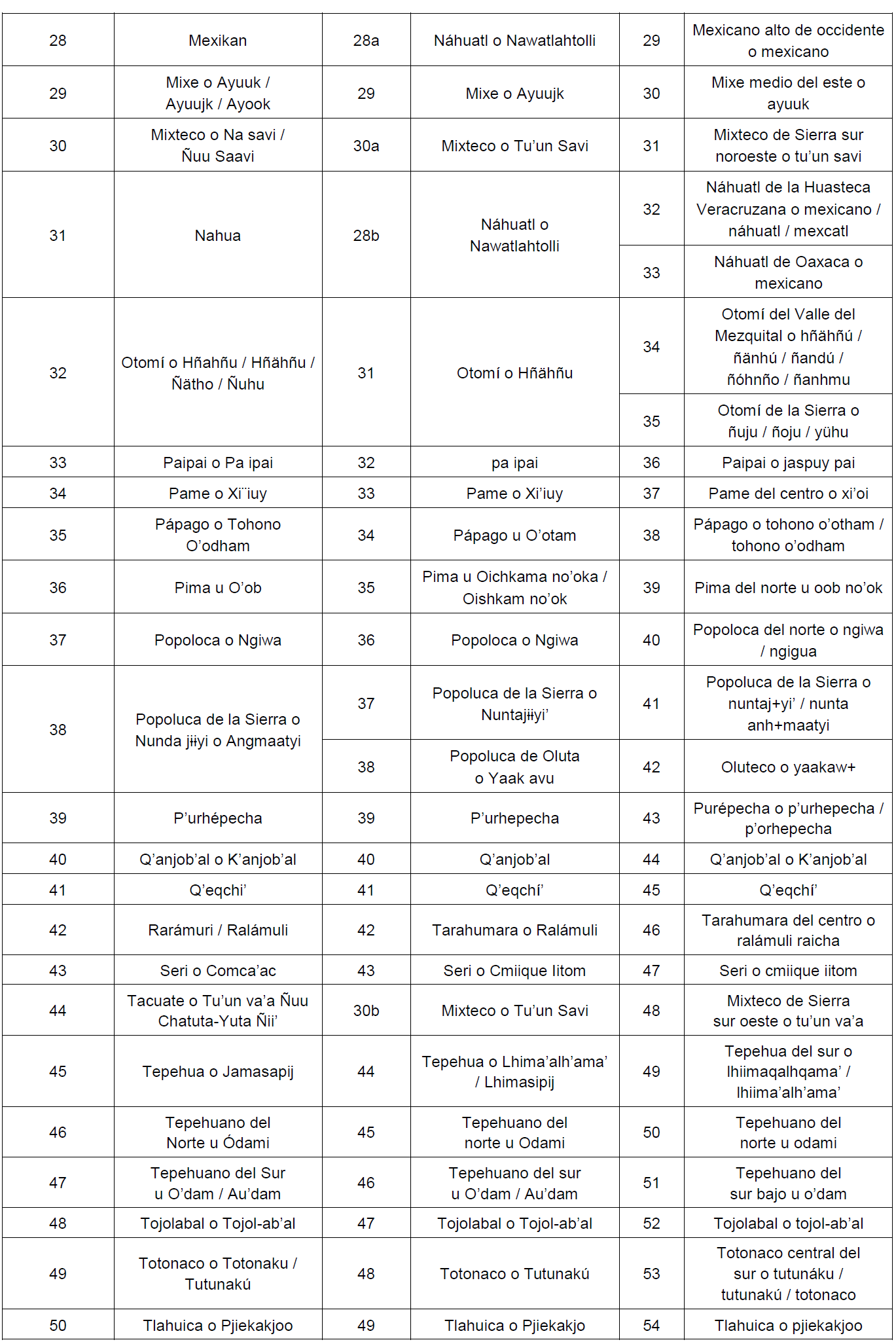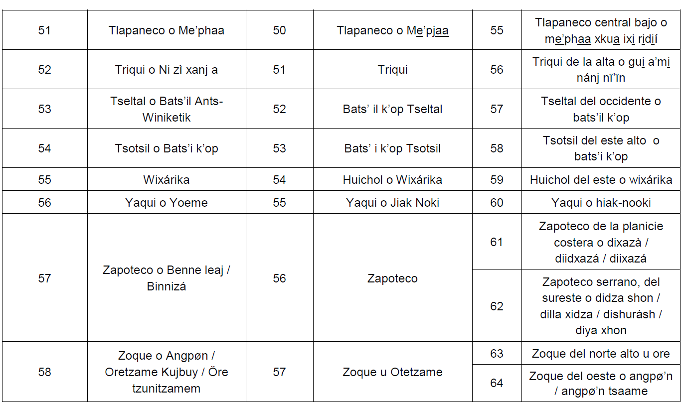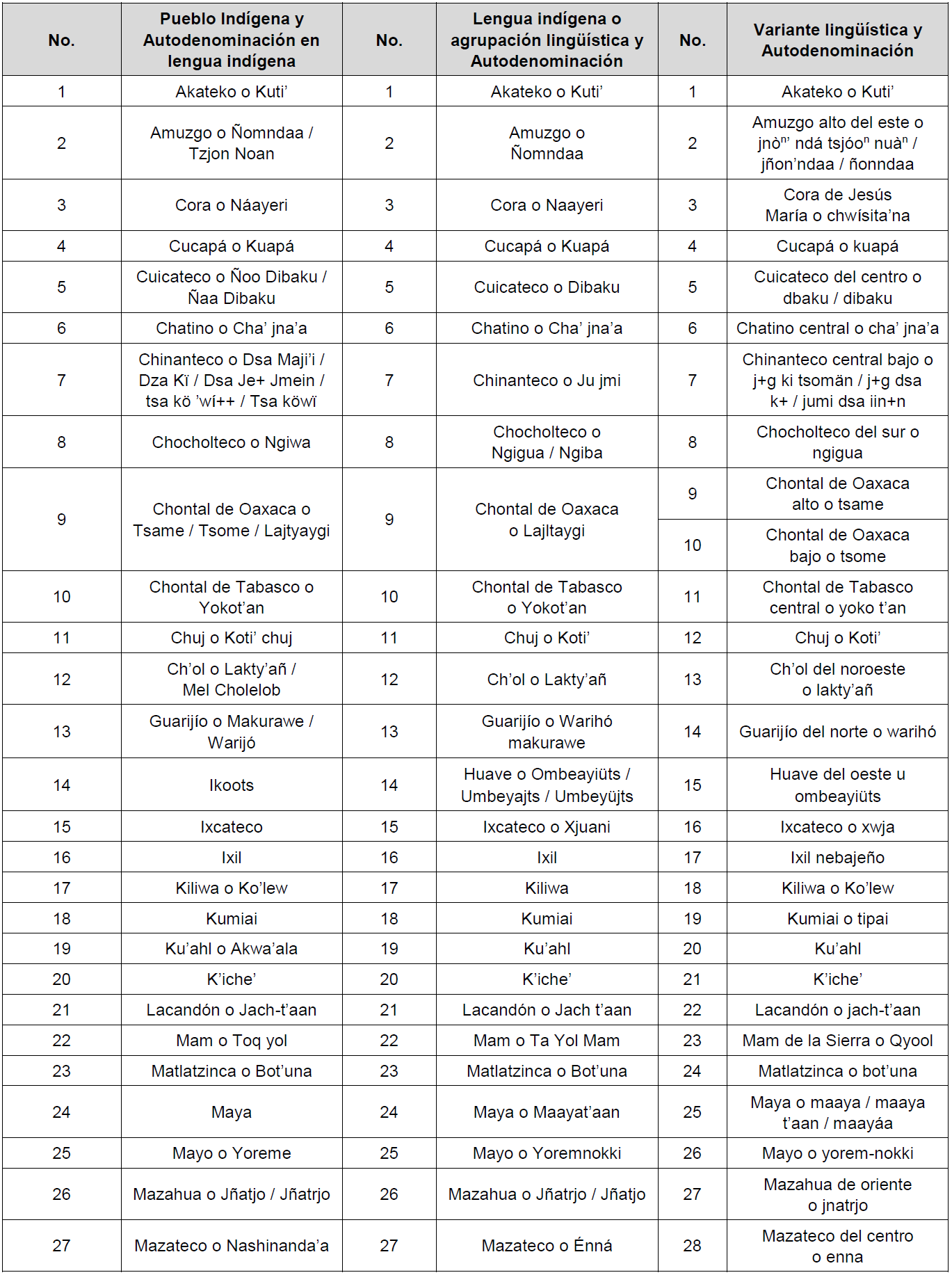 Que en el Catálogo de las Lenguas Indígenas Nacionales: Variantes Lingüísticas de México con sus autodenominaciones y referencias geoestadísticas, publicado en el Diario Oficial de la Federación (DOF) el 14 de enero de 2008, fueron señaladas: a) 11 familias lingüística indoamericanas que tienen presencia en México con al menos una de las lenguas que las integran; b) 68 agrupaciones ling√ísticas correspondientes a dichas familias, y c) 364 variantes lingüísticas pertenecientes a este conjunto de agrupaciones; asimismo, que el Instituto Nacional de Lenguas Indígenas ha identificado las autodenominaciones de 32 lenguas en riesgo y de 37 lenguas amenazadas en el documento Lenguas Indígenas Nacionales y sus autodenominaciones. Clasificación 37/32;