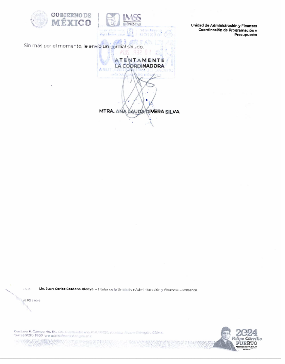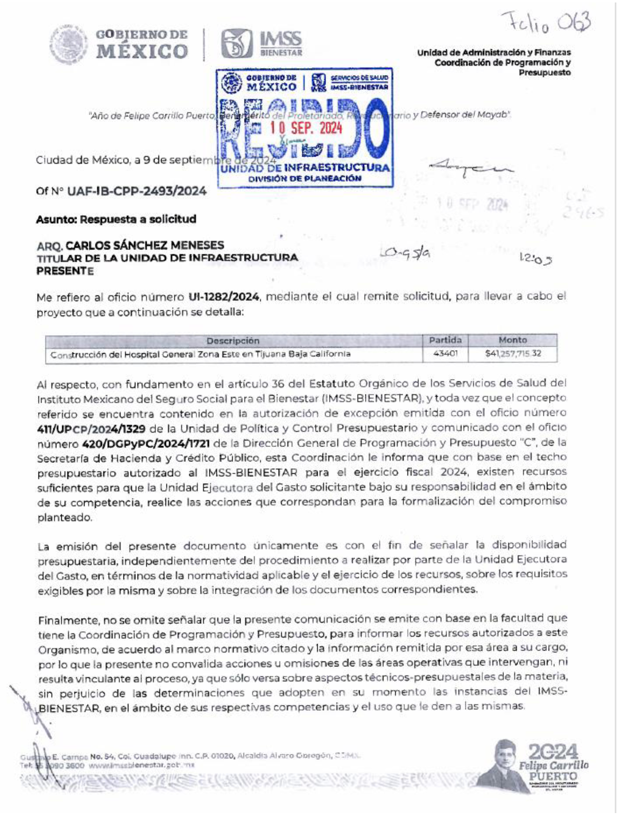 10. Por medio del oficio número UAF-IB-CPP-2493/2024, de fecha 09 de septiembre del 2024, la Coordinación de Programación y Presupuesto del "IMSS-BIENESTAR" notificó la reserva de recursos hasta por la cantidad de $41,257,715.35 (CUARENTA Y UN MILLONES DOSCIENTOS CINCUENTA Y SIETE MIL SETECIENTOS QUINCE PESOS 35/100 M.N.), con cargo al programa Presupuestario U013 "Atención a la Salud y Medicamentos Gratuitos para la Población sin Seguridad Social Laboral", oficio que se agrega como ANEXO 1.