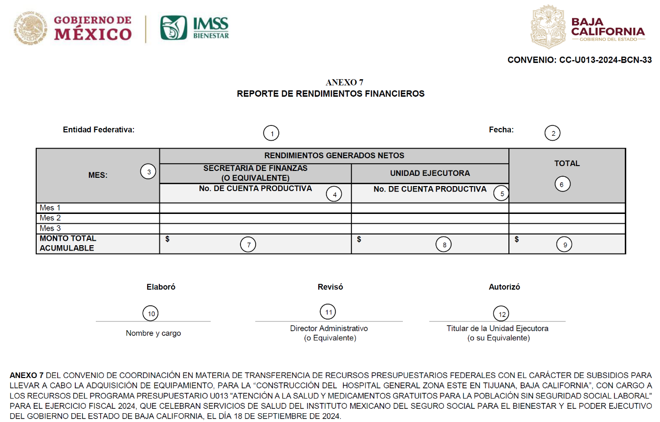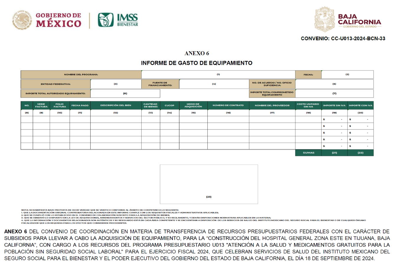 FIRMAS DE LOS ANEXOS 1, 2, 3, 4, 5, 6 Y 7 DEL CONVENIO DE COORDINACIÓN EN MATERIA DE TRANSFERENCIA DE RECURSOS PRESUPUESTARIOS FEDERALES CON EL CARÁCTER DE SUBSIDIOS PARA LLEVAR A CABO LA ADQUISICIÓN DE EQUIPAMIENTO, PARA LA "CONSTRUCCIÓN DEL HOSPITAL GENERAL ZONA ESTE EN TIJUANA, BAJA CALIFORNIA", CON CARGO A LOS RECURSOS DEL PROGRAMA PRESUPUESTARIO U013 "ATENCIÓN A LA SALUD Y MEDICAMENTOS GRATUITOS PARA LA POBLACIÓN SIN SEGURIDAD SOCIAL LABORAL" PARA EL EJERCICIO FISCAL 2024, QUE CELEBRAN SERVICIOS DE SALUD DEL INSTITUTO MEXICANO DEL SEGURO SOCIAL PARA EL BIENESTAR Y EL PODER EJECUTIVO DEL GOBIERNO DEL ESTADO DE BAJA CALIFORNIA, EL DÍA 18 DE SEPTIEMBRE DE 2024.