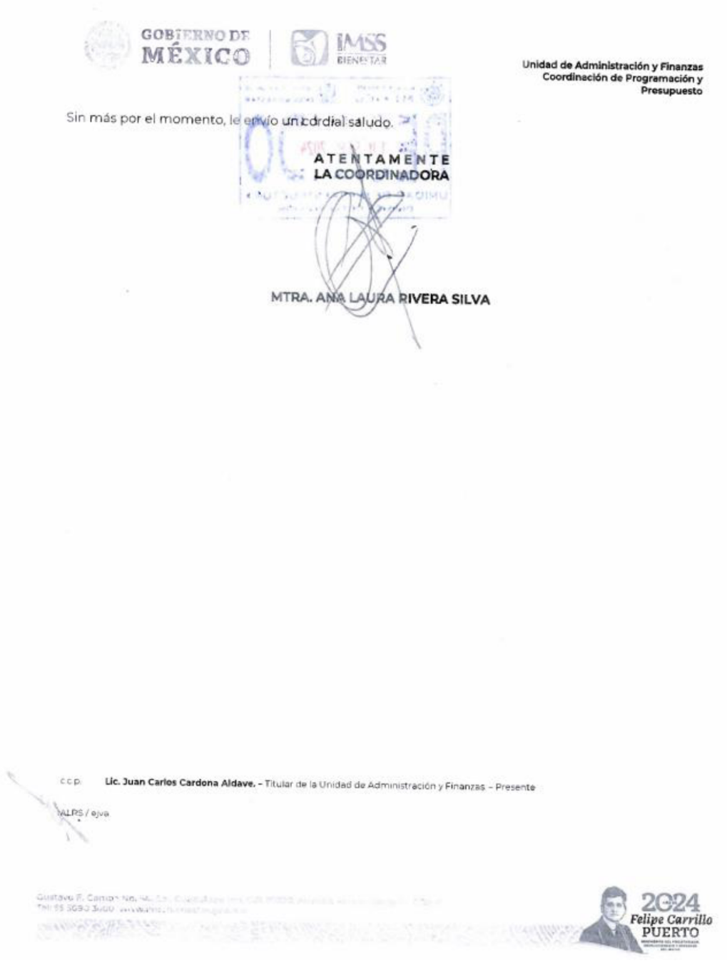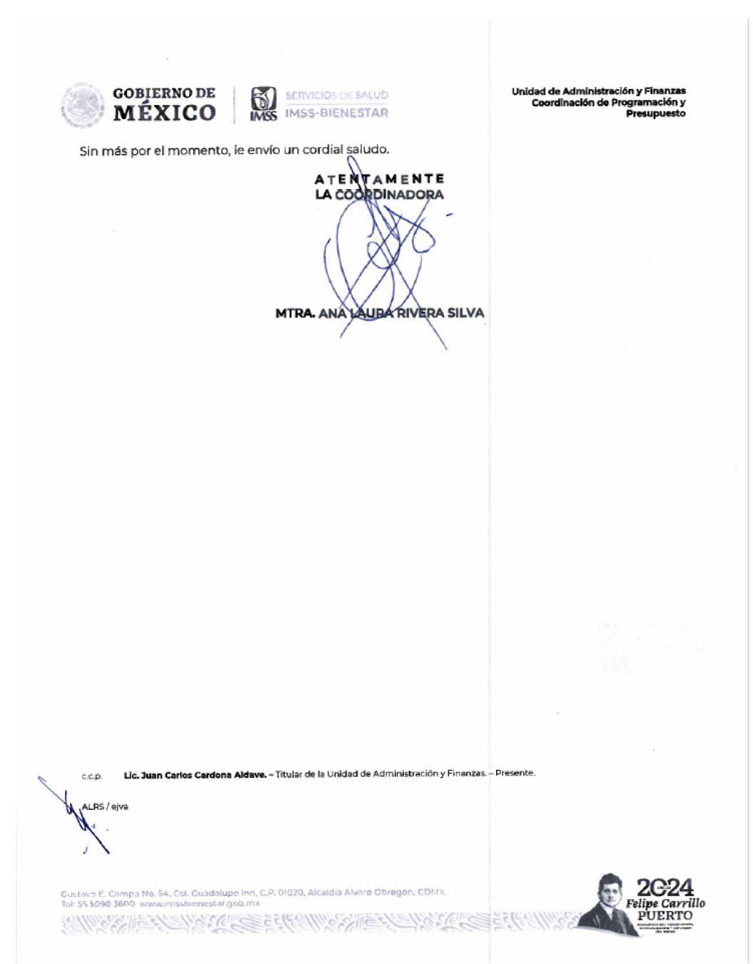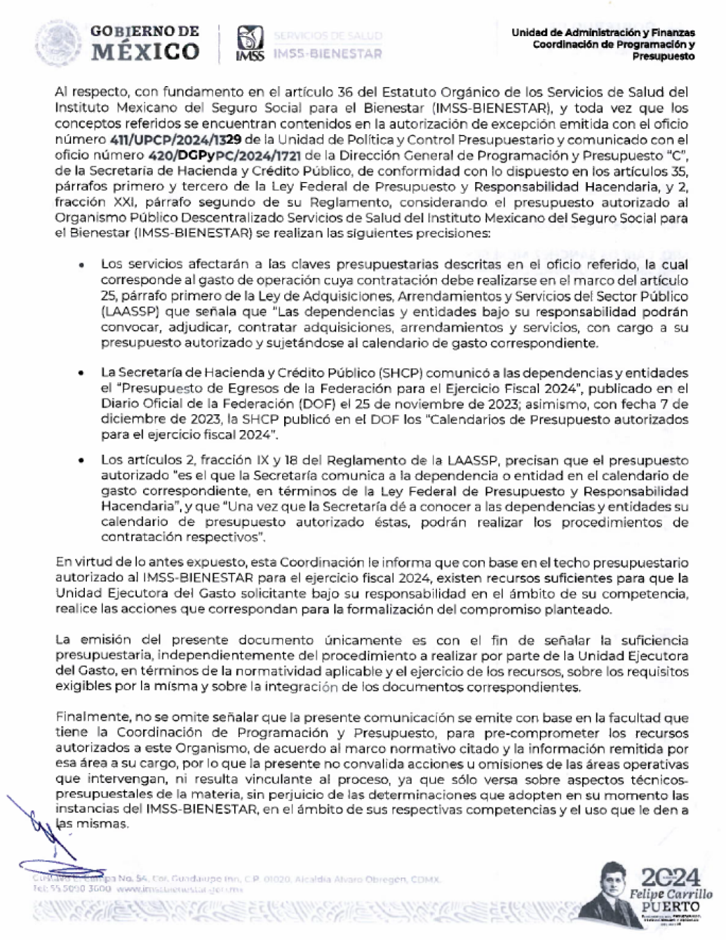 4. A través del oficio número UI-1281/2024, de fecha 6 de septiembre de 2024, el Titular de la Unidad de Infraestructura del "IMSS-BIENESTAR", solicitó a la Coordinación de Programación y Presupuesto del "IMSS-BIENESTAR", se indicara si se cuenta con disponibilidad presupuestaria en la partida de gasto 43401 "Subsidios a la prestación de servicios públicos", del Programa Presupuestario U013 Programa de Atención a la Salud y Medicamentos Gratuitos para la Población sin Seguridad Social Laboral, para la entidad federativa de Baja California.