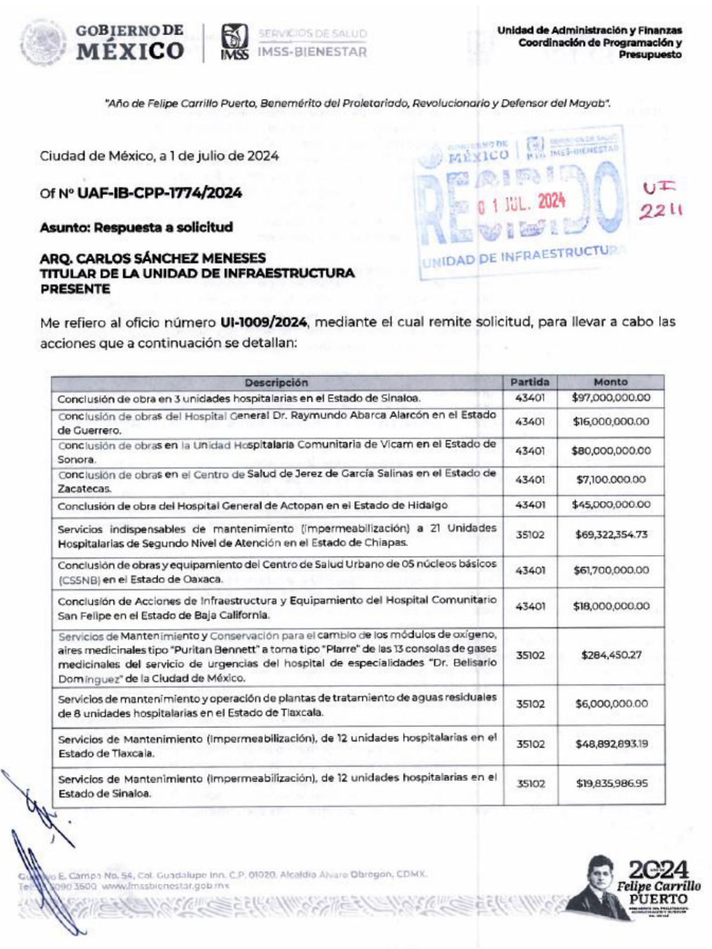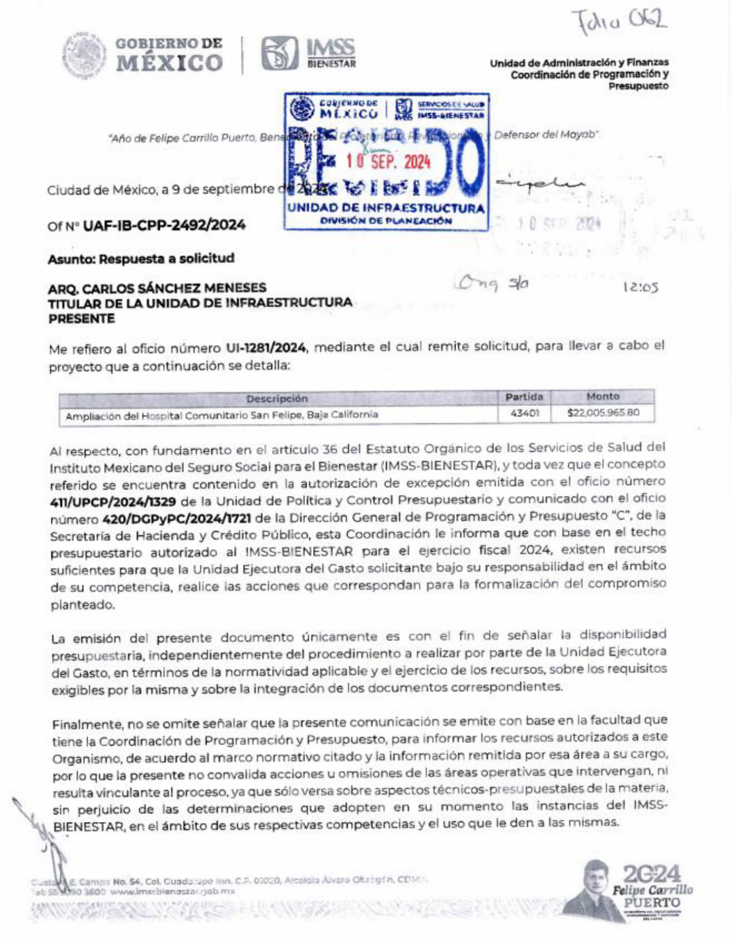 5. Por medio del oficio número UAF-IB-CPP-2492/2024, de fecha 9 de septiembre de 2024, la Coordinación de Programación y Presupuesto del "IMSS-BIENESTAR" notificó la reserva de recursos hasta por la cantidad de $22,005,965.80 (VEINTIDÓS MILLONES CINCO MIL NOVECIENTOS SESENTA Y CINCO PESOS 80/100 M.N.), para la "AMPLIACIÓN DEL HOSPITAL COMUNITARIO SAN FELIPE, BAJA CALIFORNIA", con cargo al programa Presupuestario U013 "Atención a la Salud y Medicamentos Gratuitos para la Población sin Seguridad Social Laboral", para el Ejercicio Fiscal 2024.