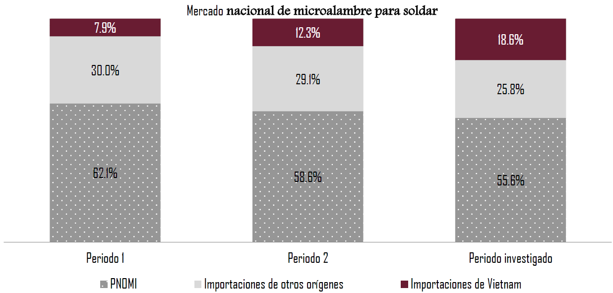 c. la rama de producción nacional compite en el mercado mexicano, entre otros, con las importaciones de las también productoras de microalambre para soldar, Lincoln Electric y ESAB México, quienes son las principales importadoras del producto objeto de investigación en el periodo investigado -23% y 11%, respectivamente-. Lo anterior resulta relevante al considerar que esas empresas aumentaron sus importaciones 88% en el periodo investigado, impulsadas por una subvaloración de 37% en los precios a los que adquirieron el microalambre de Vietnam, respecto del precio de la rama de producción nacional;