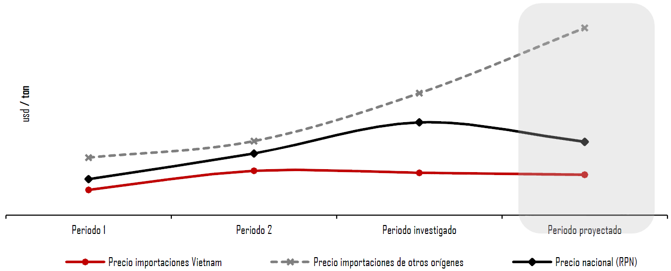 g. El bajo nivel de precios al que concurren las importaciones investigadas constituye un factor determinante que incentivará su incremento y participación en el mercado nacional. De hecho, de continuar el ingreso de dichas importaciones en tales niveles de precios, las Solicitantes no podrían trasladar a sus precios de venta al mercado interno el incremento esperado en sus costos, pues tendrían que reducir sus precios 13% en el periodo proyectado.