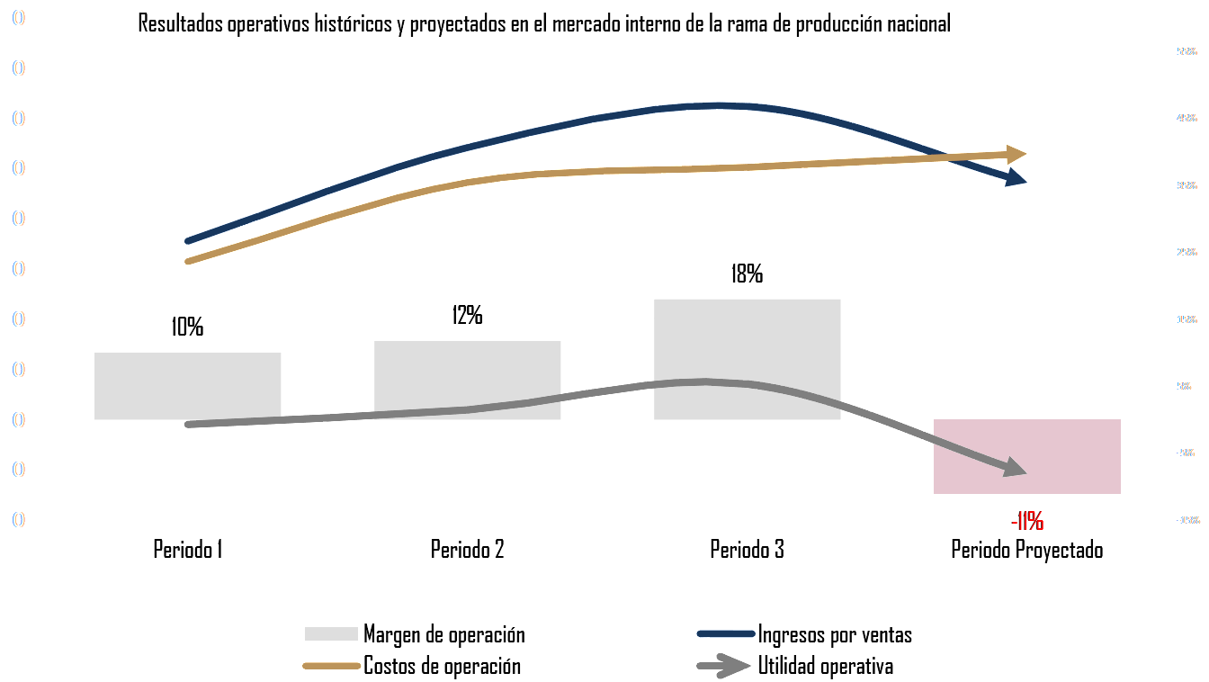 313. Adicionalmente, como resultado del comportamiento en los ingresos proyectados por ventas y de los costos operativos para el periodo proyectado, se observaría una disminución en los ingresos de 22% y aumento de costos totales de 5%; los resultados operativos en el mercado nacional disminuirían 1.47 veces respecto del periodo investigado, al grado que reflejarían una pérdida operativa, disminuyendo el margen de operación 29 puntos porcentuales, al pasar de 18% en el periodo investigado a 11% negativo en el periodo proyectado.