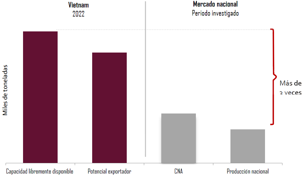b. el potencial exportador de Vietnam -capacidad instalada menos consumo- creció 168% de 2020 a 2022, al pasar de 49 a 130 mil toneladas; este último volumen fue equivalente a más de 2 veces el tamaño del CNA y más de 3 veces el tamaño de la producción del periodo investigado.