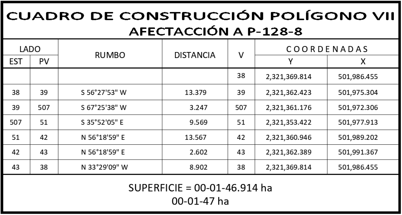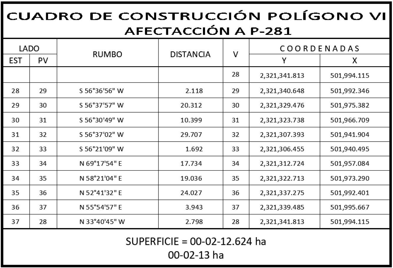 22. Que el comisionado técnico del RAN y el comisionado agrario de la Sedatu rindieron el "informe de comisión de Trabajos Técnicos e Informativos de Expropiación", de 28 de febrero de 2024, en el que señalan que la superficie real a expropiar al ejido "Tixpéhual", municipio de Tixpéhual, estado de Yucatán es de 00-48-07 ha, de las cuales 00-00-12 ha son de uso común y 00-47-95 ha son de uso parcelado, que se describen en los siguientes planos y cuadros de construcción: