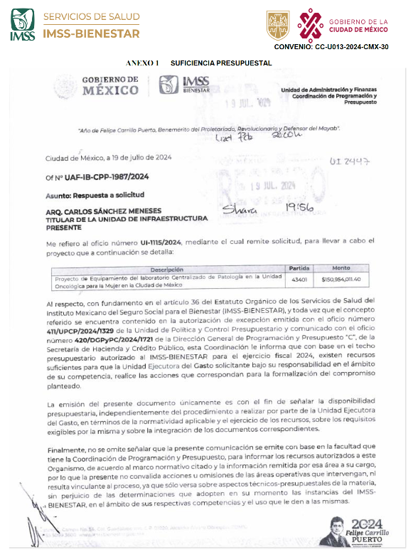 10 Por medio del oficio número UAF-IB-CPP-1987/2024, de fecha 19 de julio del 2024, la Coordinación de Programación y Presupuesto del "IMSS-BIENESTAR" notificó la reserva de recursos hasta por la cantidad de $150,594,011.40 (CIENTO CINCUENTA MILLONES QUINIENTOS NOVENTA Y CUATRO MIL ONCE PESOS 40/100 M.N.), con cargo al Programa Presupuestario U013 "Atención a la Salud y Medicamentos gratuitos para la población sin Seguridad Social Laboral", para el Ejercicio Fiscal 2024, oficio que se agrega como Anexo 1.