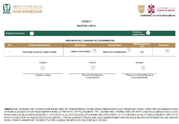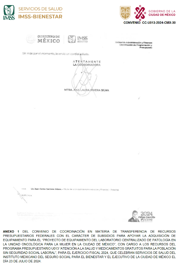 FIRMAS DE LOS ANEXOS 1, 2, 3, 4, 5, 6 y 7 DEL CONVENIO DE COORDINACIÓN EN MATERIA DE TRANSFERENCIA DE RECURSOS PRESUPUESTARIOS FEDERALES CON EL CARÁCTER DE SUBSIDIOS PARA APOYAR LA ADQUISICIÓN DE EQUIPAMIENTO PARA LA "PROYECTO DE EQUIPAMIENTO DEL LABORATORIO CENTRALIZADO DE PATOLOGÍA EN LA UNIDAD ONCOLÓGICA PARA LA MUJER EN LA CIUDAD DE MÉXICO", CON CARGO A LOS RECURSOS DEL PROGRAMA PRESUPUESTARIO U013 "ATENCIÓN A LA SALUD Y MEDICAMENTOS GRATUITOS PARA LA POBLACIÓN SIN SEGURIDAD SOCIAL LABORAL", PARA EL EJERCICIO FISCAL 2024, QUE CELEBRAN SERVICIOS DE SALUD DEL INSTITUTO MEXICANO DEL SEGURO SOCIAL PARA EL BIENESTAR Y EL EJECUTIVO DE LA CIUDAD DE MÉXICO EL DÍA 23 DE JULIO DE 2024.
