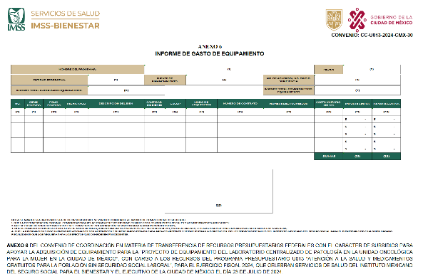ANEXO 4 DEL CONVENIO DE COORDINACIÓN EN MATERIA DE TRANSFERENCIA DE RECURSOS PRESUPUESTARIOS FEDERALES CON EL CARÁCTER DE SUBSIDIOS PARA APOYAR LA ADQUISICIÓN DE EQUIPAMIENTO PARA LA "PROYECTO DE EQUIPAMIENTO DEL LABORATORIO CENTRALIZADO DE PATOLOGÍA EN LA UNIDAD ONCOLÓGICA PARA LA MUJER EN LA CIUDAD DE MÉXICO", CON CARGO A LOS RECURSOS DEL PROGRAMA PRESUPUESTARIO U013 "ATENCIÓN A LA SALUD Y MEDICAMENTOS GRATUITOS PARA LA POBLACIÓN SIN SEGURIDAD SOCIAL LABORAL", PARA EL EJERCICIO FISCAL 2024, QUE CELEBRAN SERVICIOS DE SALUD DEL INSTITUTO MEXICANO DEL SEGURO SOCIAL PARA EL BIENESTAR Y EL EJECUTIVO DE LA CIUDAD DE MÉXICO EL DÍA 23 DE JULIO DE 2024.
