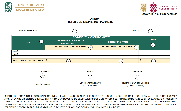 "EL GOBIERNO DE LA CIUDAD DE MÉXICO" presentará al cierre del ejercicio fiscal, a través de la Unidad Ejecutora, un reporte de los rendimientos financieros que generen los recursos presupuestarios federales transferidos en virtud del presente instrumento jurídico, desglosado por mes, conforme al Anexo 7 de este Convenio de Coordinación.