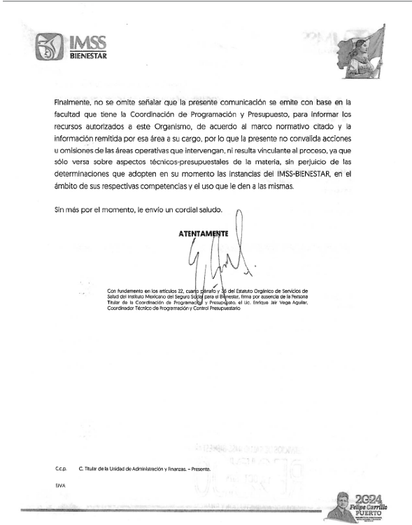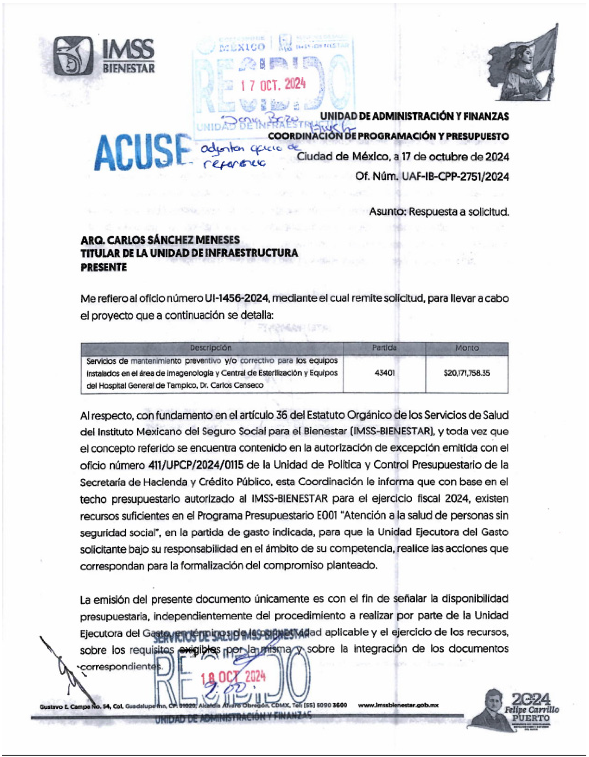 11. Por oficio número UI-1456/2024, de fecha 16 de octubre del 2024, se solicitó a la Unidad de Administración y Finanzas del "IMSS-BIENESTAR", autorización de excepción de fechas límite y formato de suficiencia presupuestal para el mantenimiento de equipos.