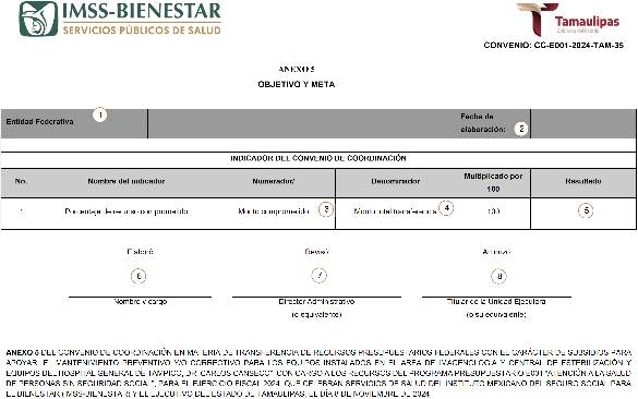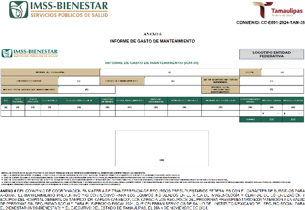 ANEXO 2 DEL CONVENIO DE COORDINACIÓN EN MATERIA DE TRANSFERENCIA DE RECURSOS PRESUPUESTARIOS FEDERALES CON EL CARÁCTER DE SUBSIDIOS PARA APOYAR "EL MANTENIMIENTO PREVENTIVO Y/O CORRECTIVO PARA LOS EQUIPOS INSTALADOS EN EL ÁREA DE IMAGENOLOGÍA Y CENTRAL DE ESTERILIZACIÓN Y EQUIPOS DEL HOSPITAL GENERAL DE TAMPICO, DR. CARLOS CANSECO", CON CARGO A LOS RECURSOS DEL PROGRAMA PRESUPUESTARIO E001 "ATENCIÓN A LA SALUD DE PERSONAS SIN SEGURIDAD SOCIAL", PARA EL EJERCICIO FISCAL 2024, QUE CELEBRAN SERVICIOS DE SALUD DEL INSTITUTO MEXICANO DEL SEGURO SOCIAL PARA EL BIENESTAR (IMSS-BIENESTAR) Y EL EJECUTIVO DEL ESTADO DE TAMAULIPAS EL DÍA 8 DE NOVIEMBRE DE 2024.